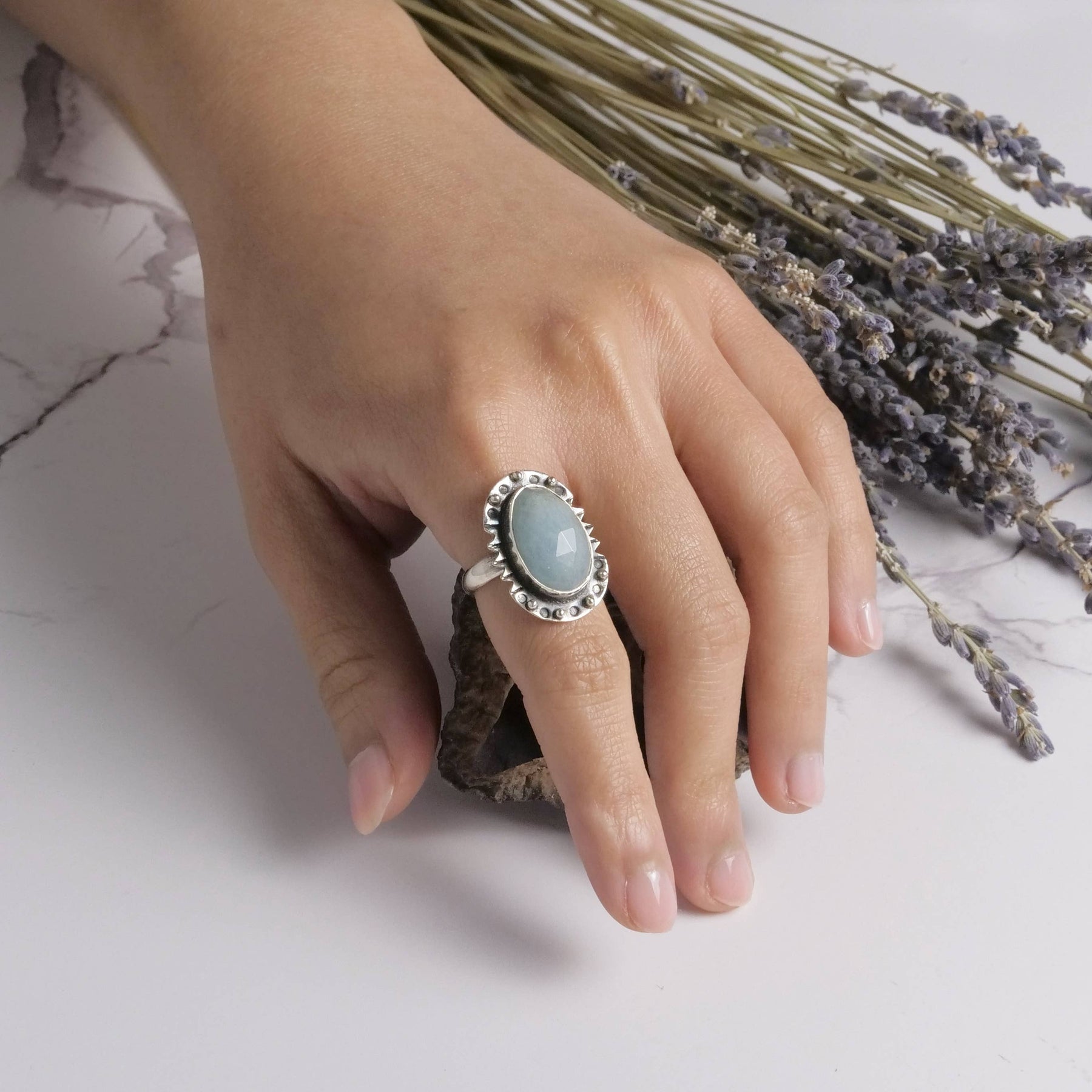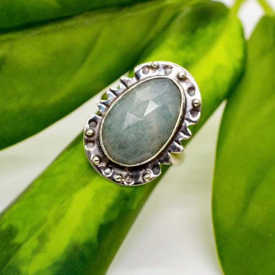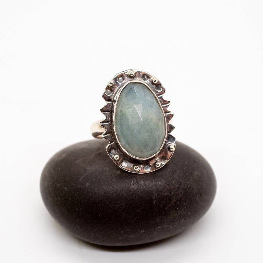 Sterling Silver ring with oxidized detail and faceted aquamarine stone available in sizes 6-10.