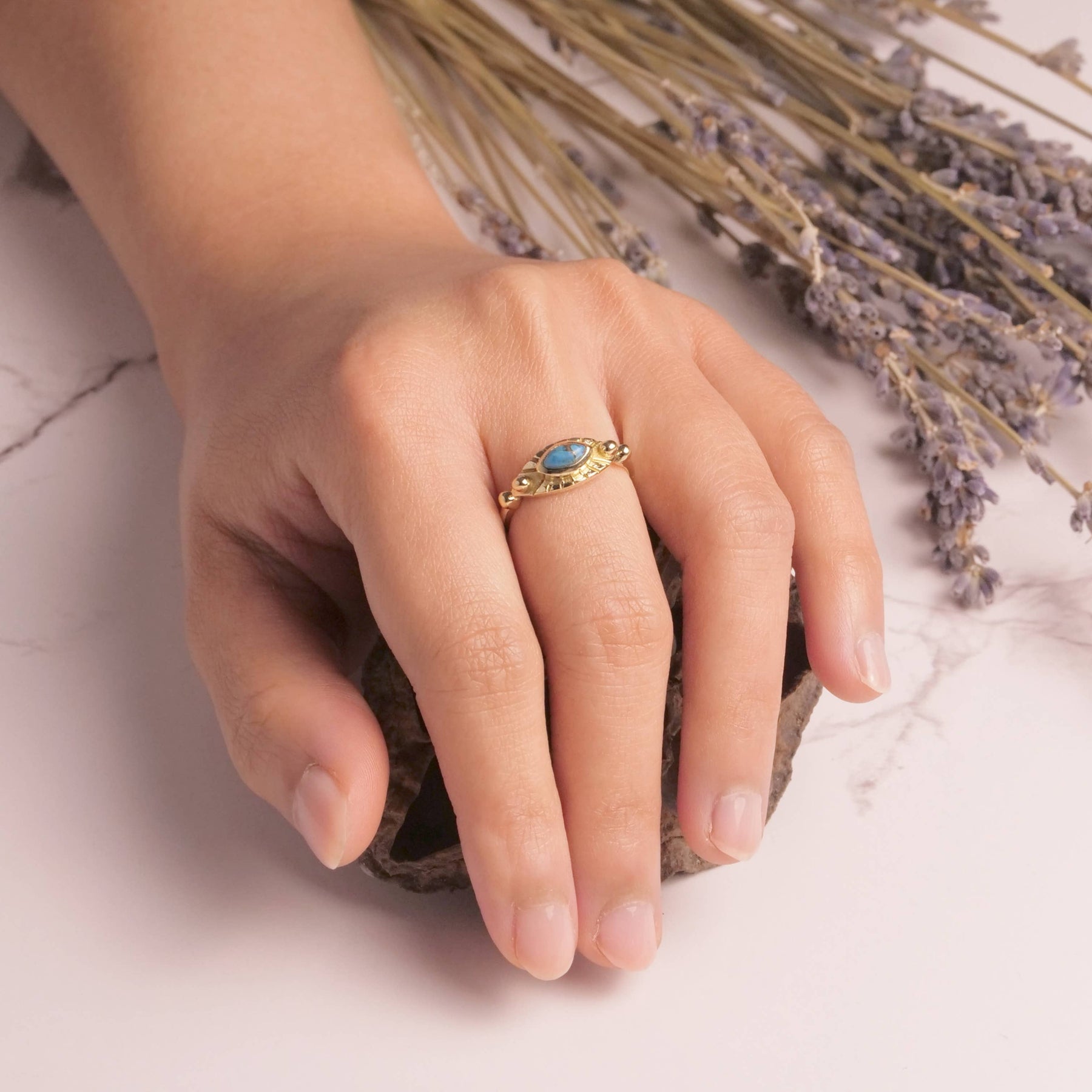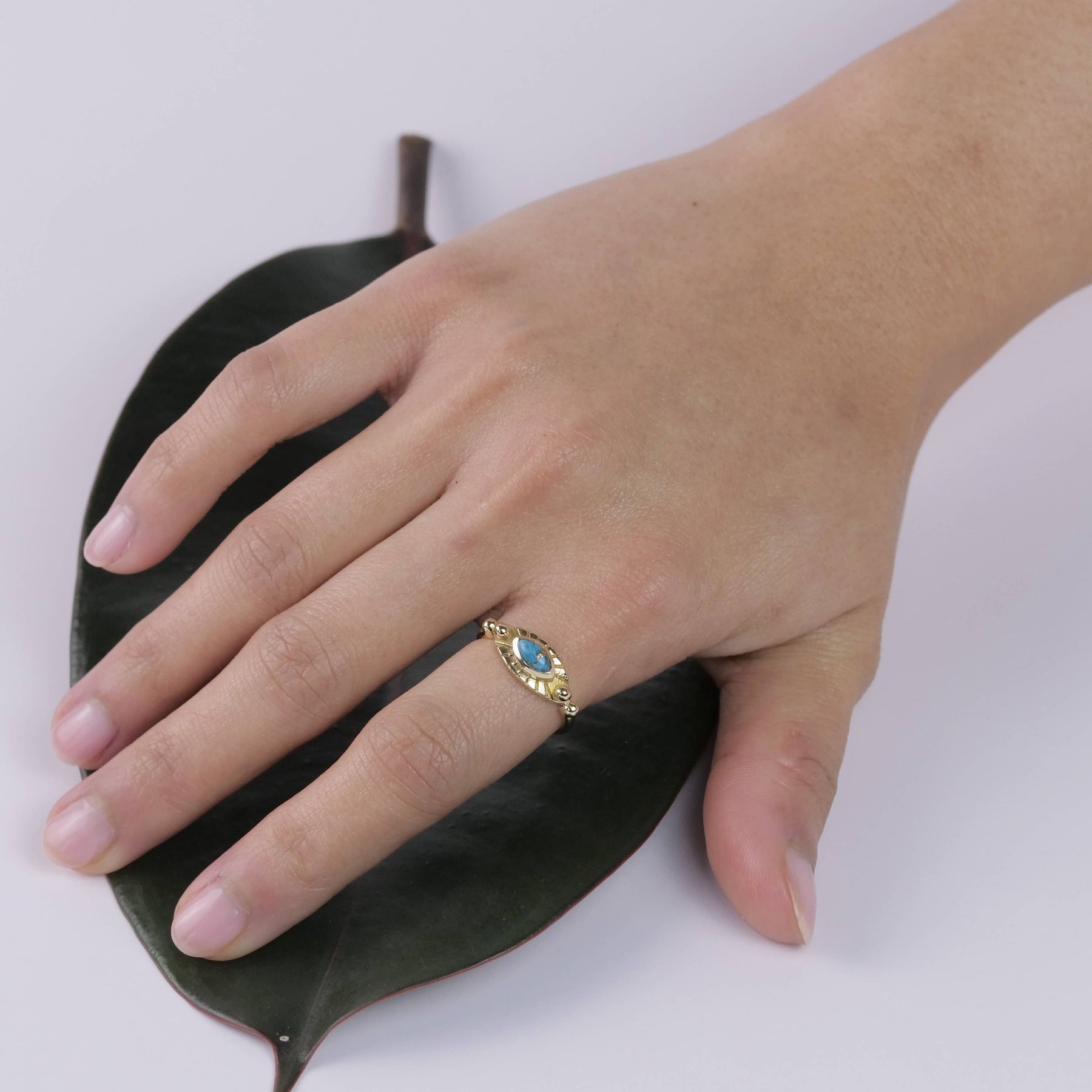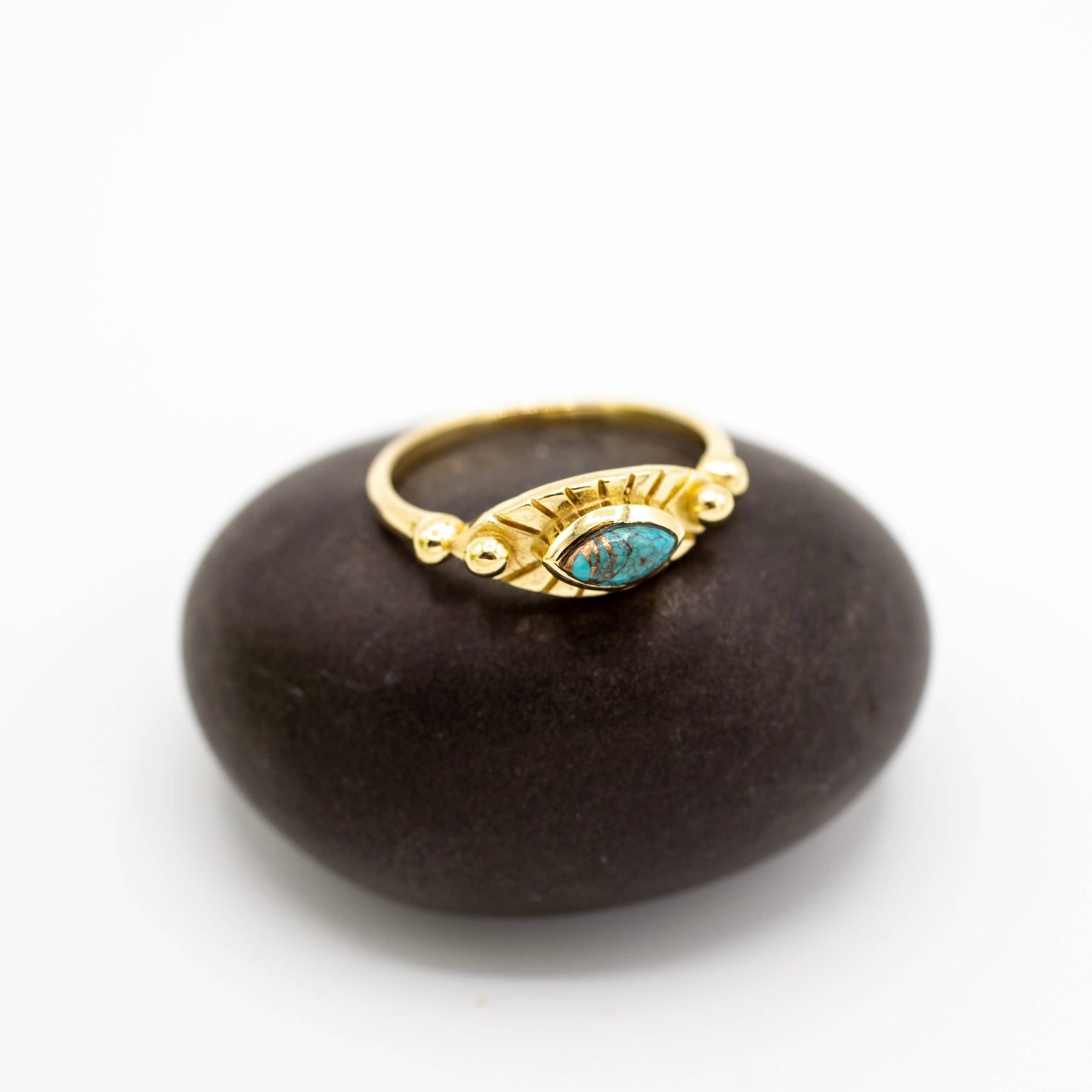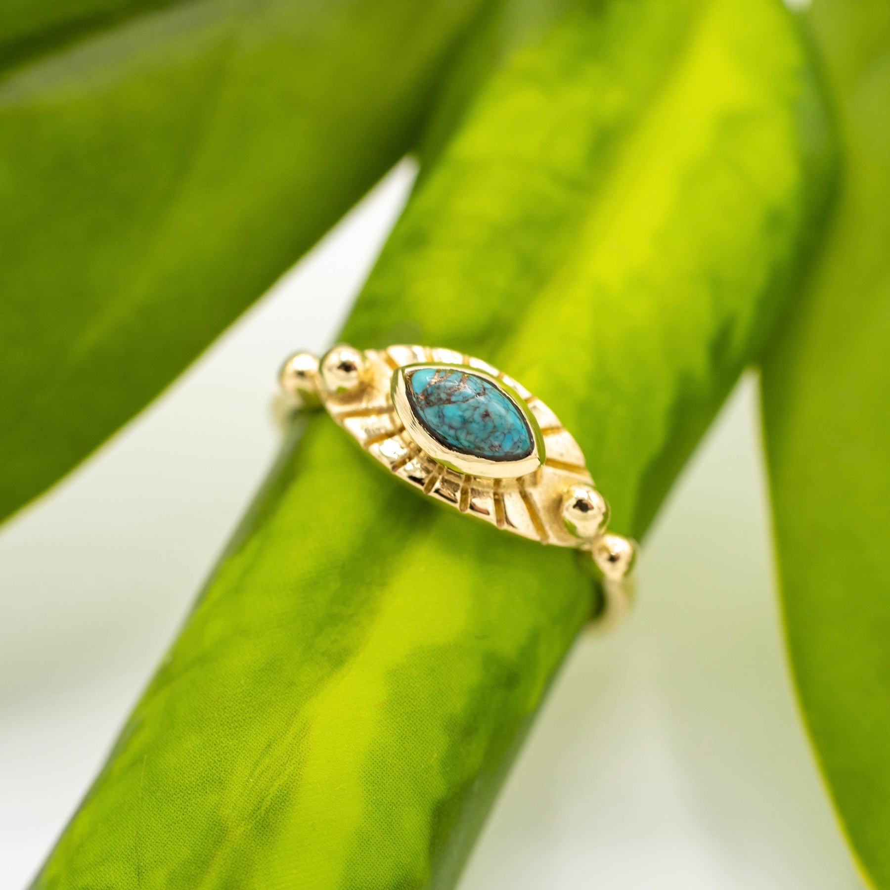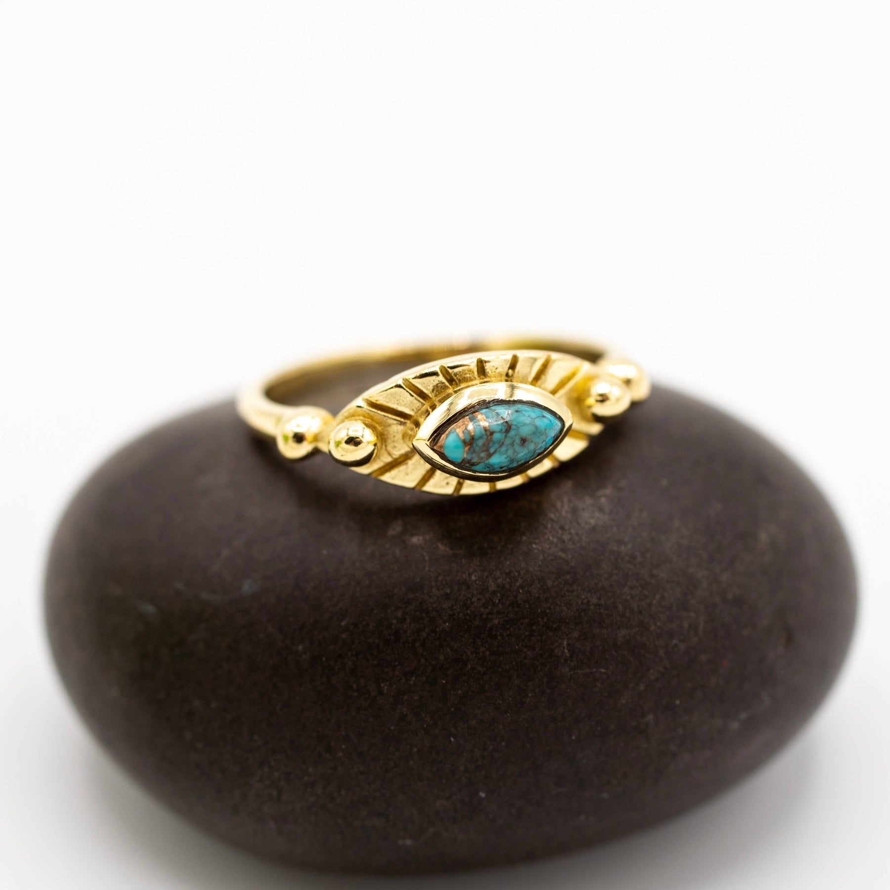 Brass copper-turquoise ray ring, available in sizes 5-10.