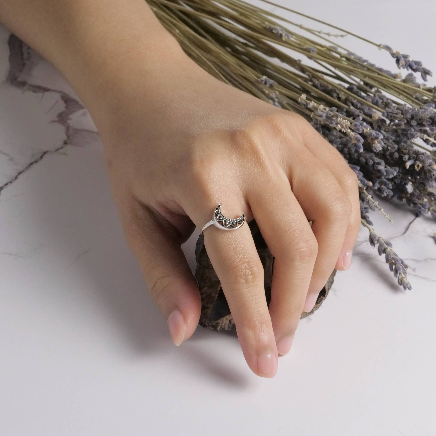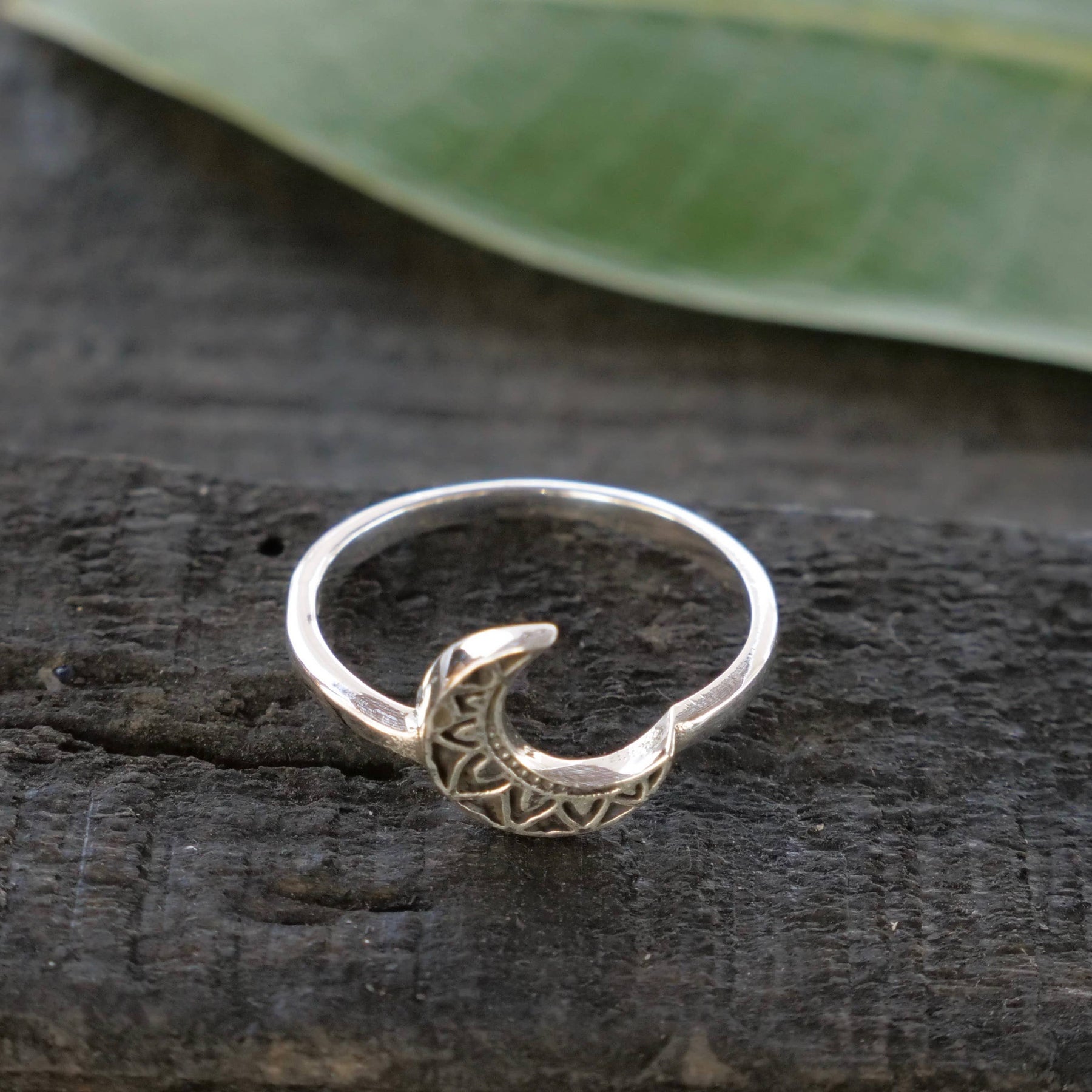 Sterling silver decorated moon ring.
