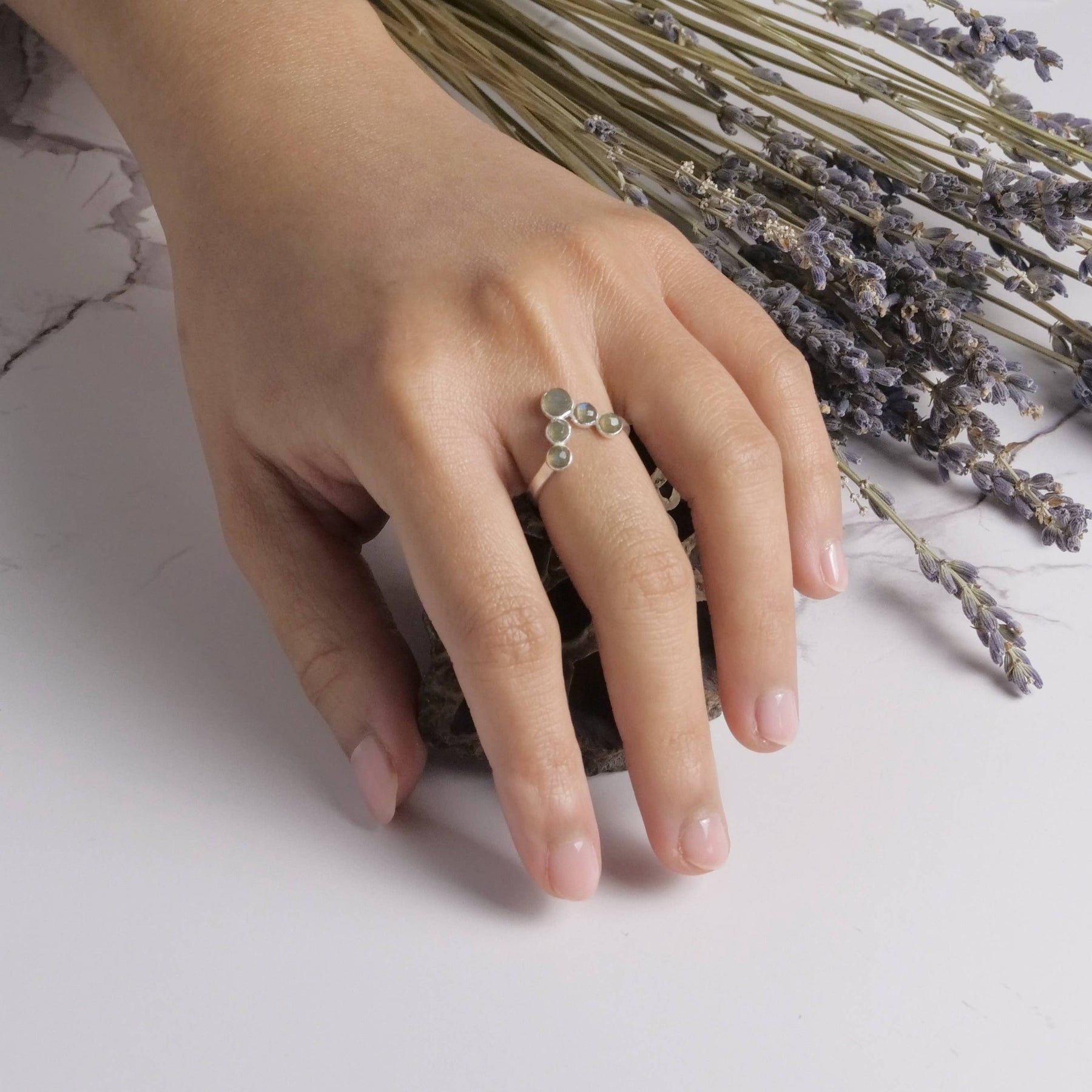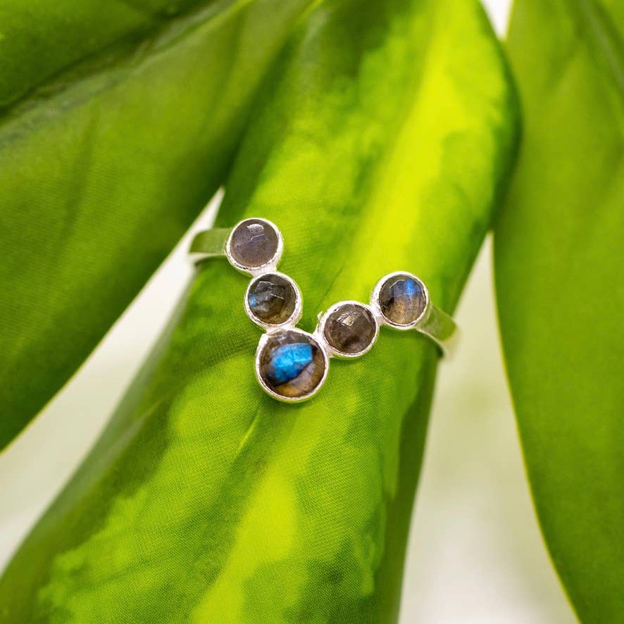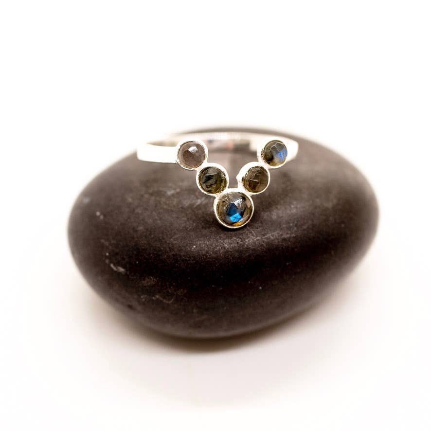 Sterling Silver ring with V design of faceted labradorite stones. Available in sizes 5-9.
