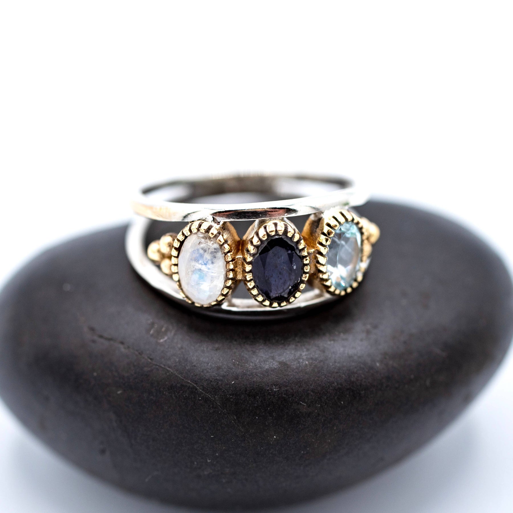 Sterling silver ring featuring faceted Moonstone, Iolite and Blue Topaz gemstones with brass prong setting and detail work.