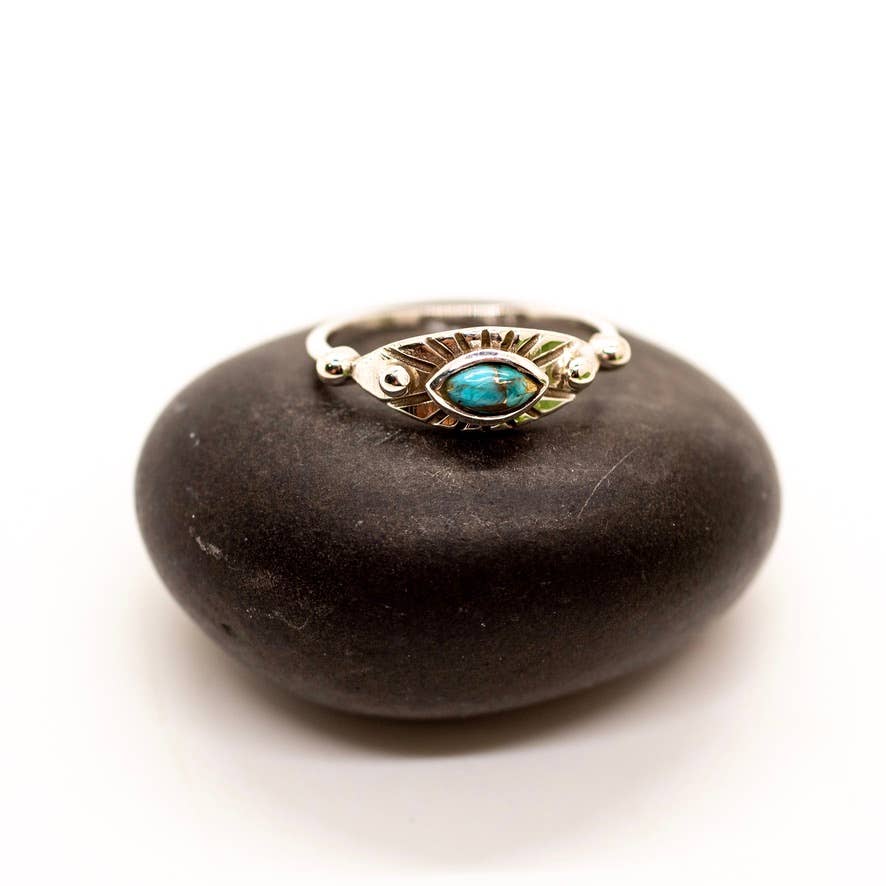 Sterling Silver ring with oxidized eye design and Turquoise stone, available in sizes 5-9.