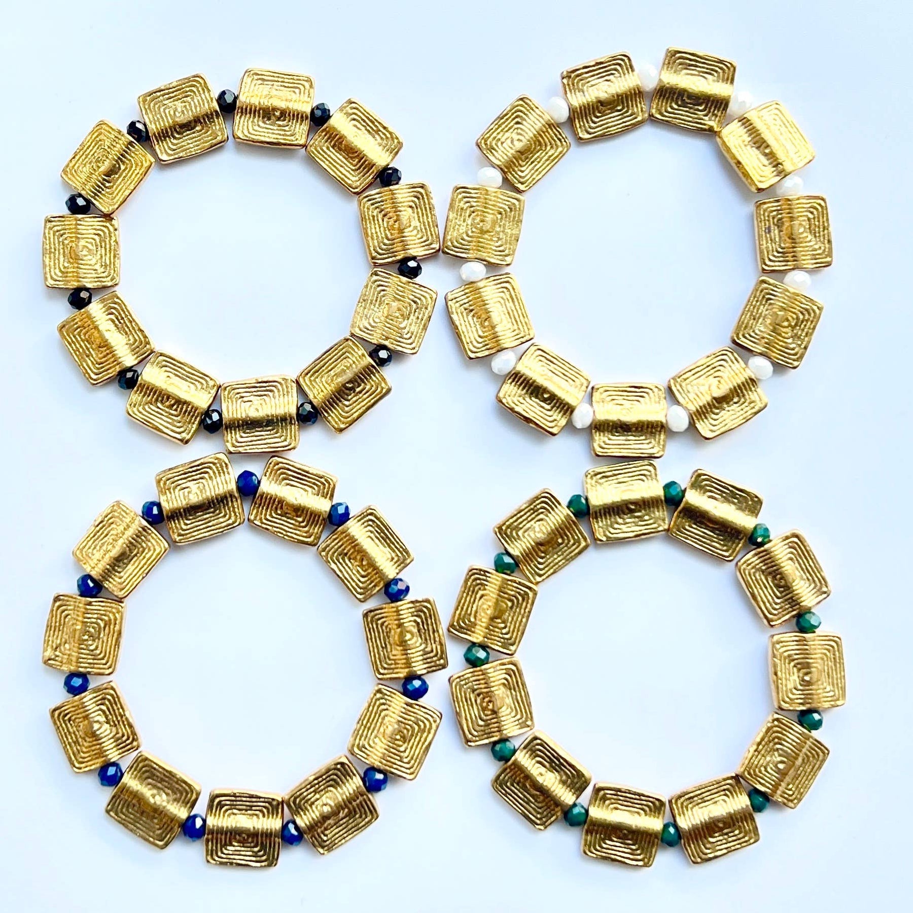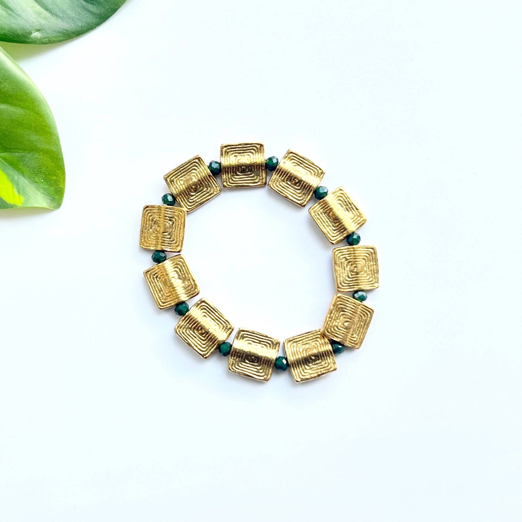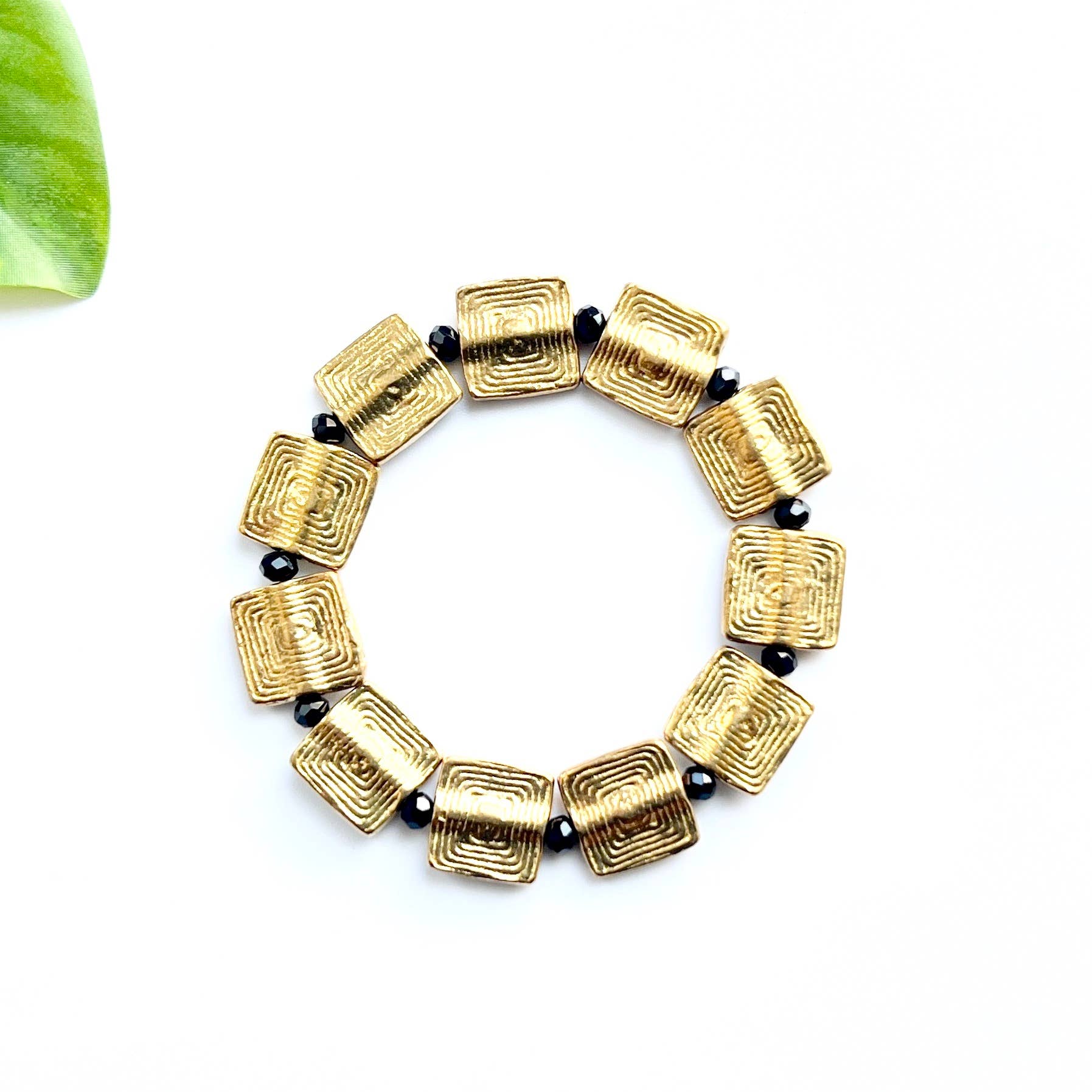 Elastic bracelet with etched brass square beads and cut glass beads. Pearl color, black, blue, or green.