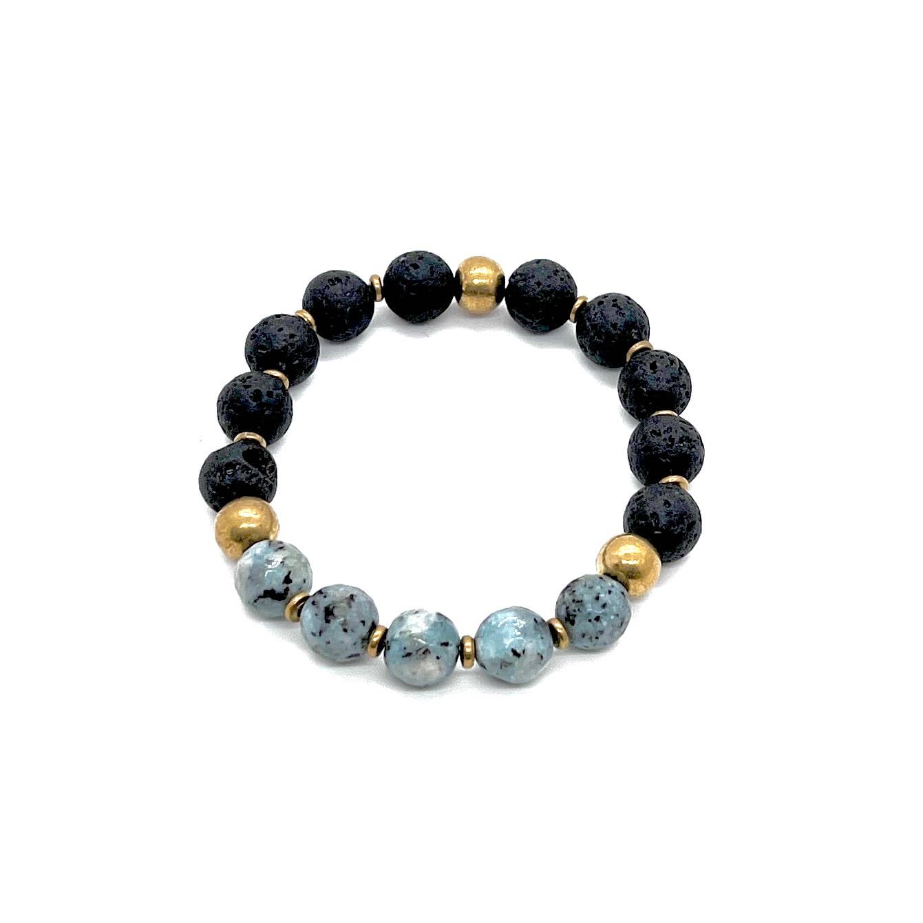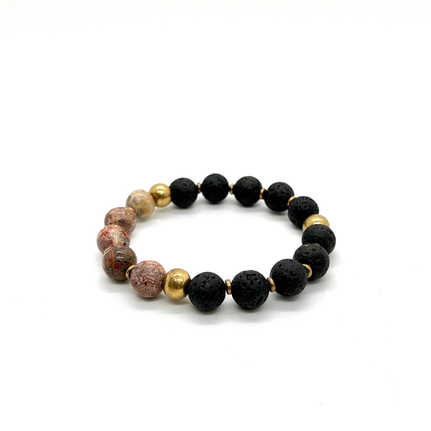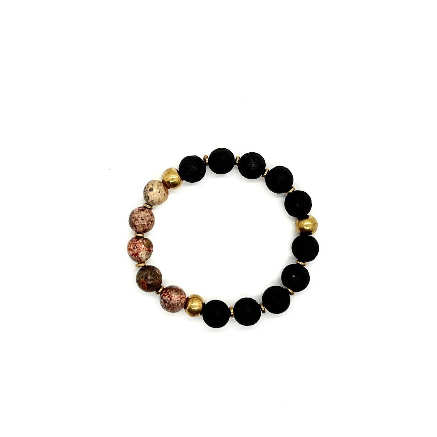Lava and African turquoise or Red Jasper beaded elastic bracelet with brass accent beads.