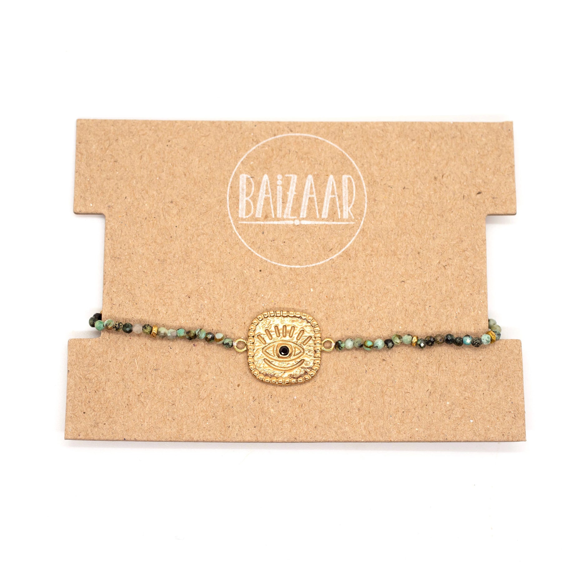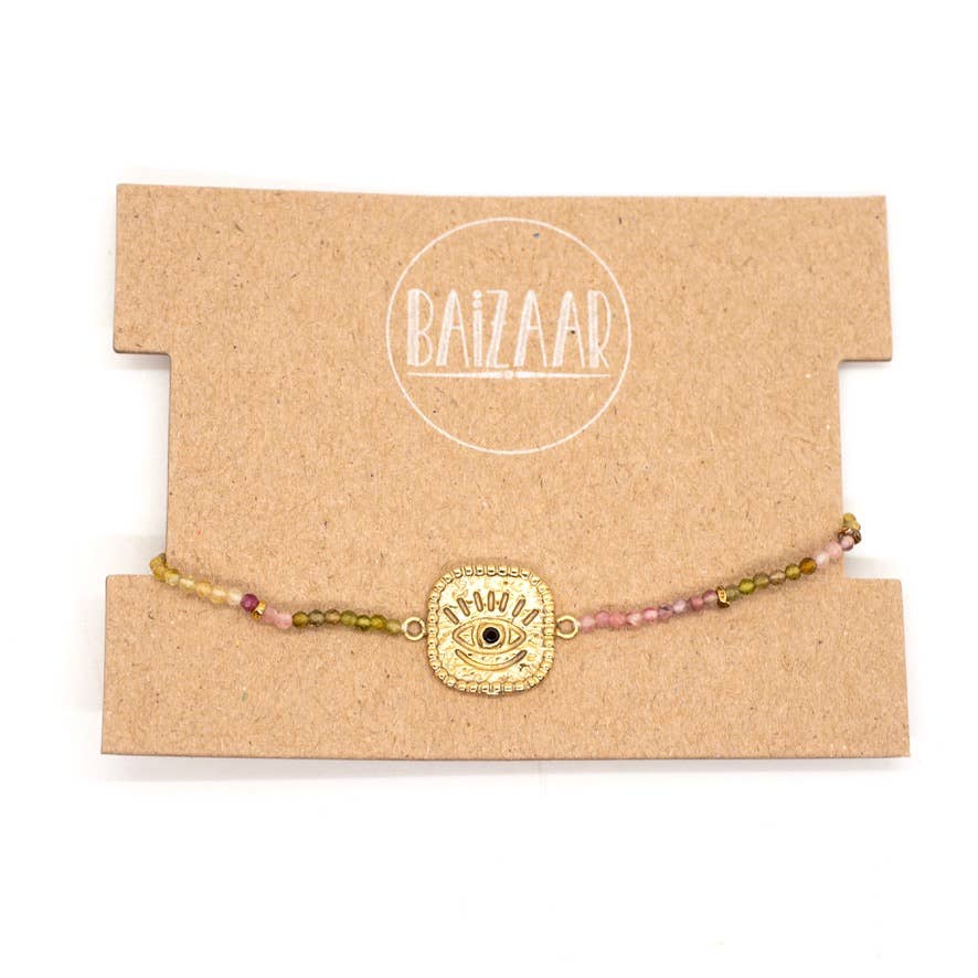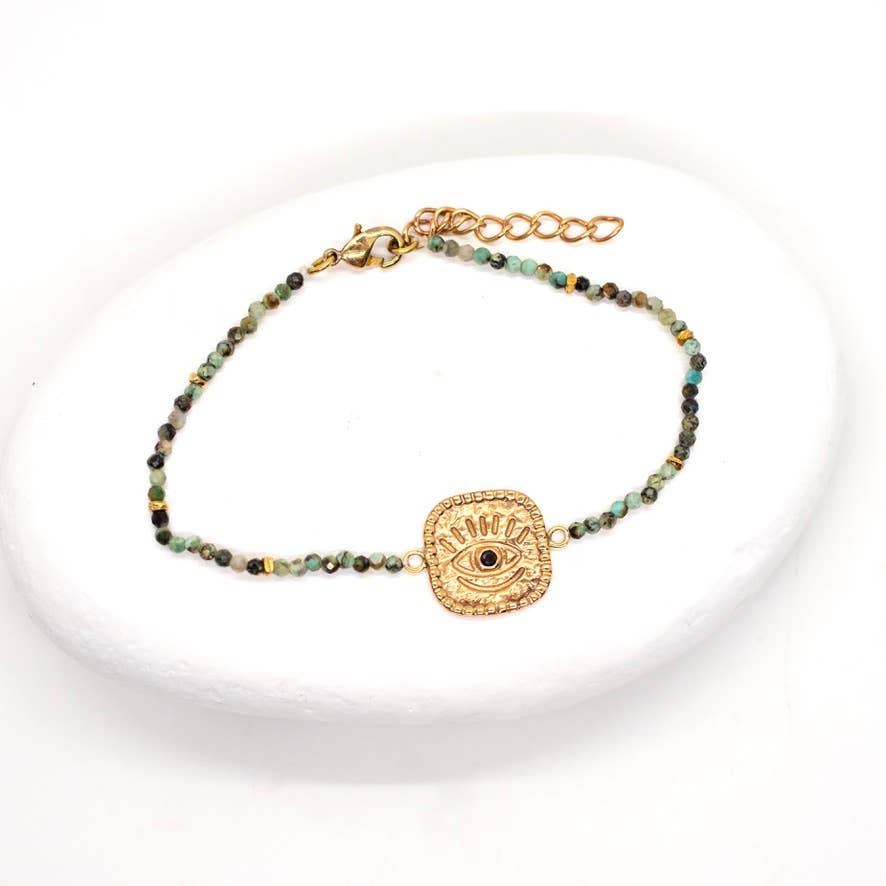 Brass beaded bracelet featuring charm with eye design and faceted Black Spinel stone, available in Tourmaline or Turquoise beading. Bracelet is 6 inches with 1 inch extension.