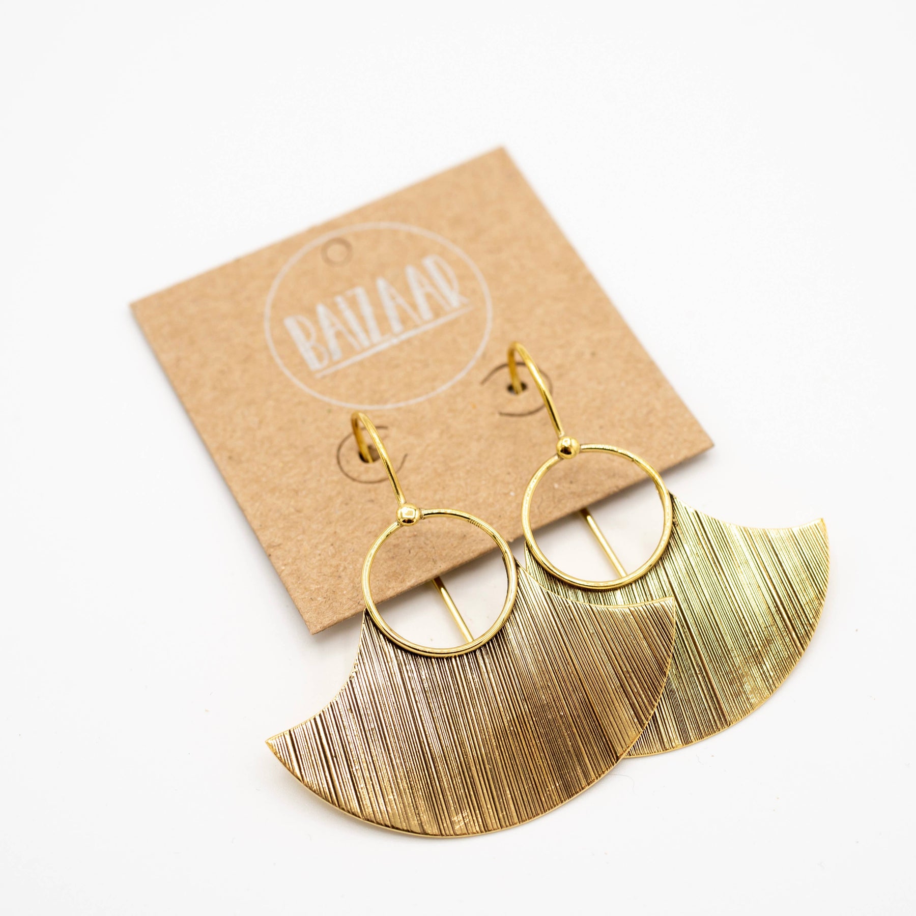 Brass earring featuring beautiful etched lines and fan design. 1.5 inches long (without hook) by 1.75 inches.