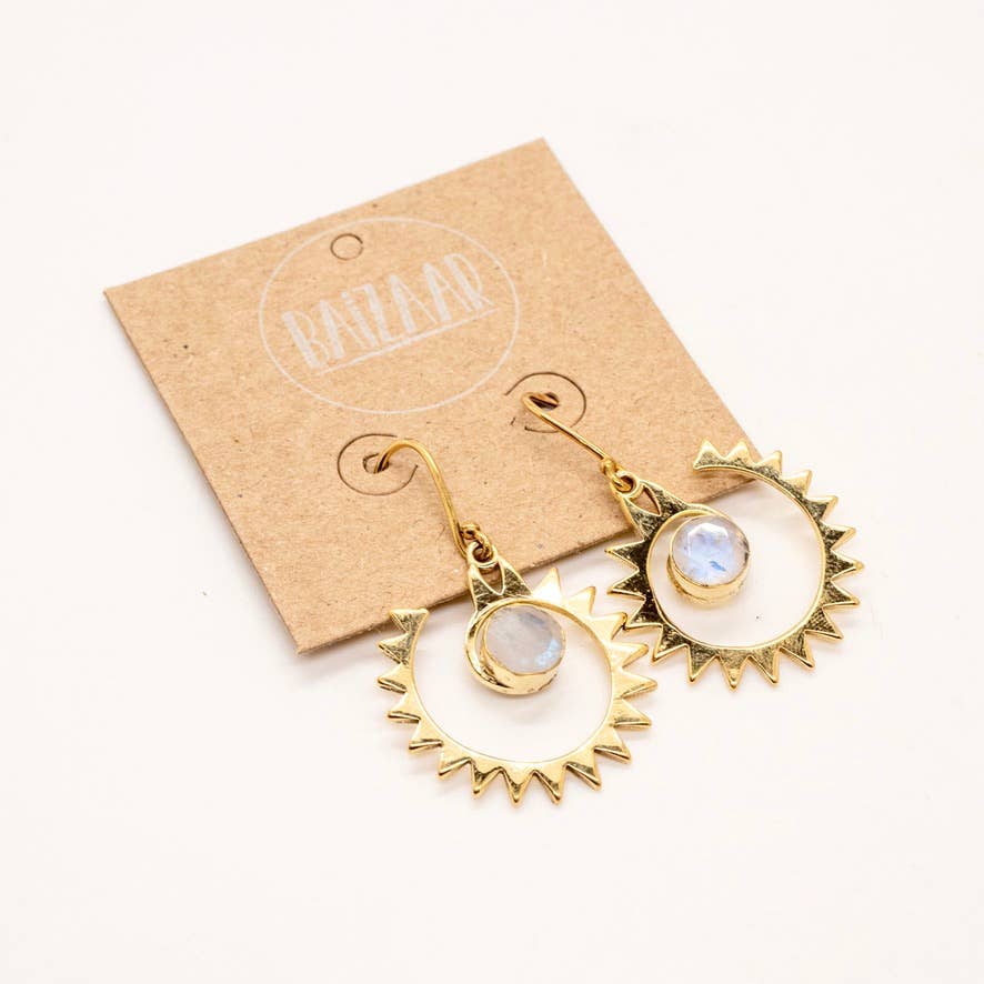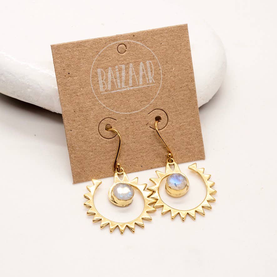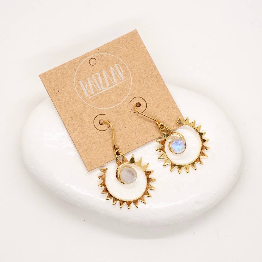 Brass earrings featuring curling sunburst design with faceted moonstone.
