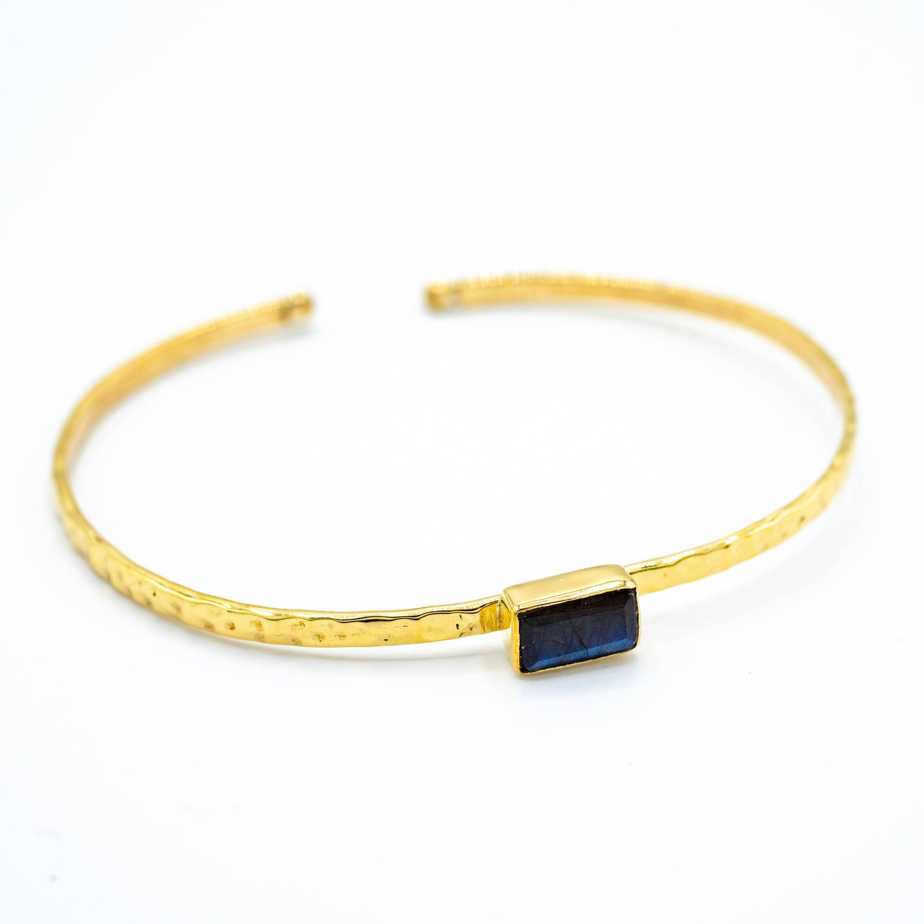 Hammered brass bangle featuring high quality faceted rectangle Labradorite stone.