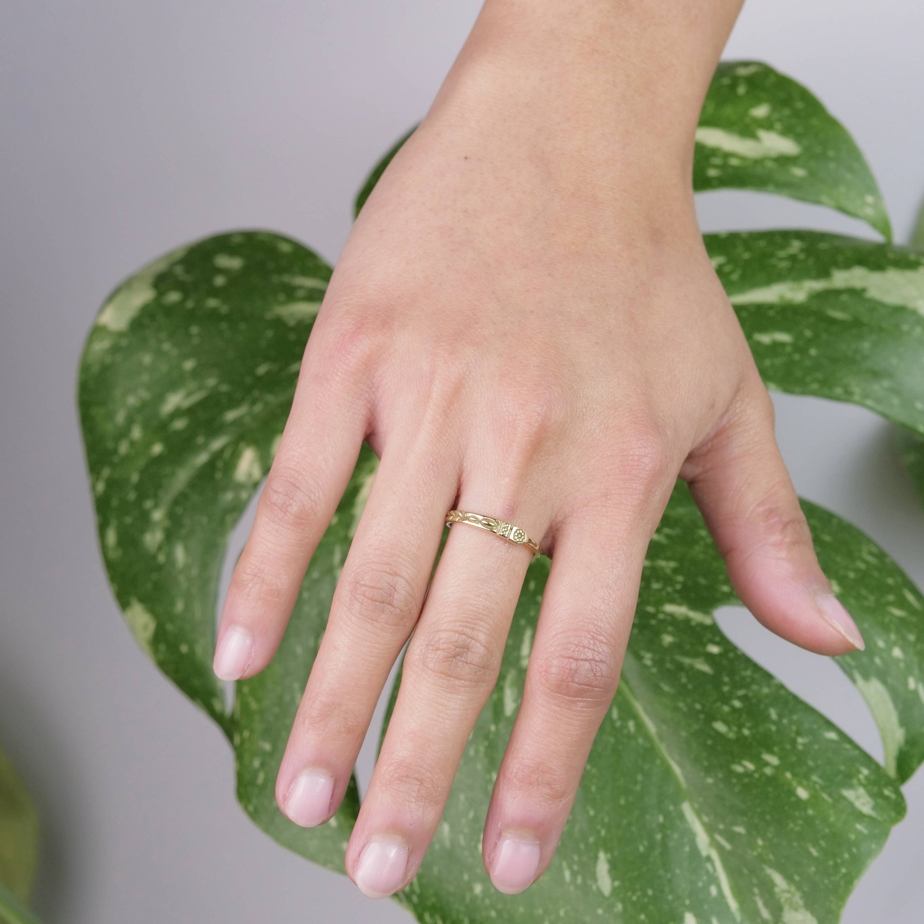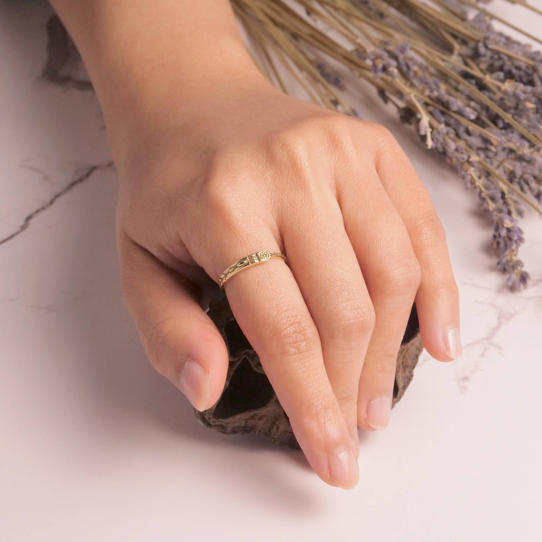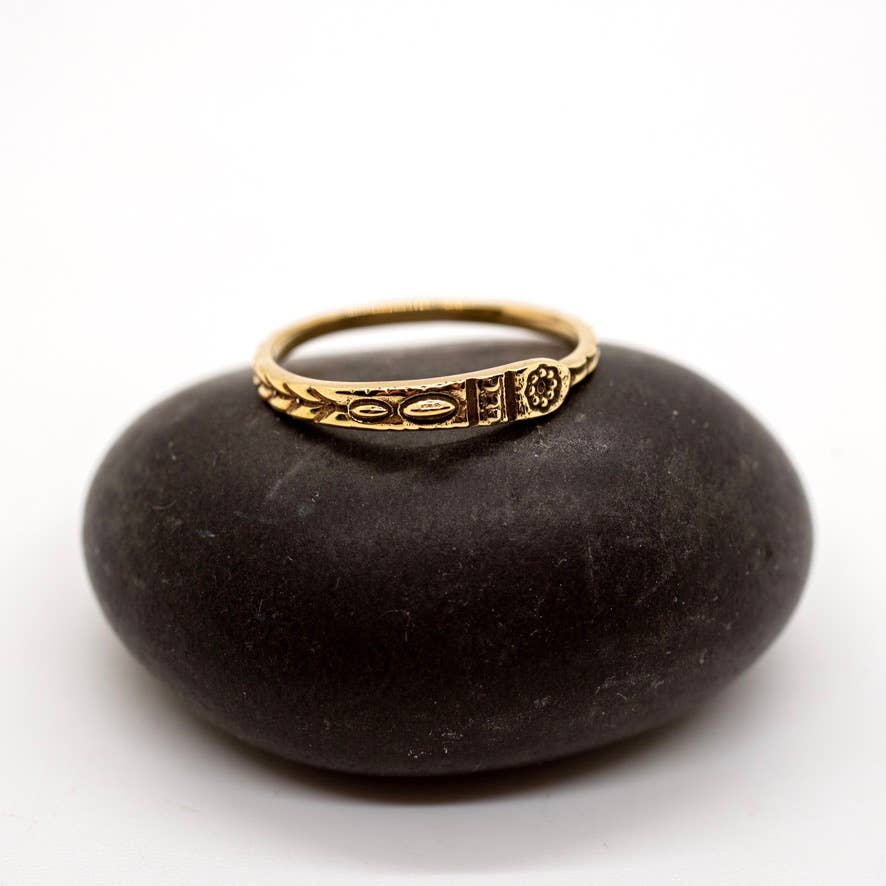 Brass band ring featuring feathered etching and floral design, available in sizes 6-10.