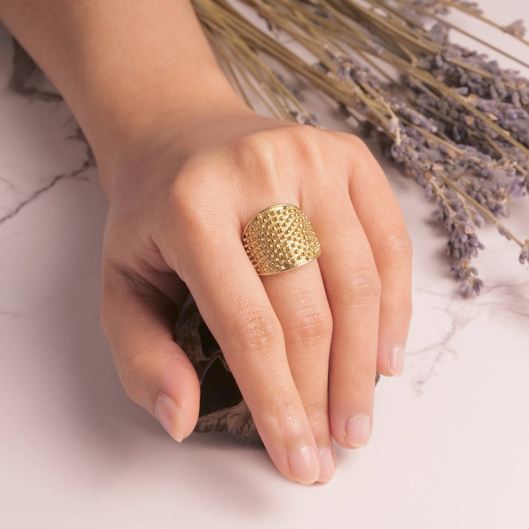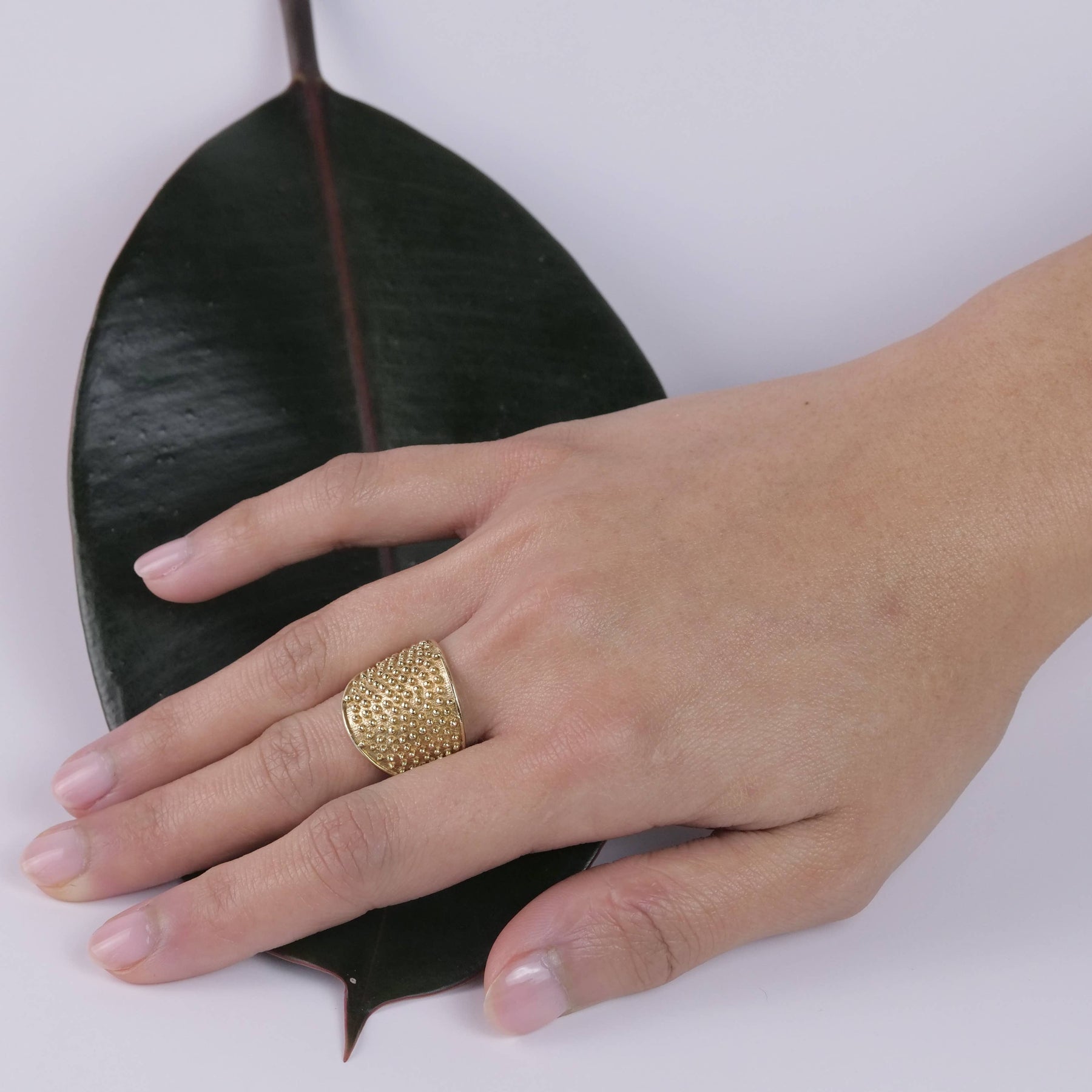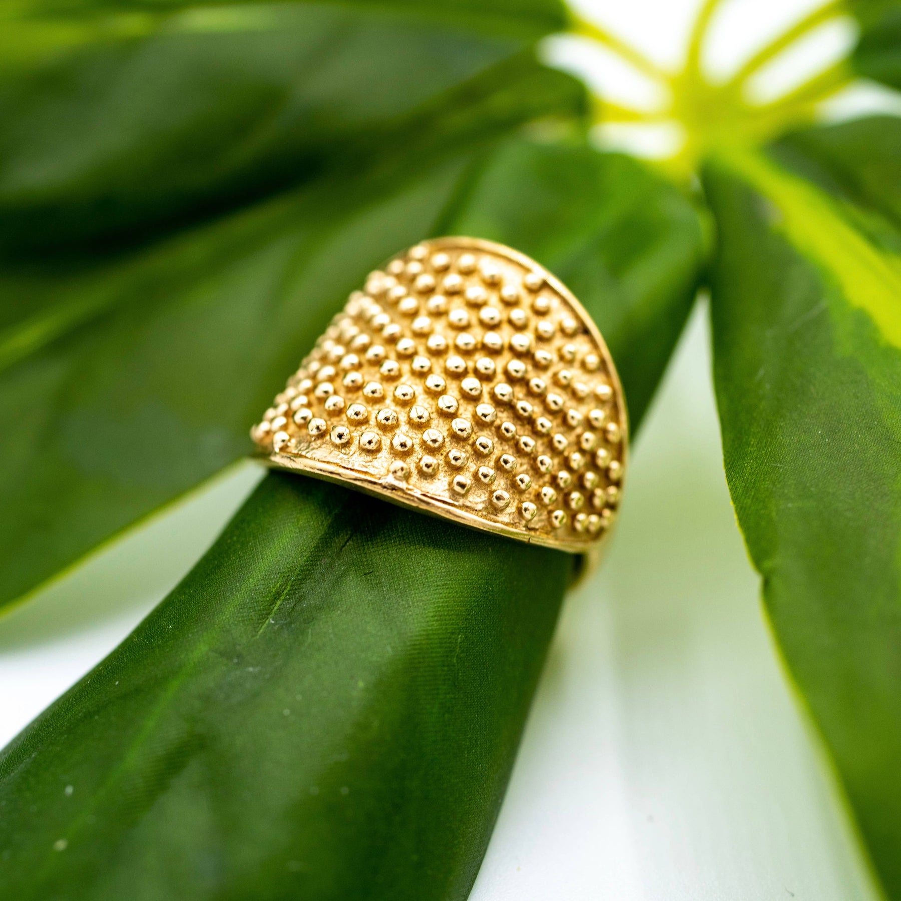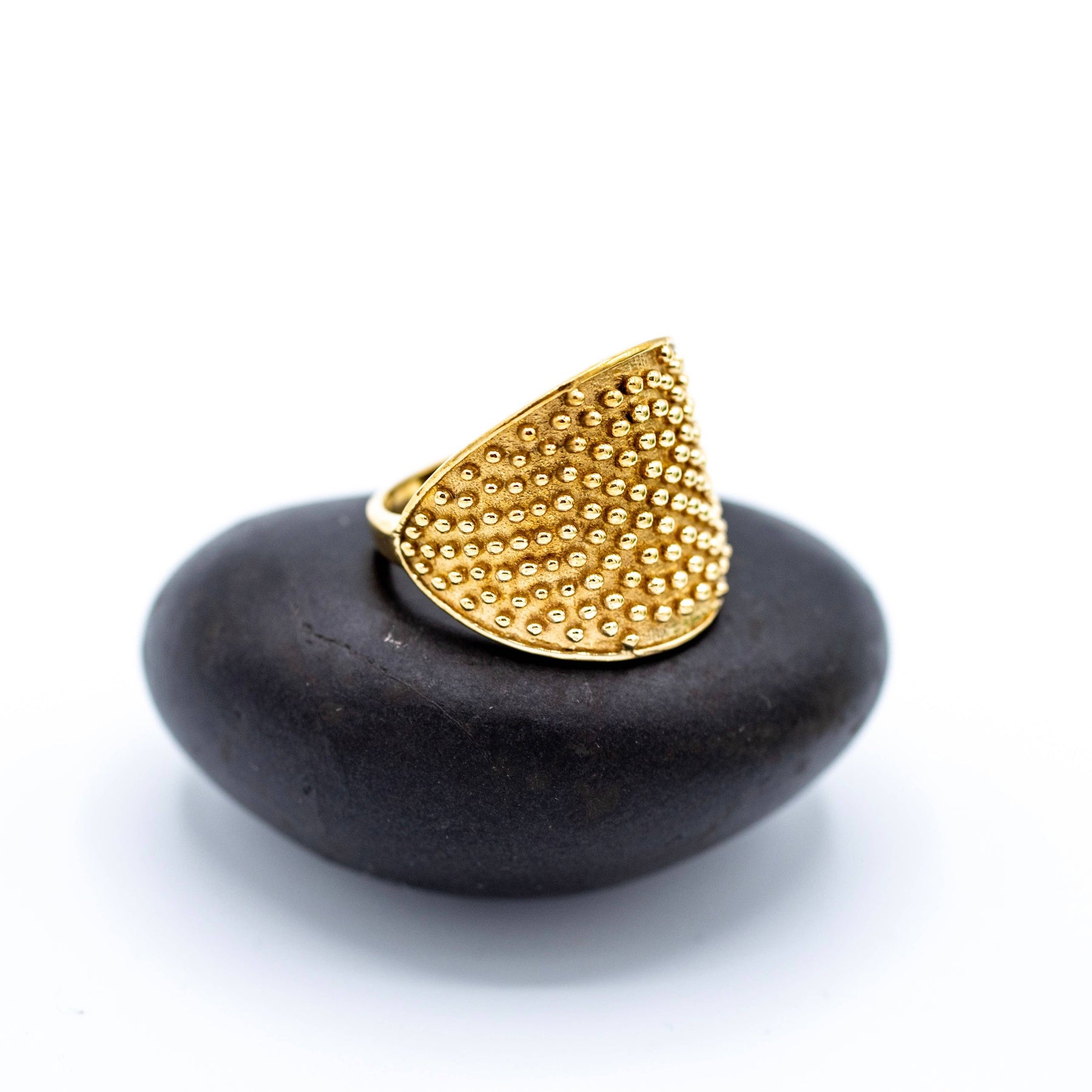 Brass ring featuring speckle design, available in sizes 5-10.