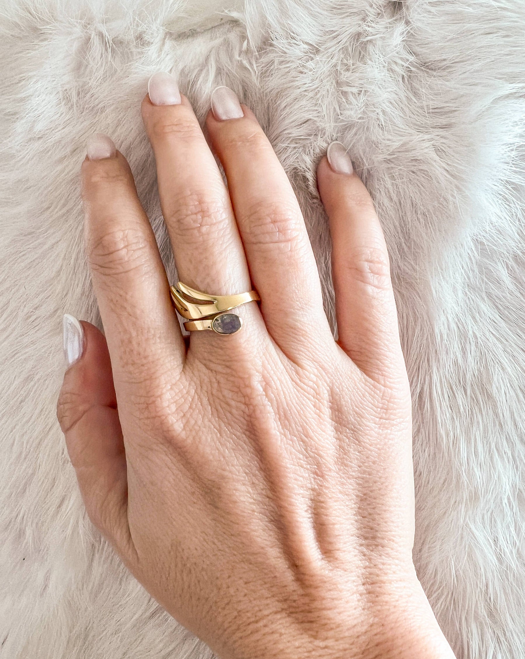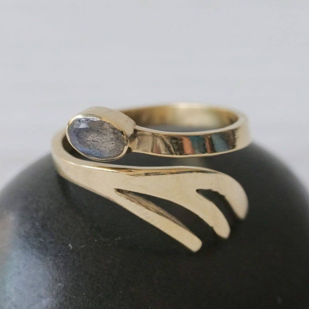 Feathered top brass ring with faceted labradorite stone.