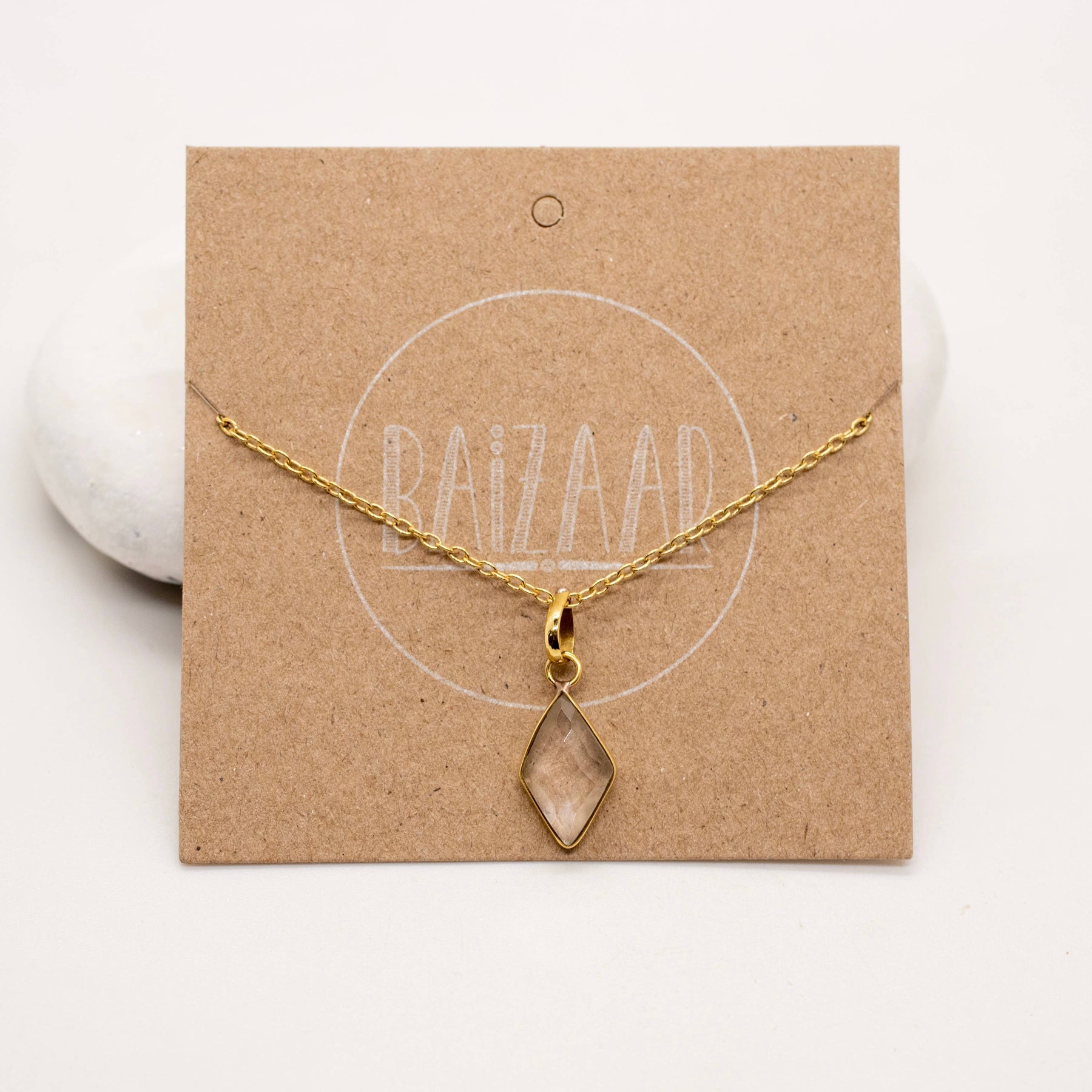 Brass necklace featuring diamond shaped faceted crystal quartz on 18 inch chain