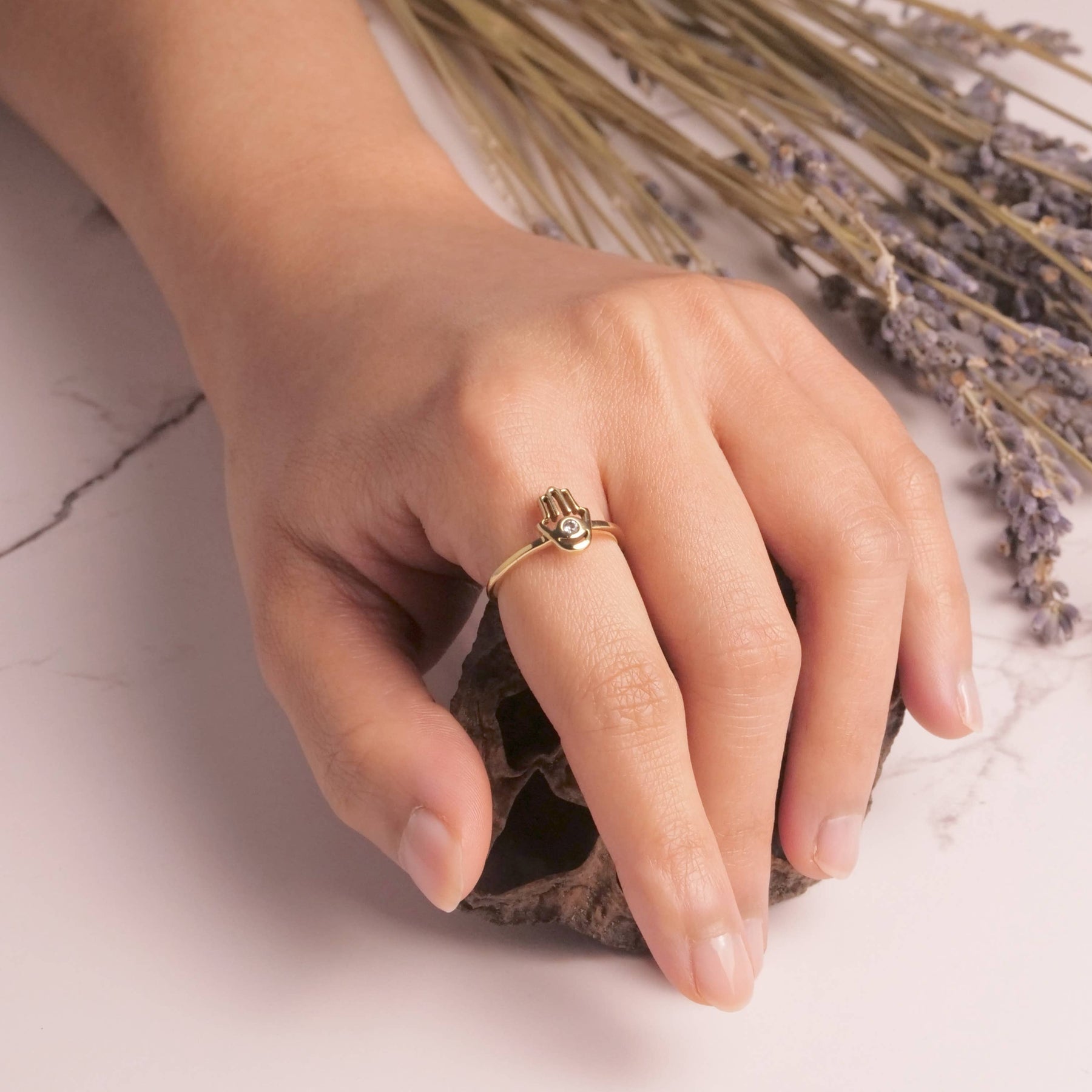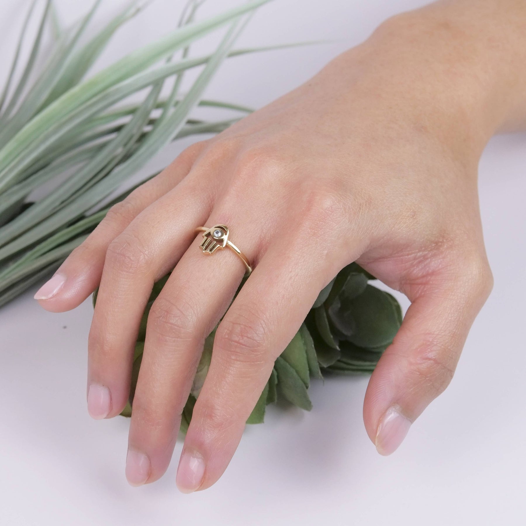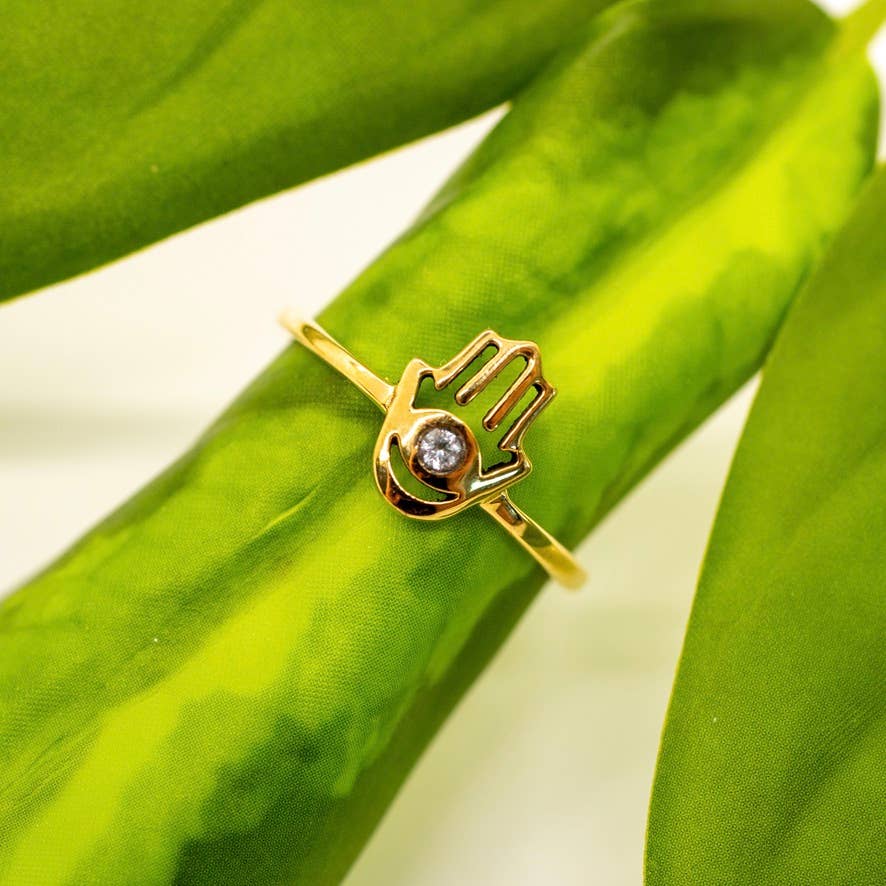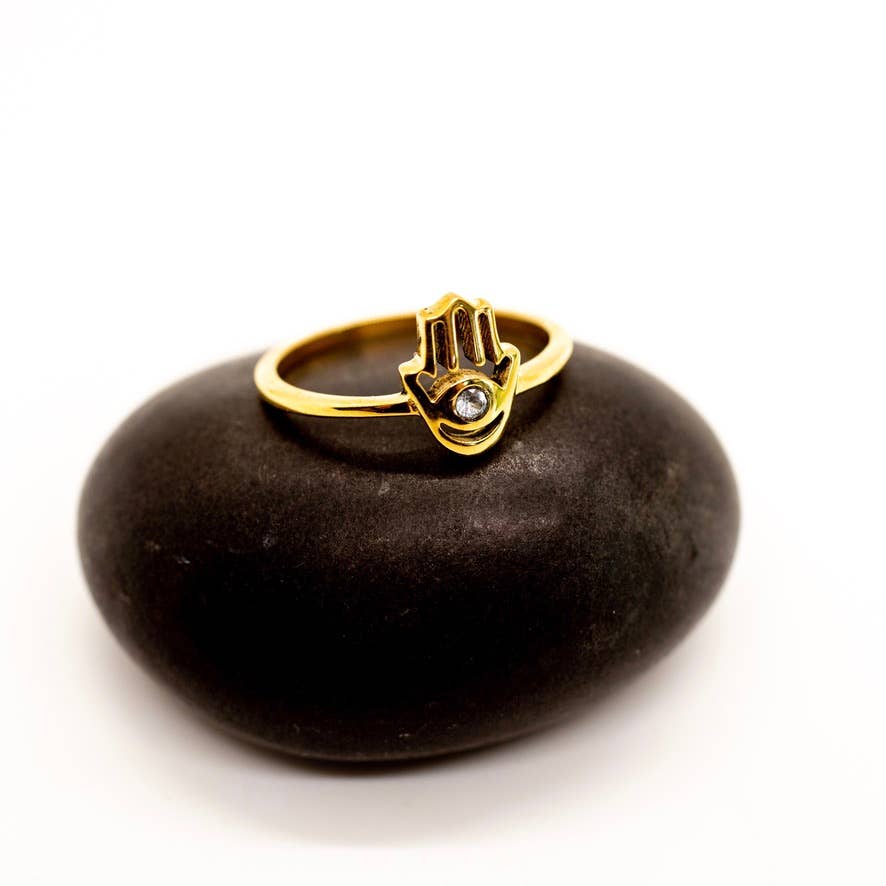 Brass hamsa ring with faceted crystal available in size 5-10.