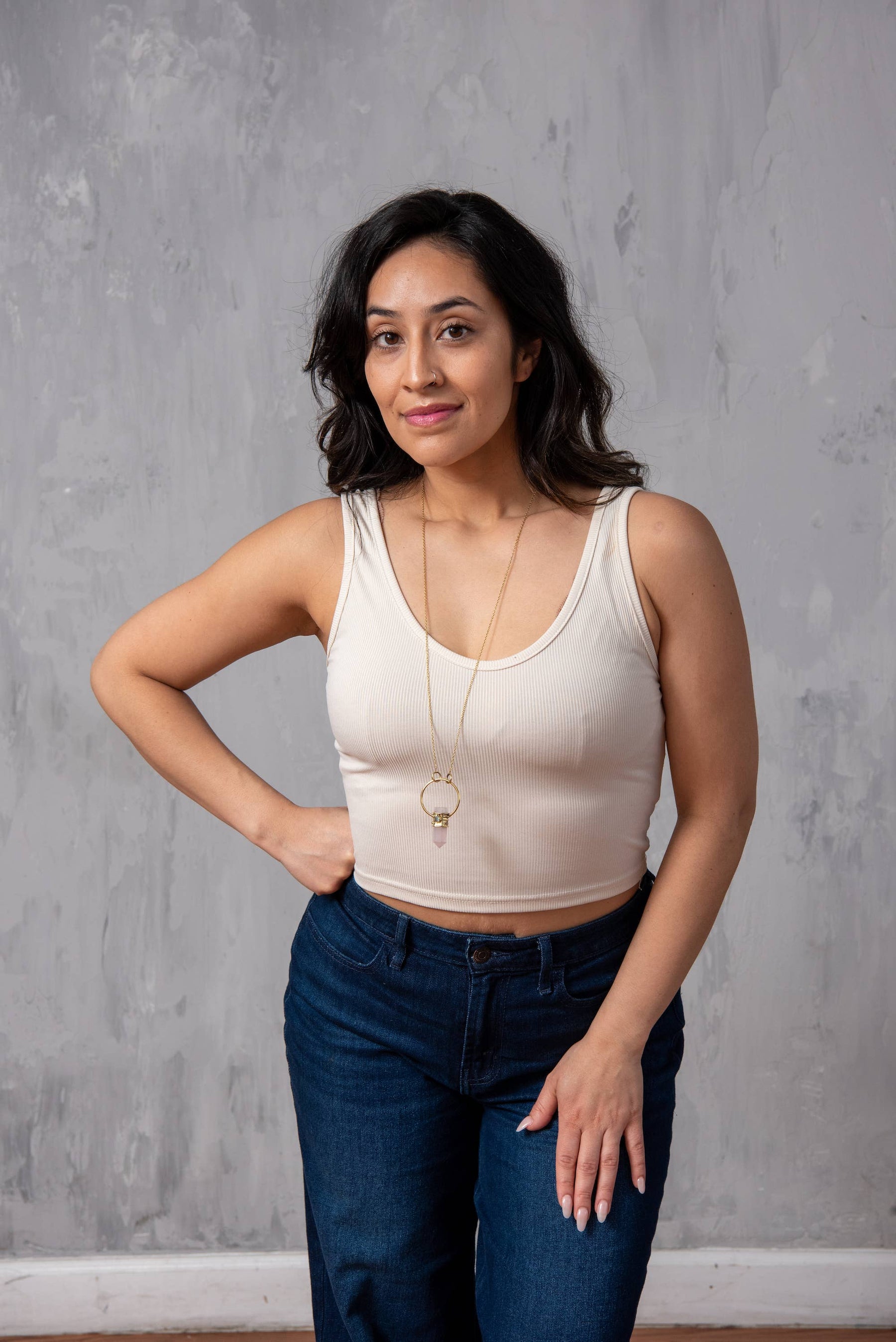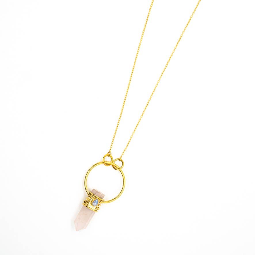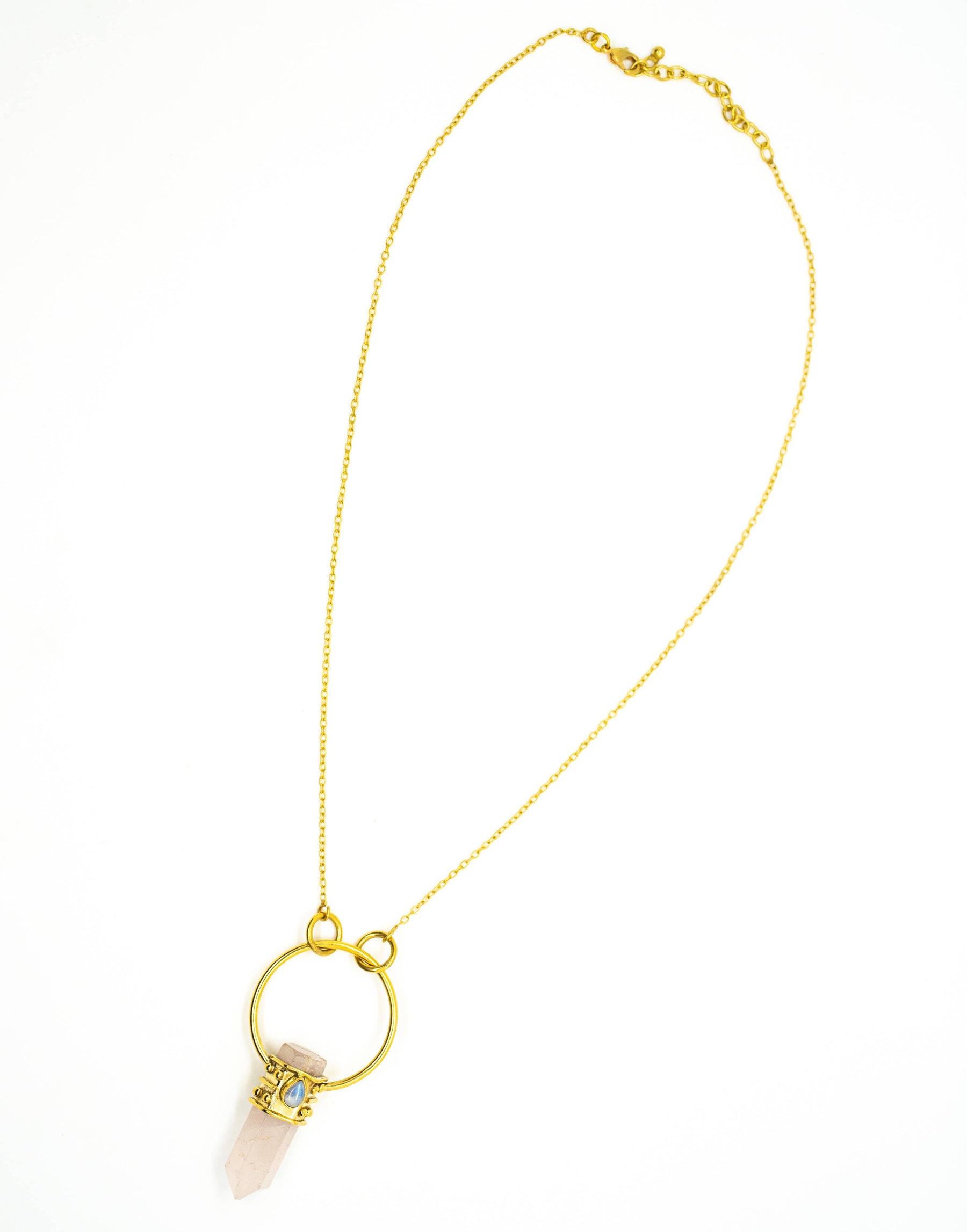 Brass Rose Quartz crystal point necklace featuring Labradorite accent stone. Rose quartz point is 1.25 inches long by .25 inches wide. Chain is 18 inches long with 2 inch extender.
