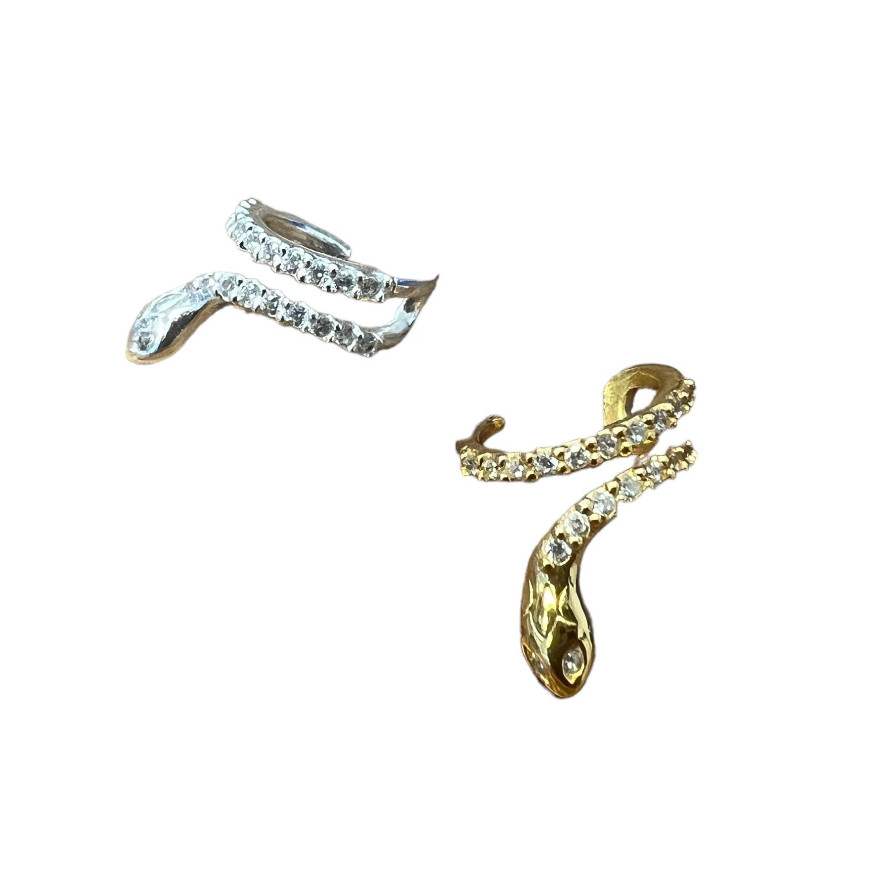Snake ear cuff with inlayed crystals, available in sterling silver and gold plated.