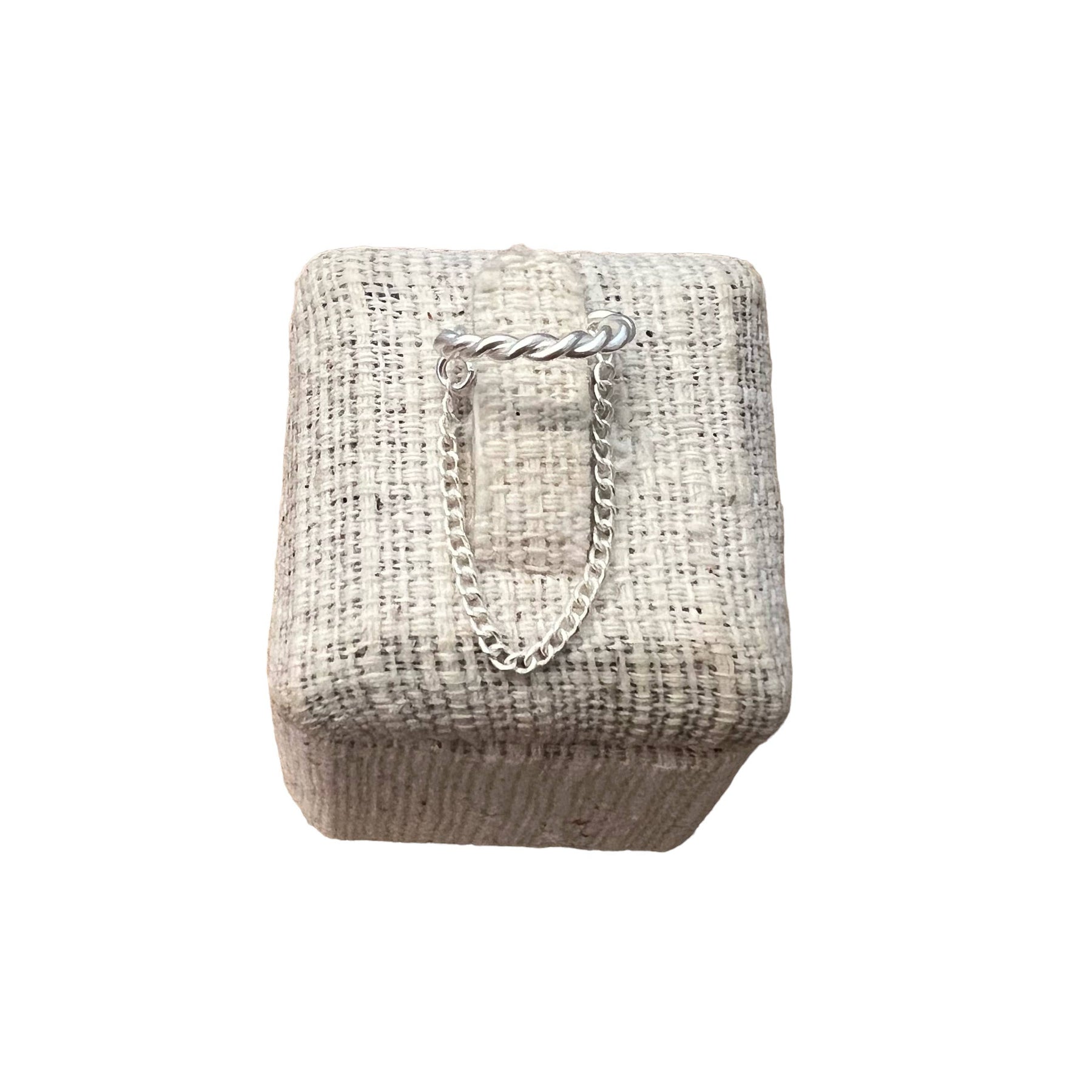 Sterling silver ear cuff featuring twisted design with attached chain.
