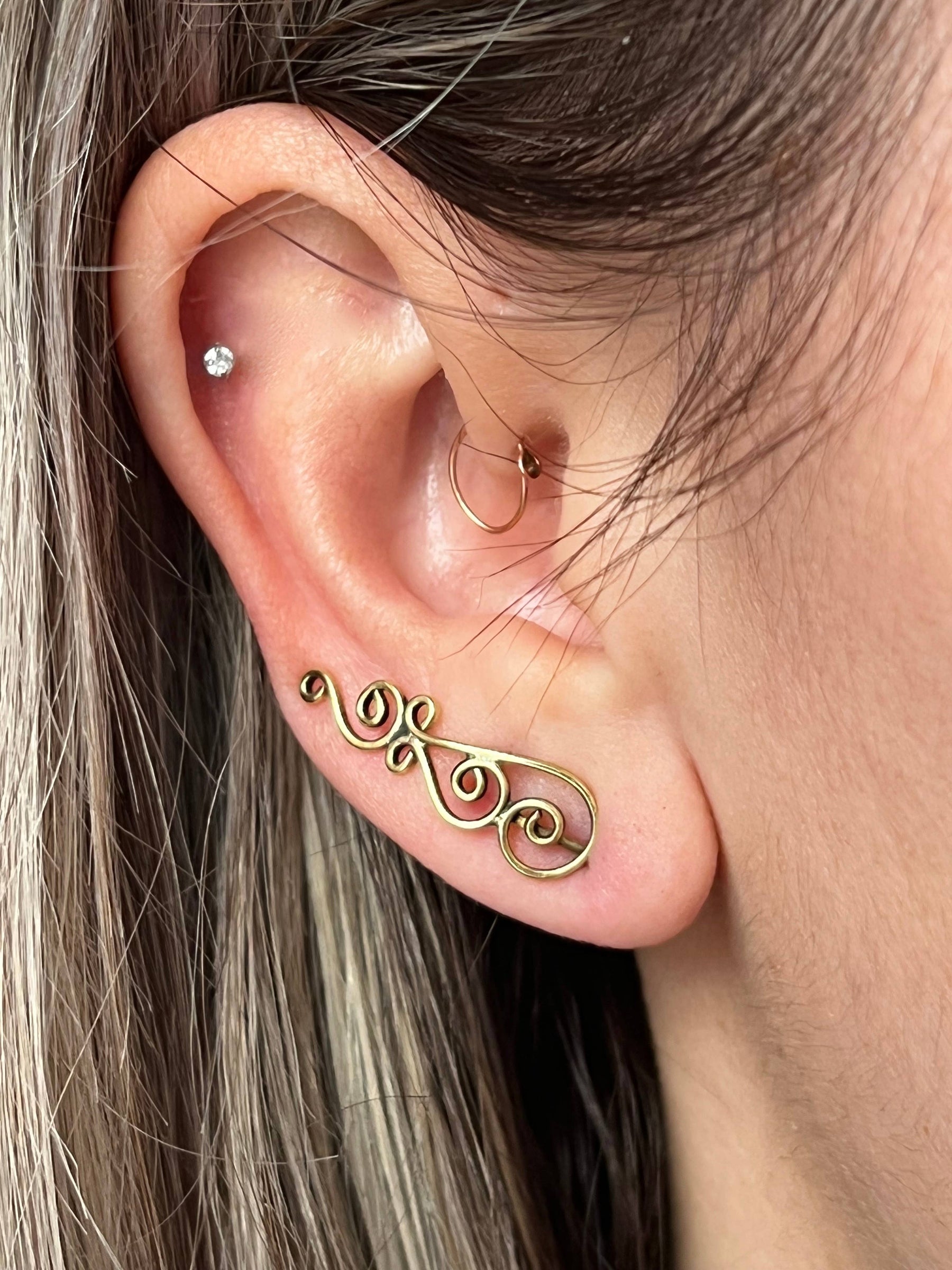 Our ear climbers and ear jackets are handmade in Northern India and are available in brass or sterling silver.