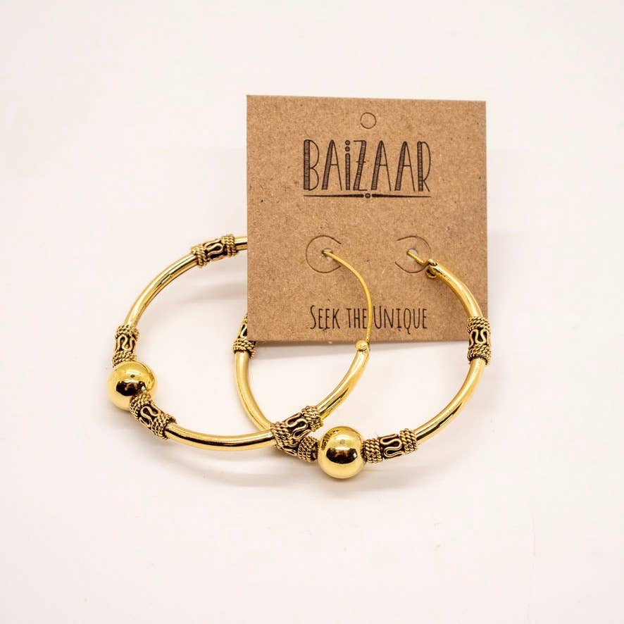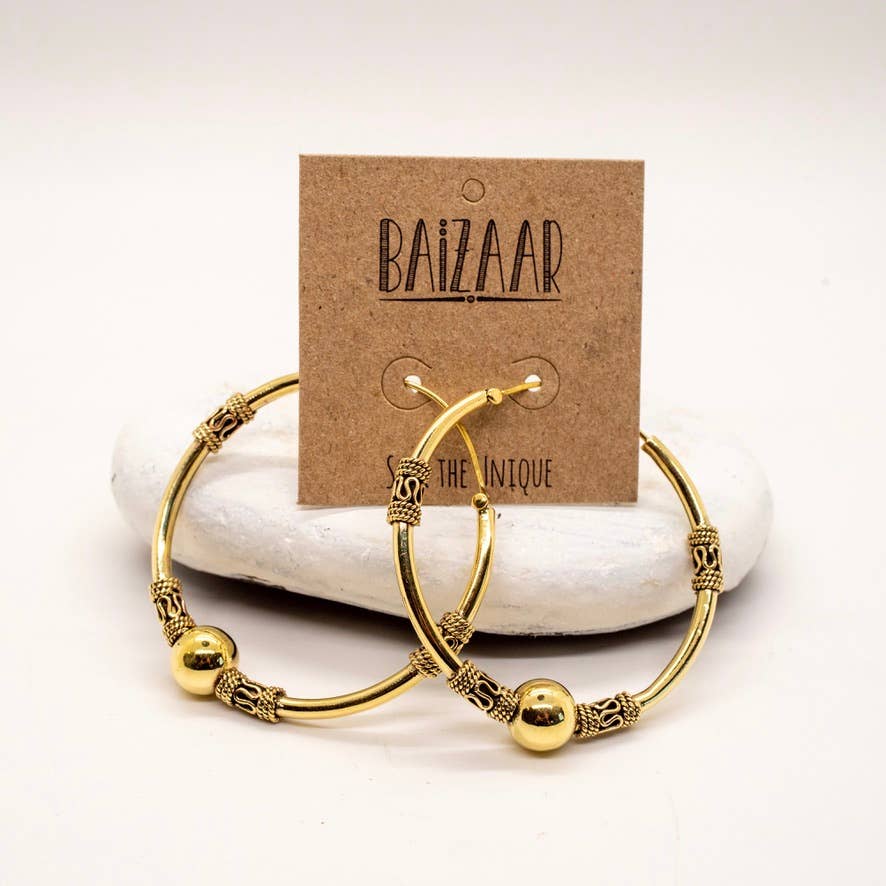 Immerse yourself in the bohemian spirit with our Brass Raja Decorated Hoop Earrings. Crafted by empowered artisans in India and Thailand, these 2" x 2" earrings embody Baizaar's commitment to soulful and spirited jewelry. Made of high-quality brass, they are perfect for adding a touch of adventure to your Christmas celebrations. As part of our ethical sourcing initiative, these earrings come in recyclable packaging and support fair trade practices. Enjoy the blend of traditional and innovative design with Baizaar.