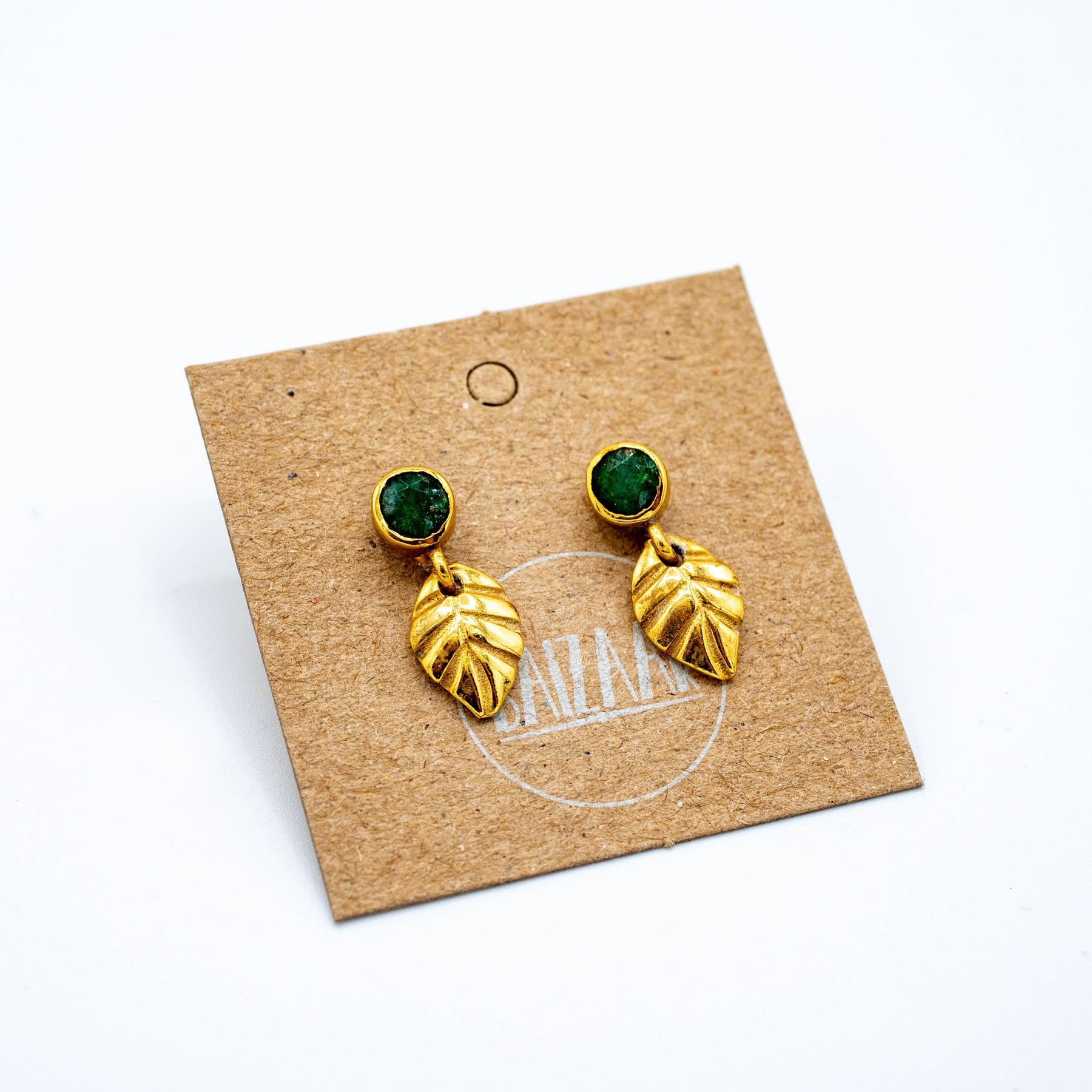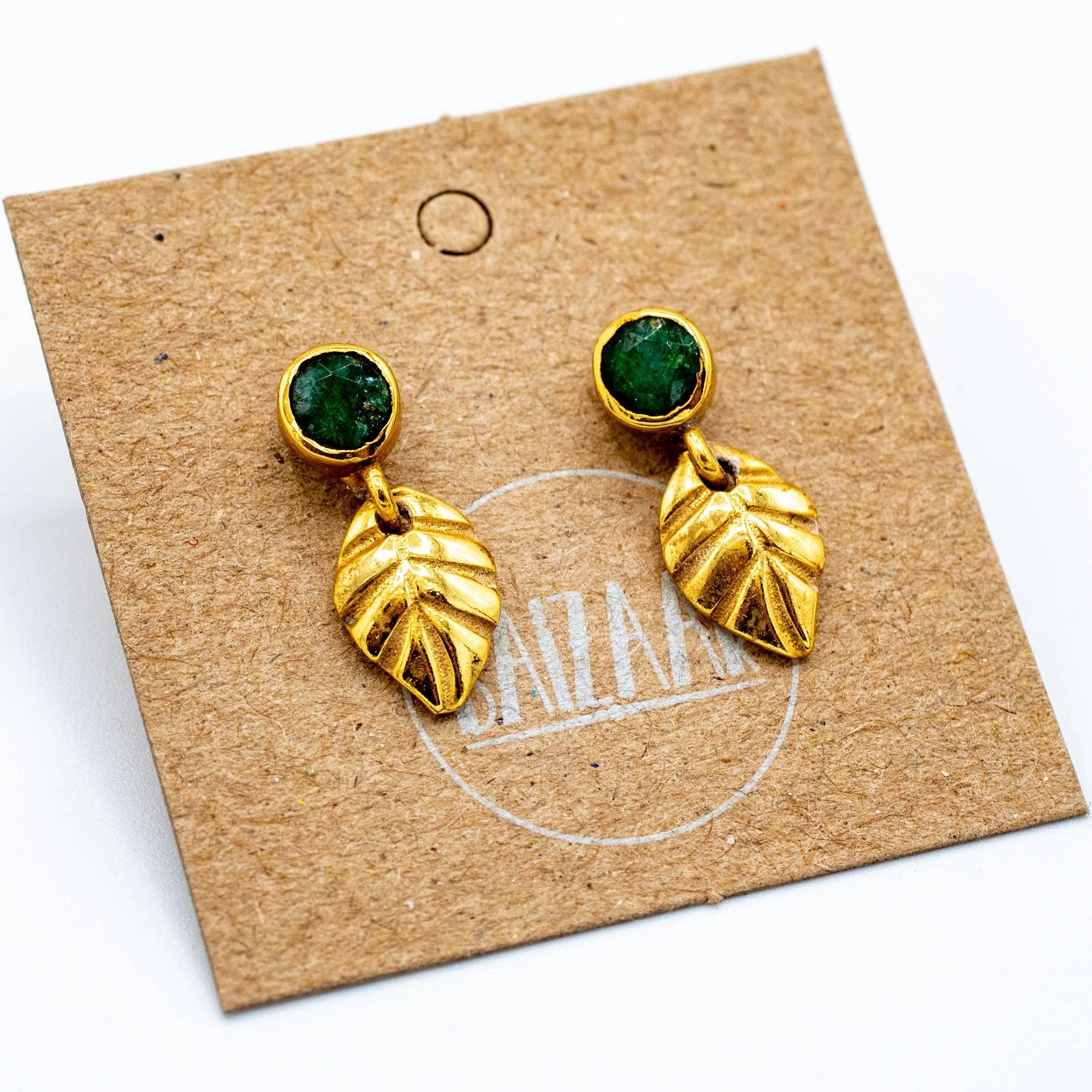 Sweet brass studs featuring faceted emerald stone and leaf dangle.