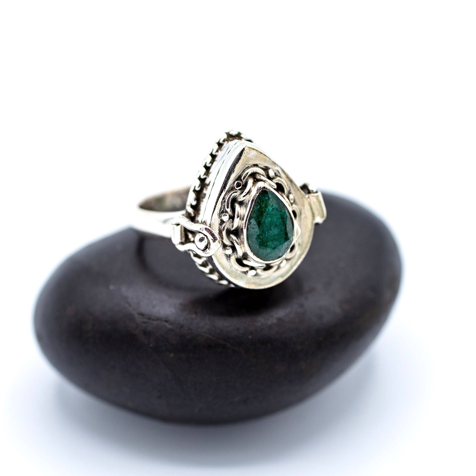 Sterling silver poison ring featuring faceted Emerald stone. Yes, it opens! Available in sizes 6-10.