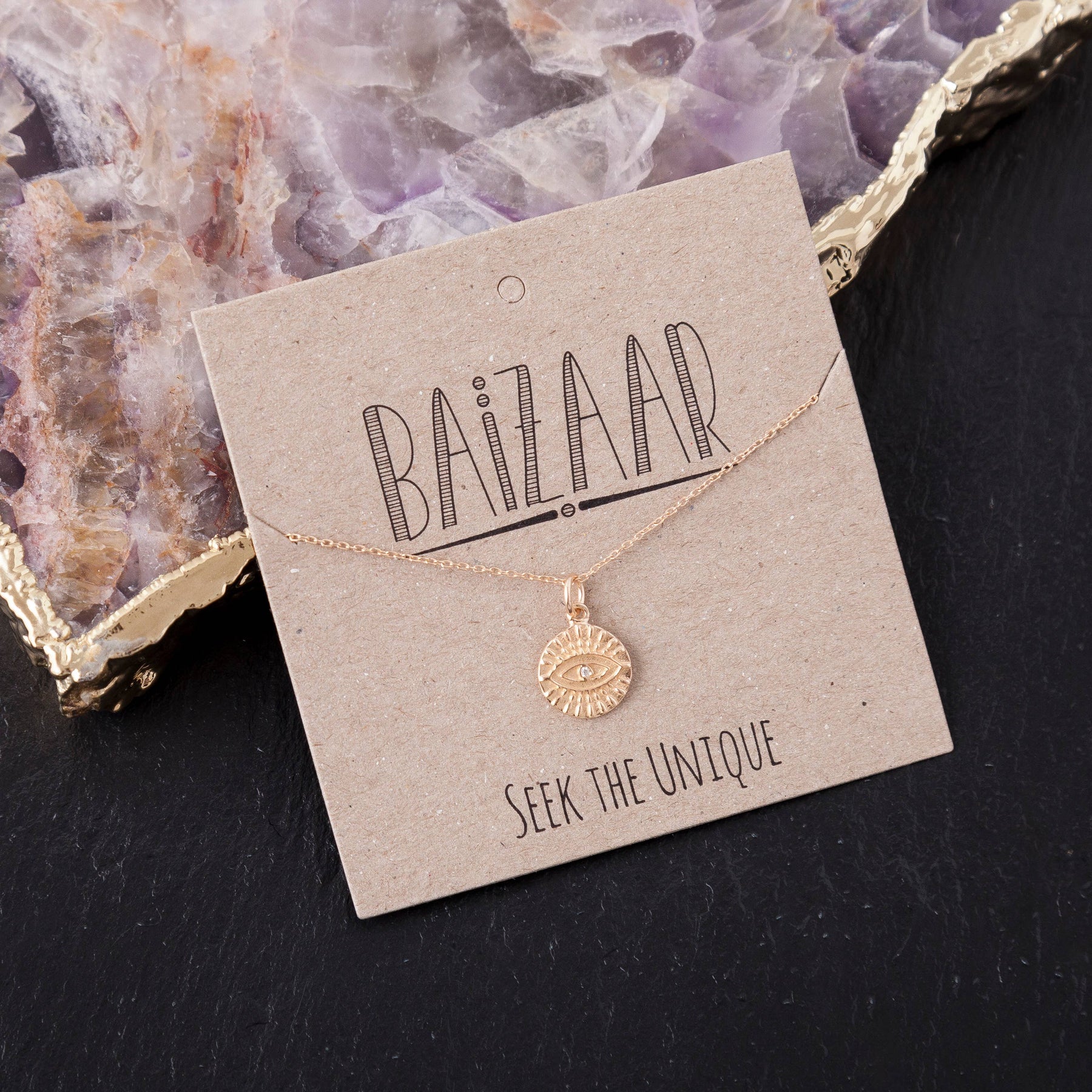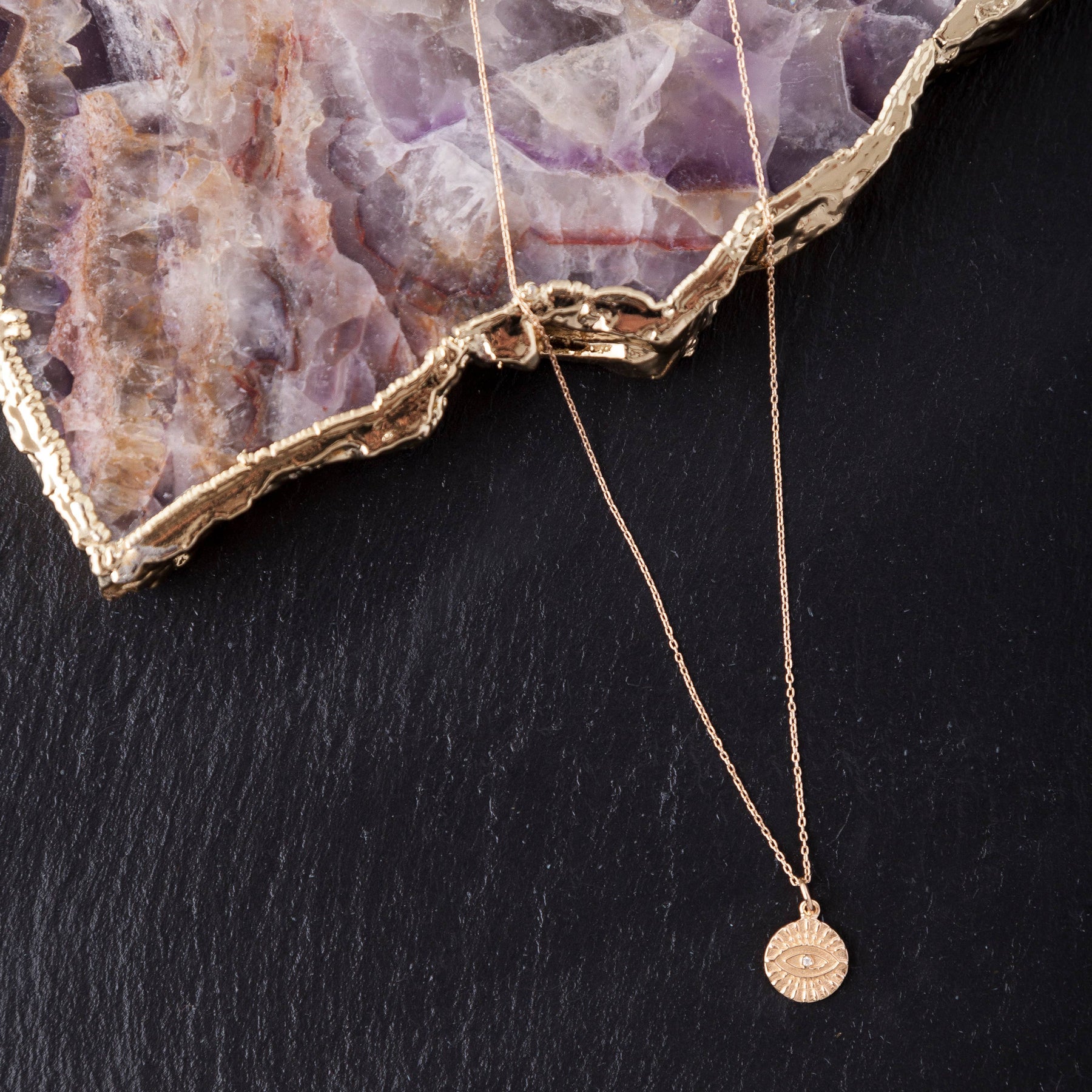 Lovely gold plated evil eye necklace with cut white zircon stone. Just delicate enough but still beautifully unique! 1 micron gold plated over sterling silver.