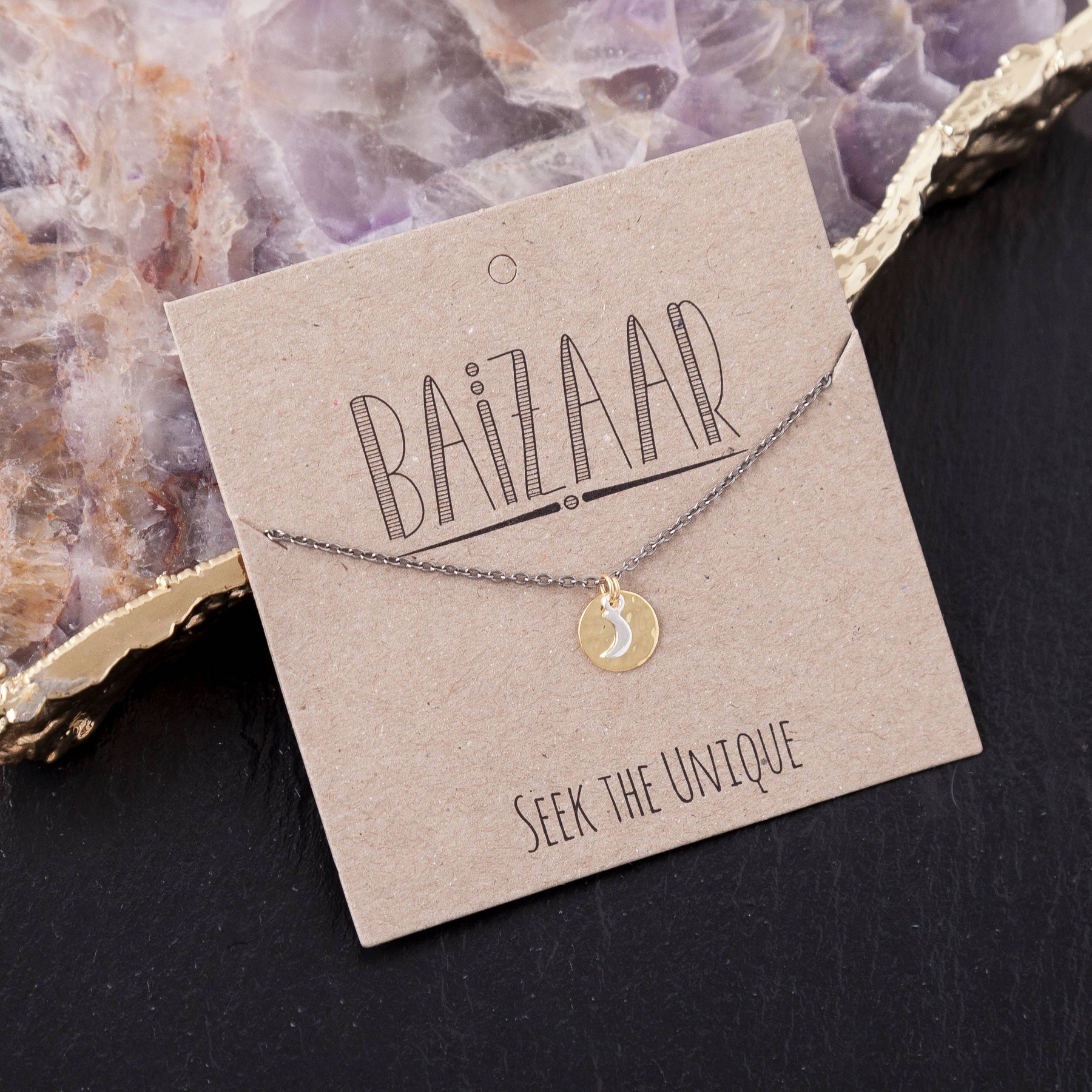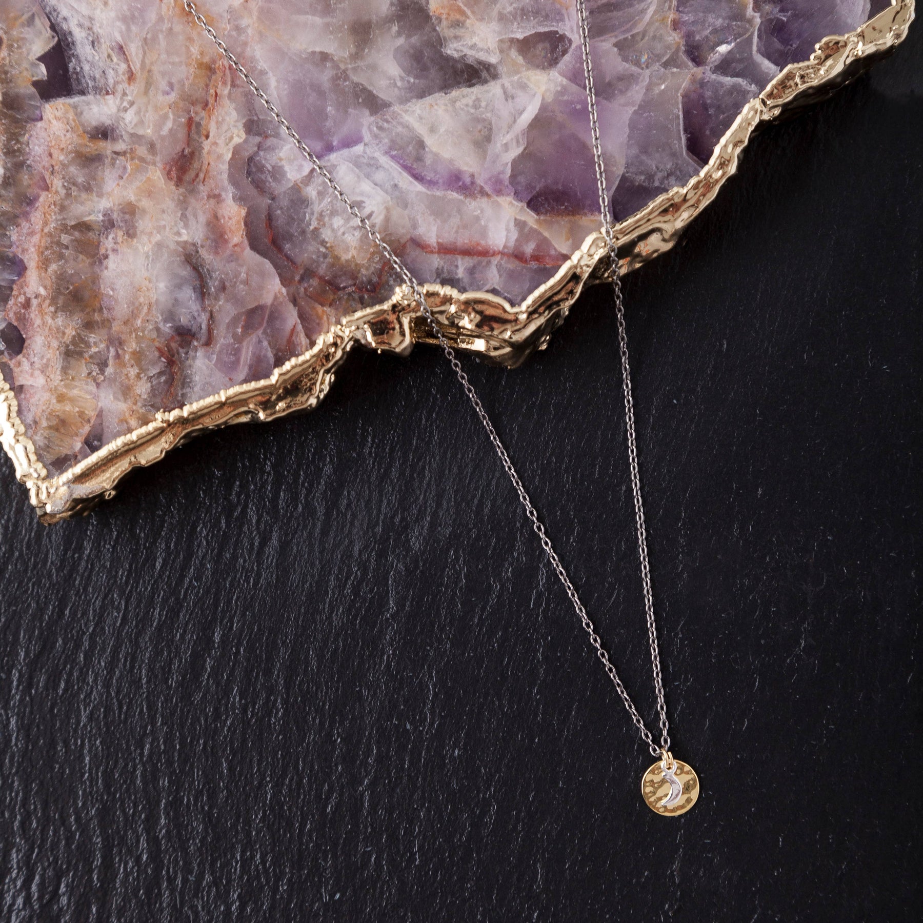 Tri-metal moon necklace with gold plated disc.