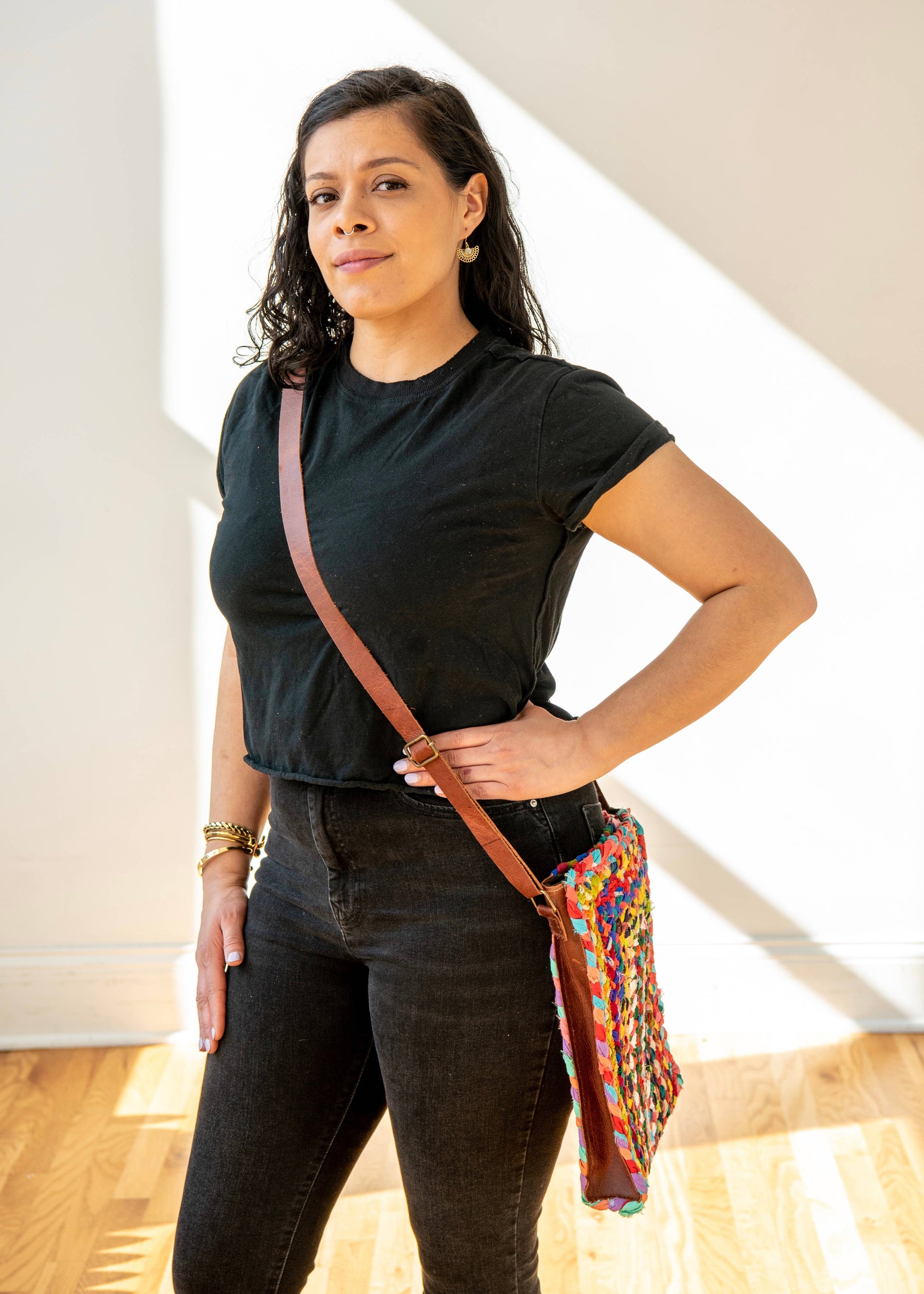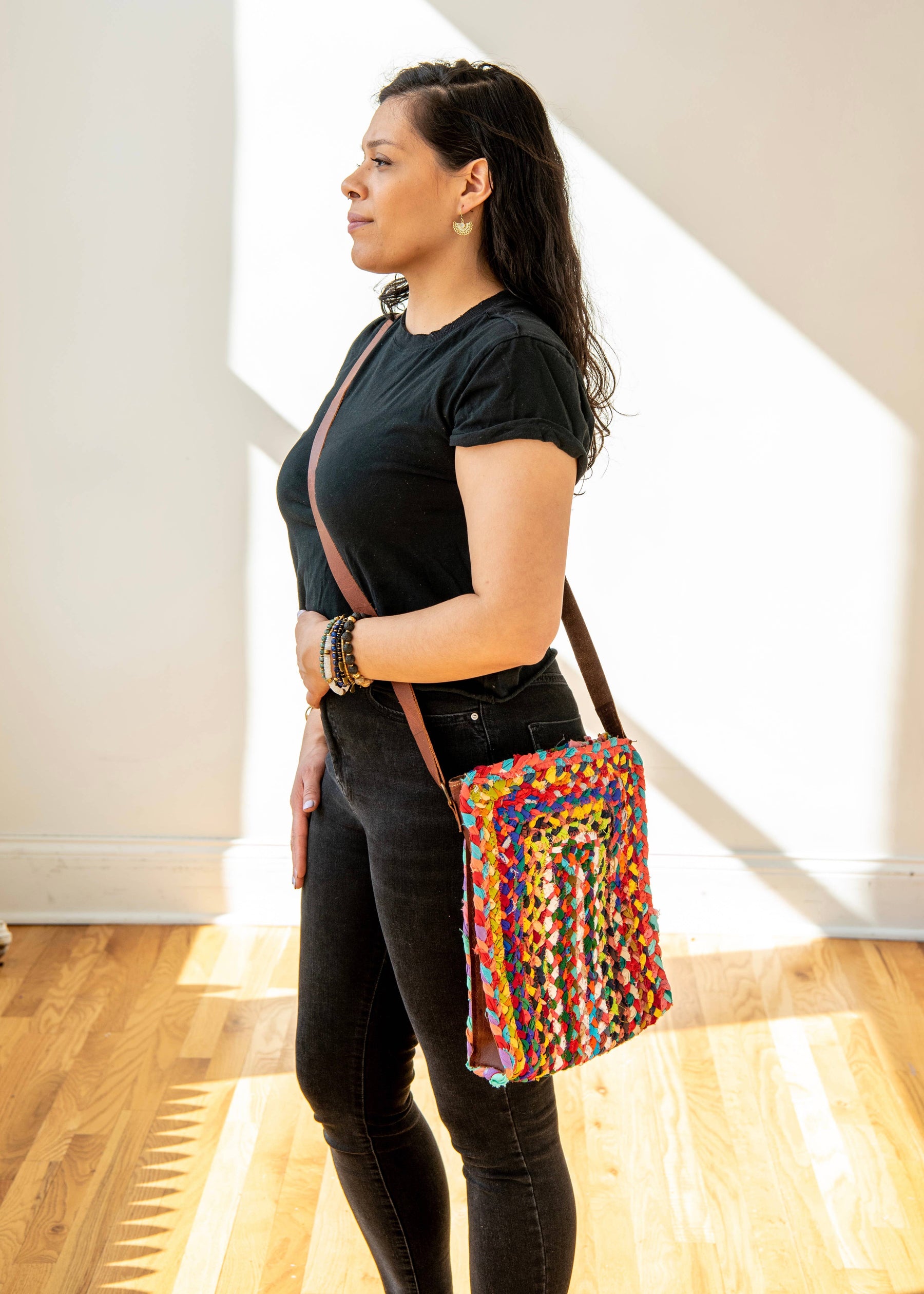 One of a kind crossbody bag made with woven repurposed cotton textiles and genuine leather.