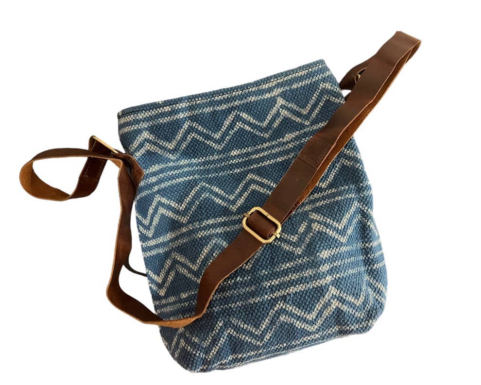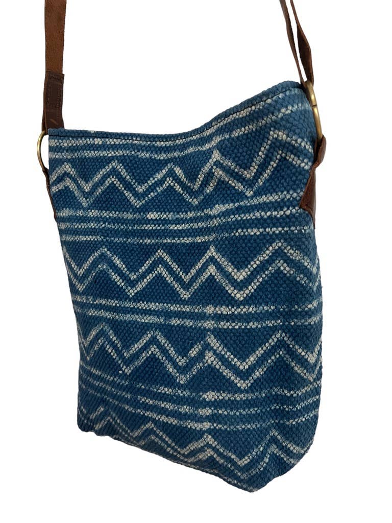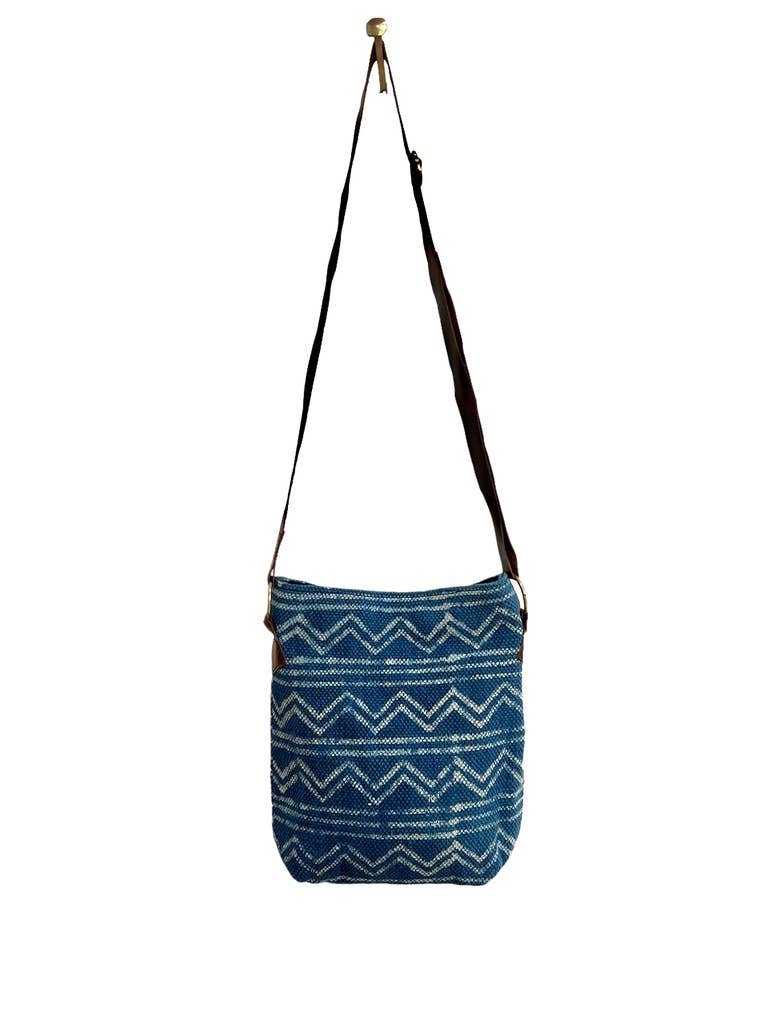 Indigo blue blockprint crossbody bag/purse with leather strap, zip closure and one zipper pocket inside.