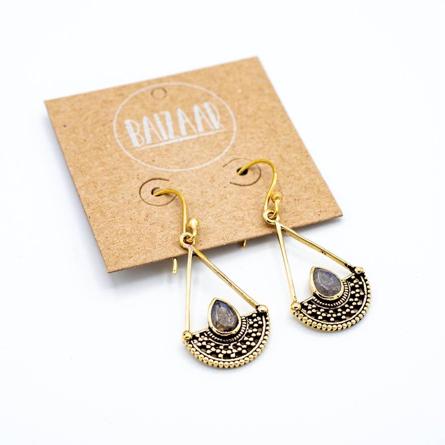 Brass dangle earrings featuring spotted half circle design featuring faceted labradorite stone.