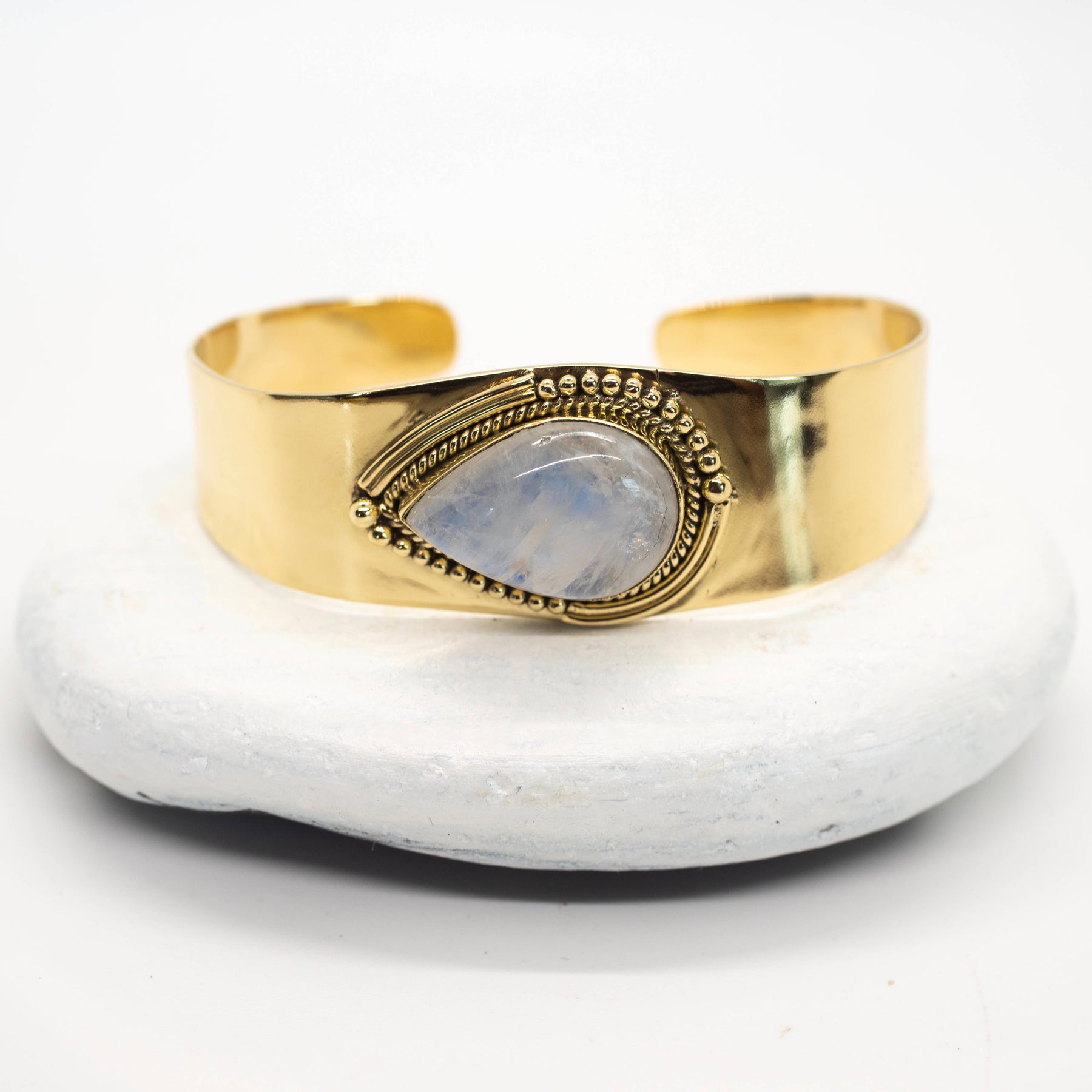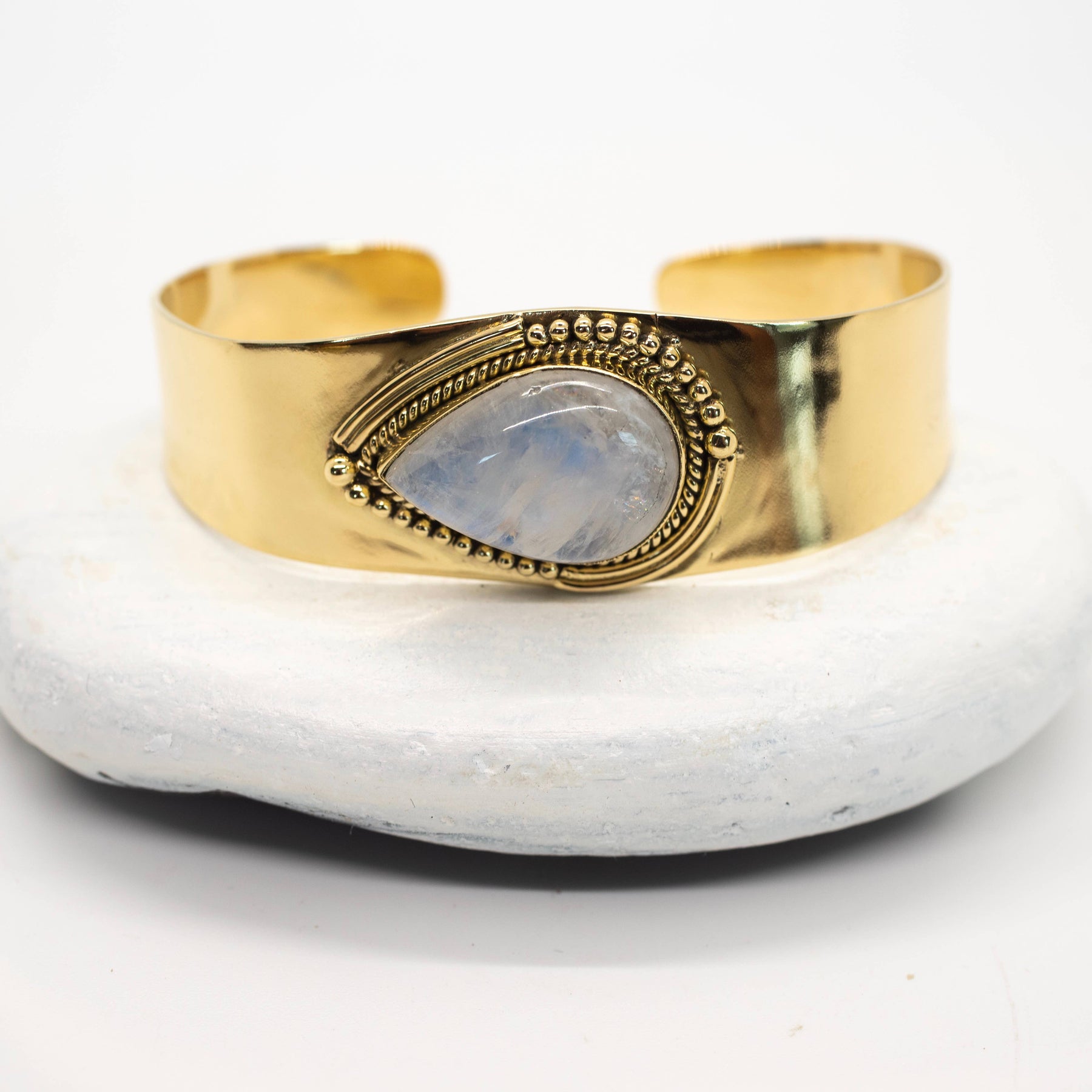Brass bracelet featuring large Moonstone with detail around stone in a polished brass cuff design.