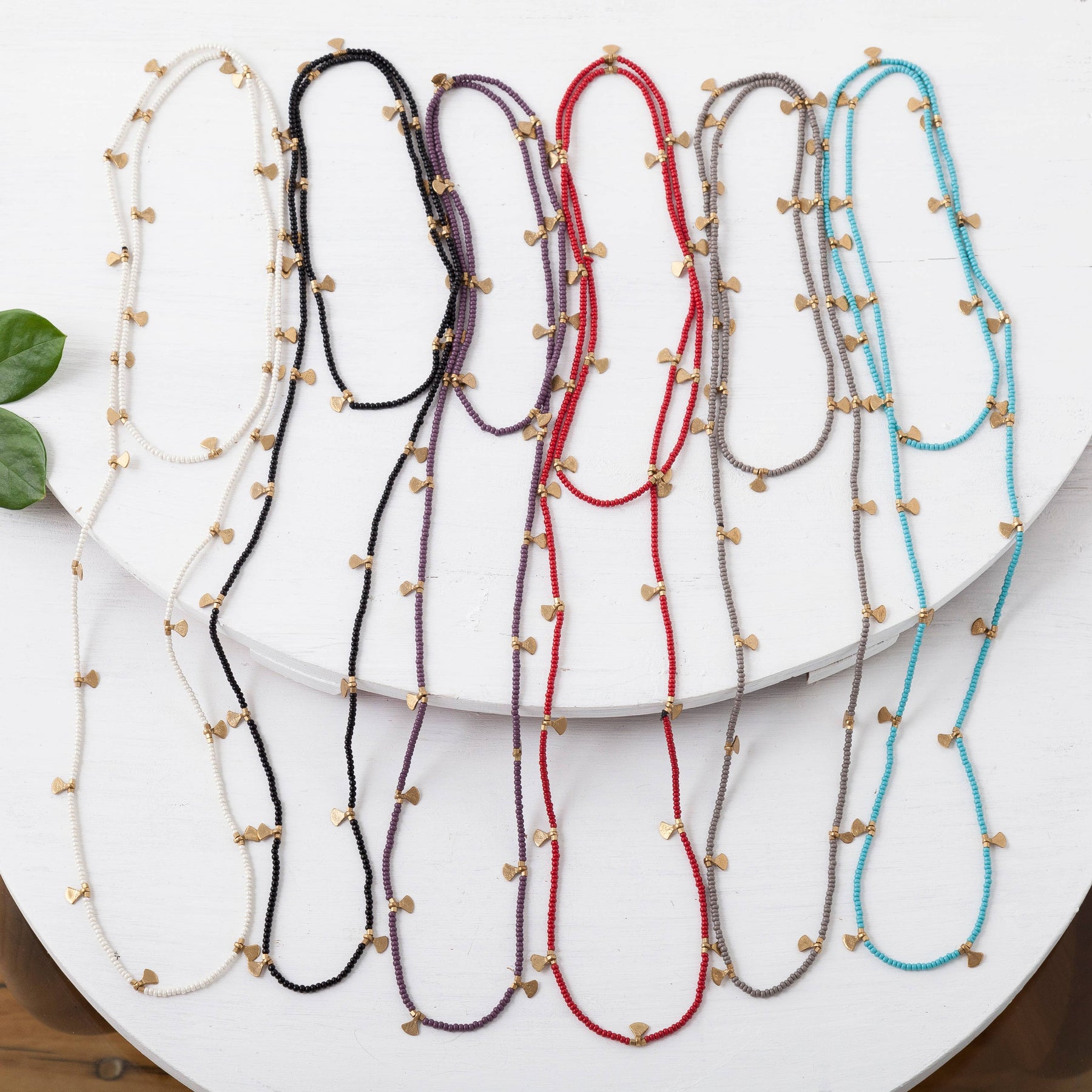 Color beaded brass strand necklace available in royal blue, turquoise, gray, purple, black and pearl colors.