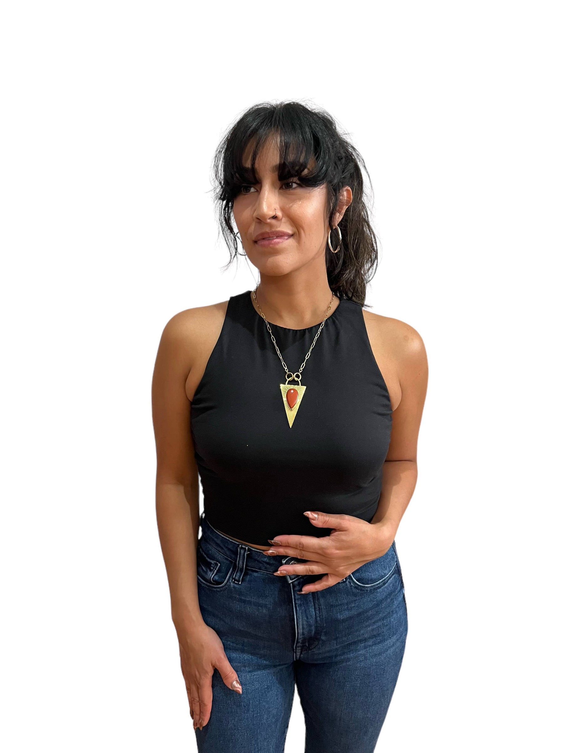 Stunning necklace featuring paperclip chain link and striking brass pendant with Red Jasper stone.