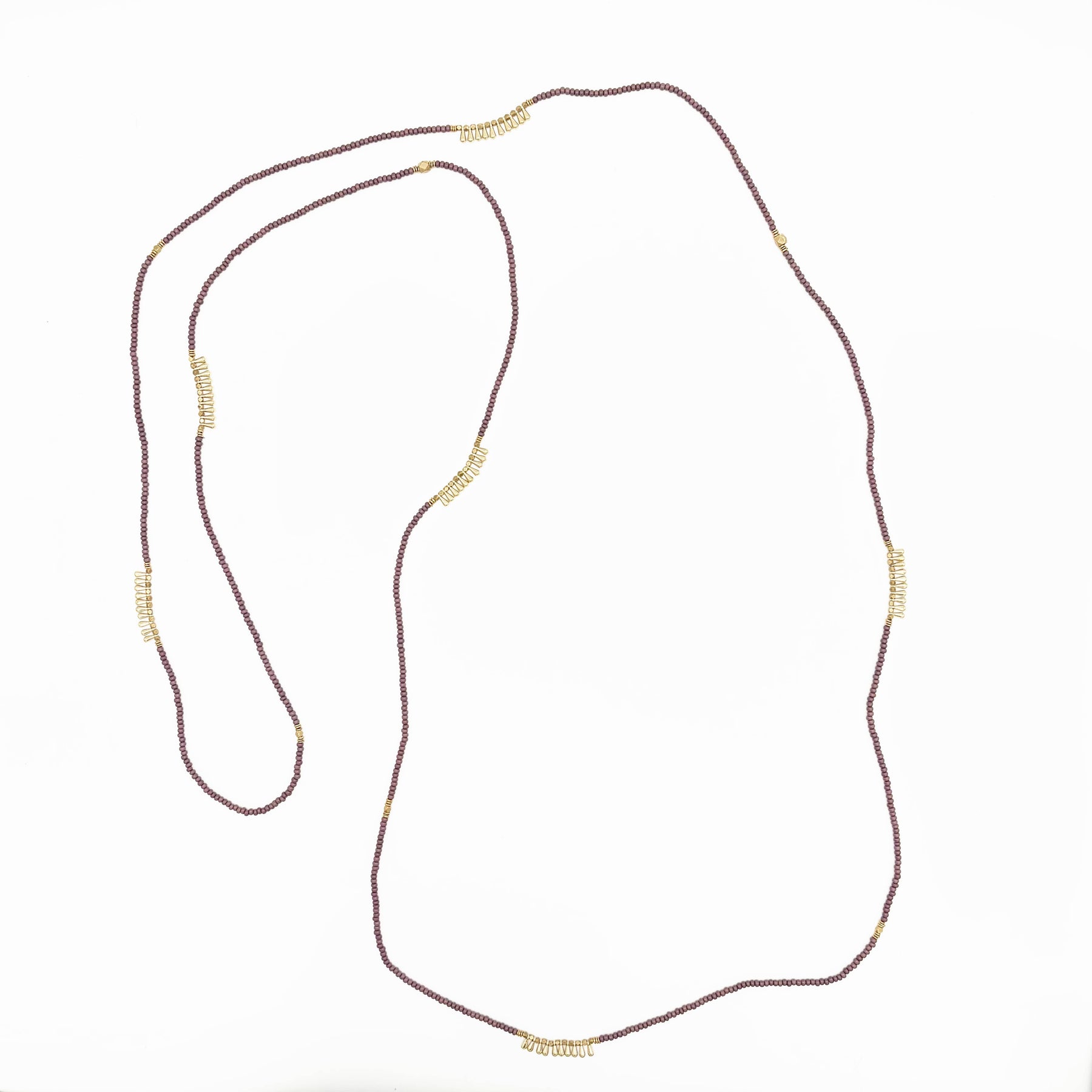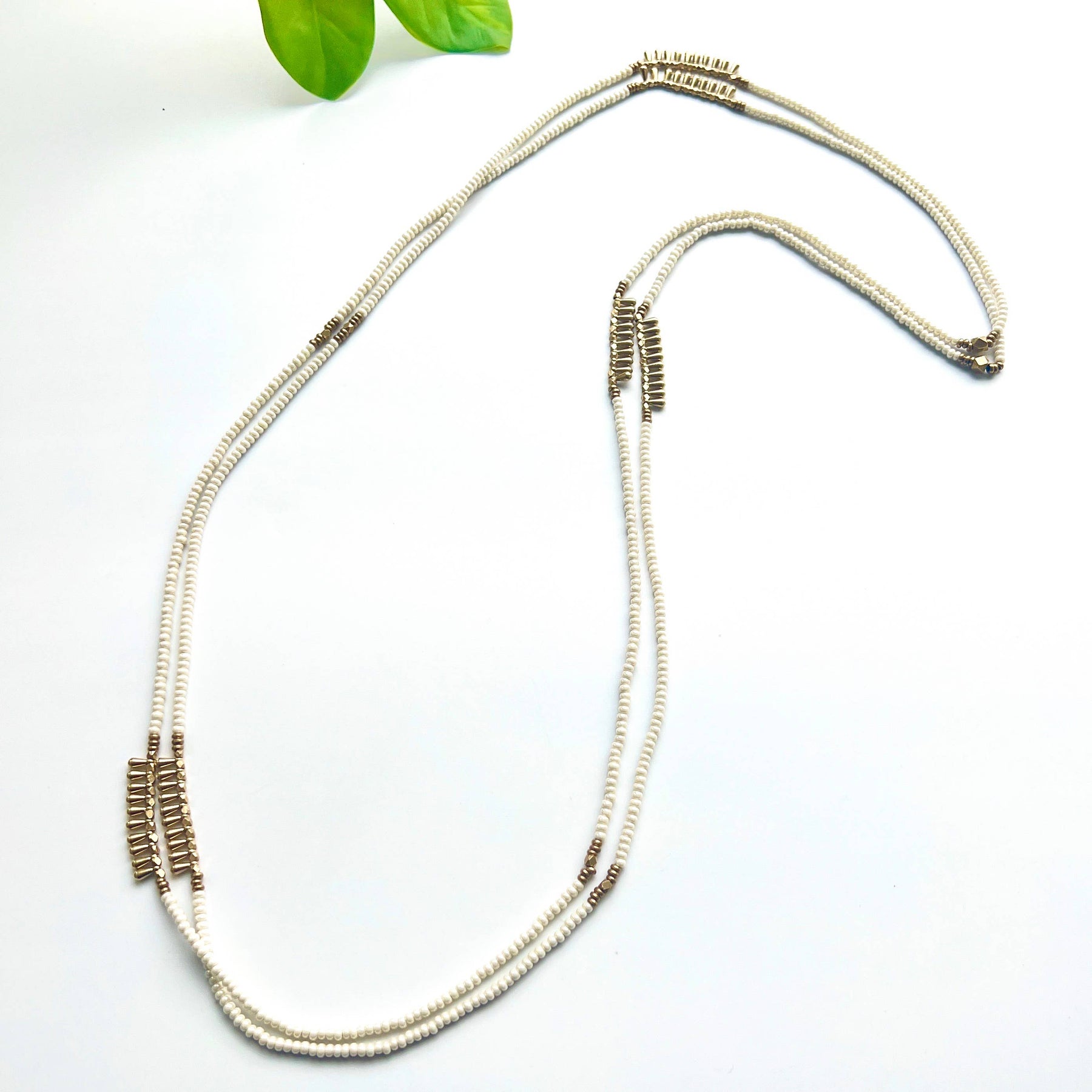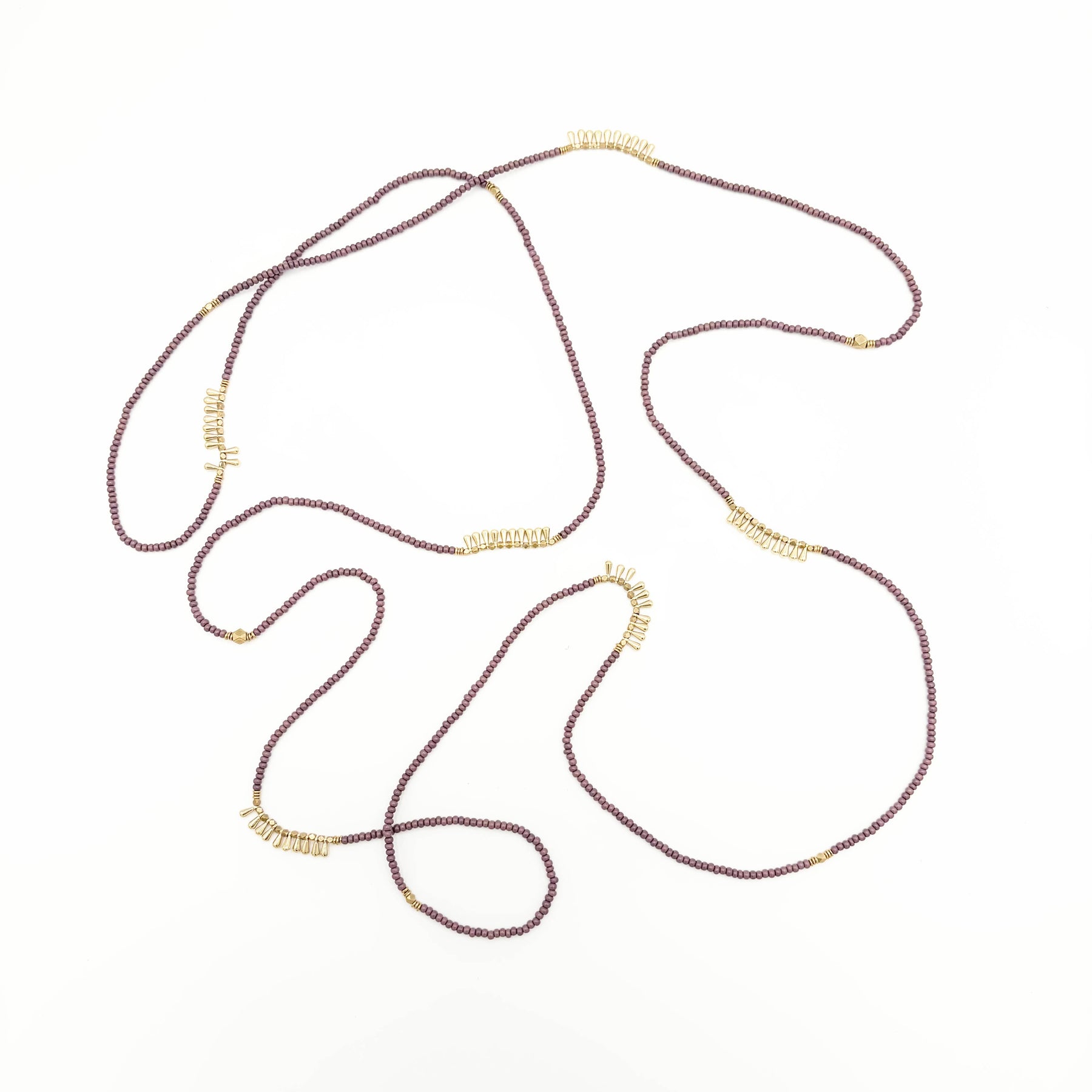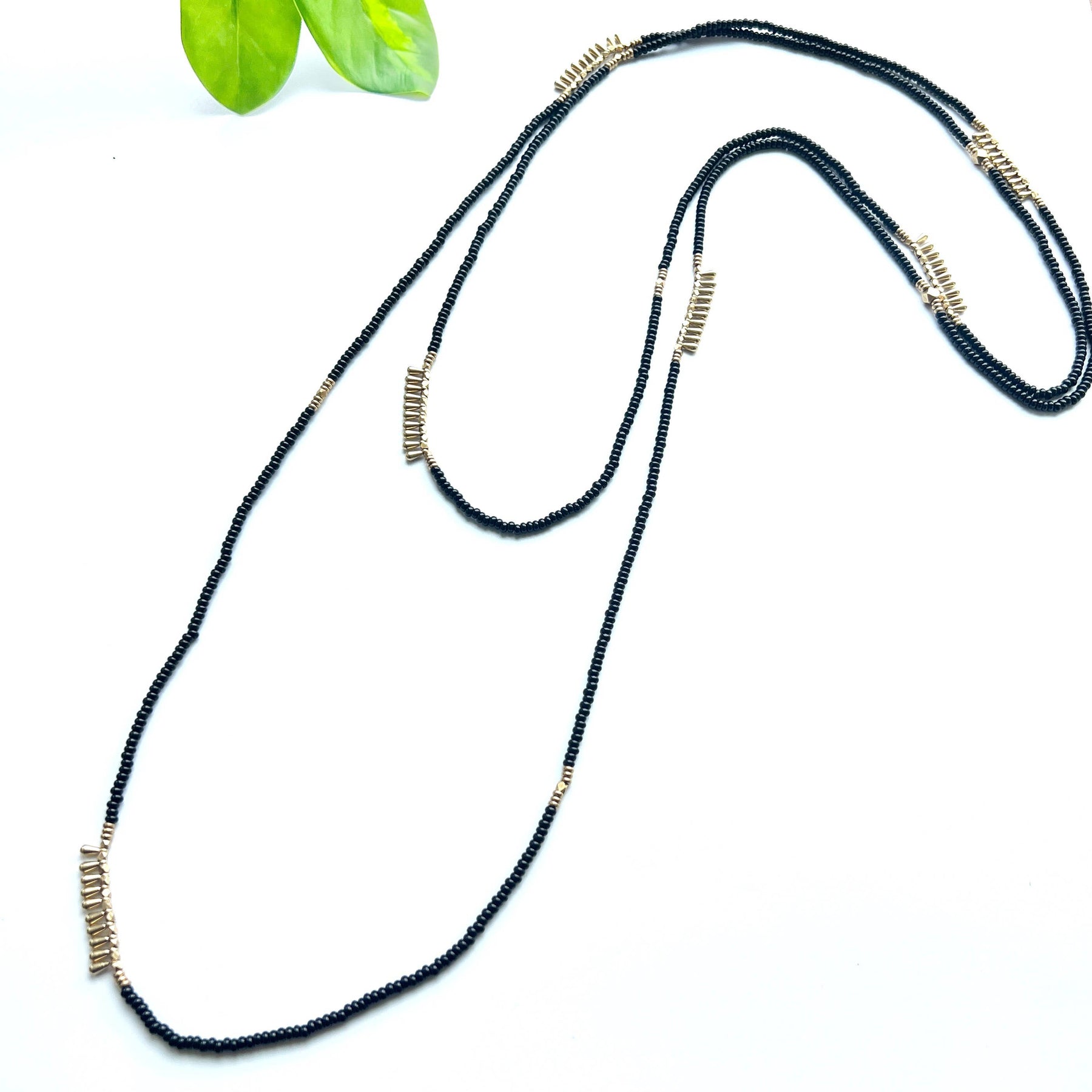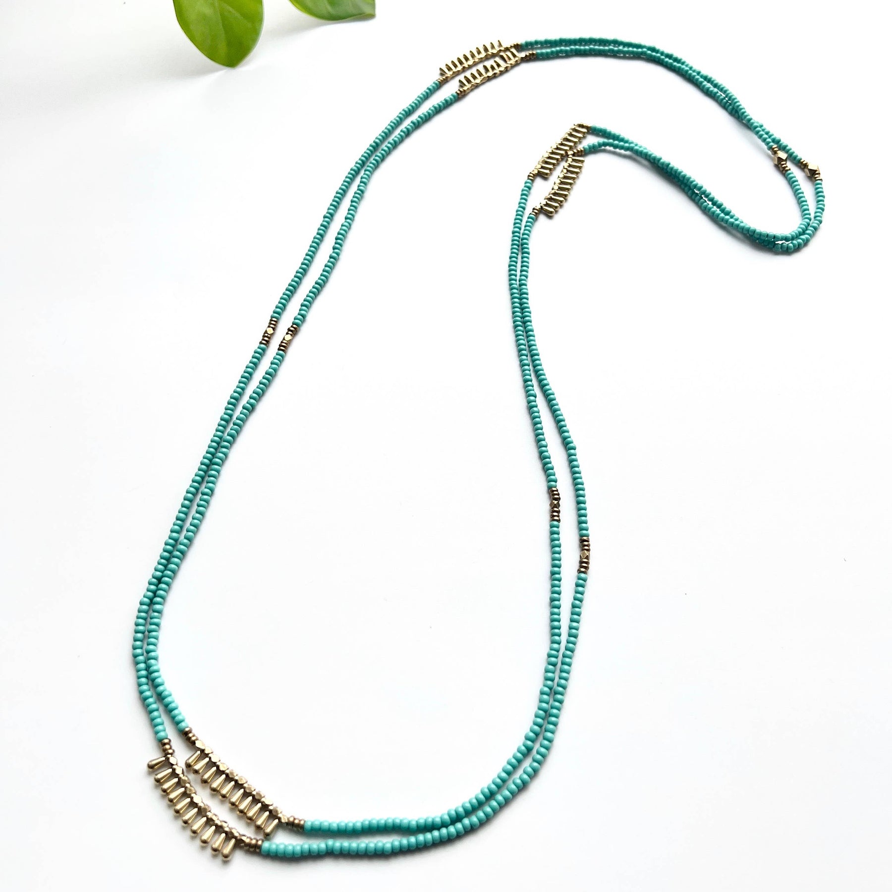 Long beaded layering necklace with droplet accent beads, available in turquoise, black, purple, pearl or all brass.