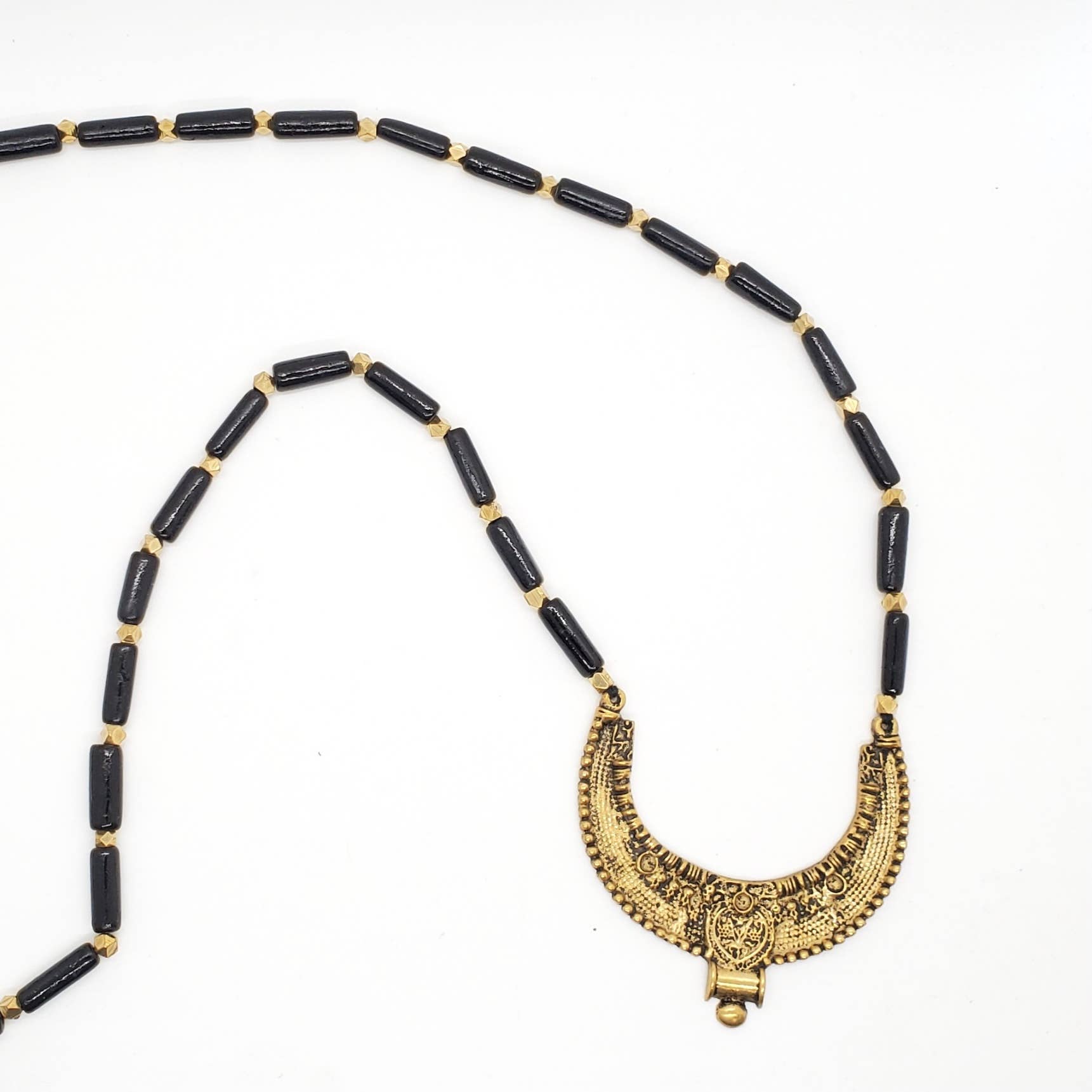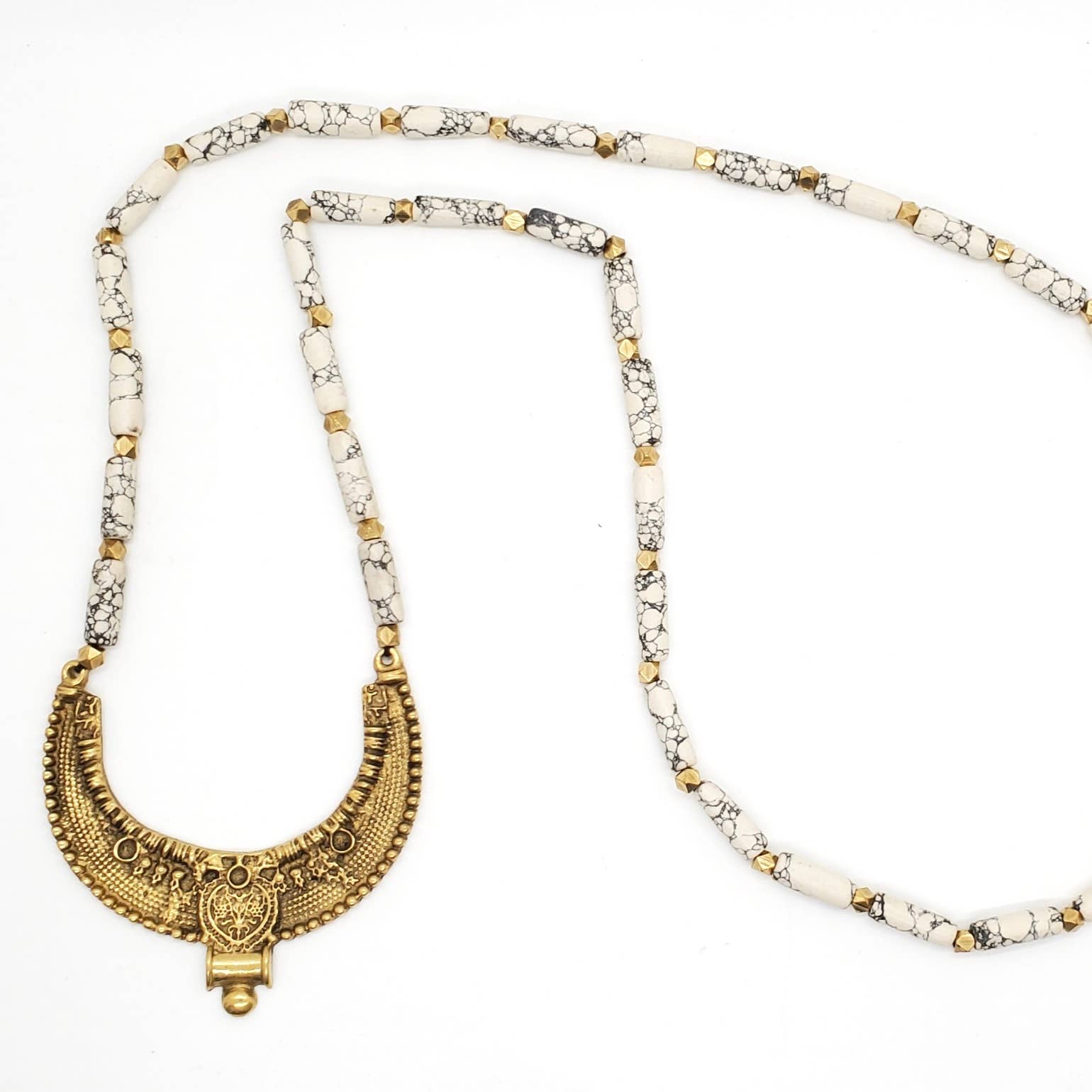 Ceramic and brass beaded necklace with tribal crescent pendant.