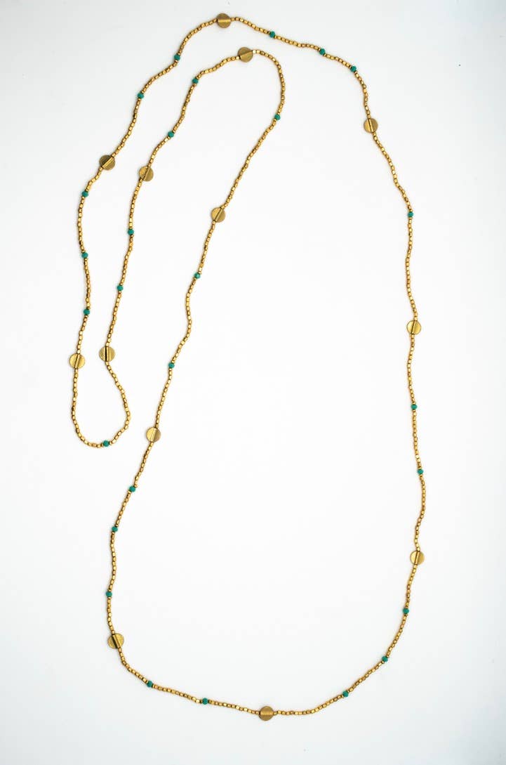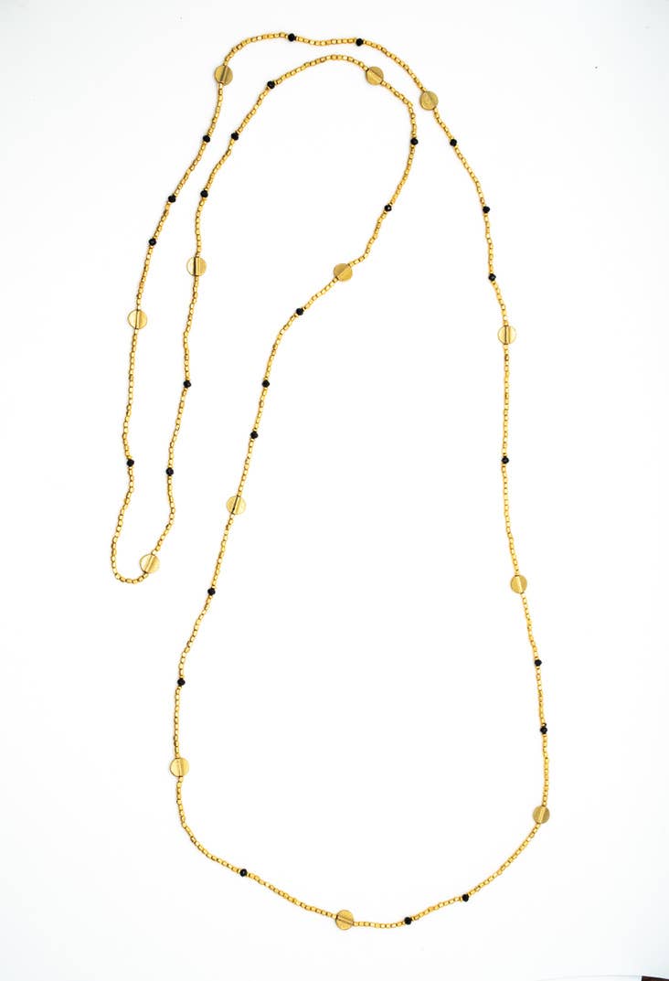 Beaded necklace featuring small brass and circle beads with a pop of color in Turquoise or black. 52 inch length.
