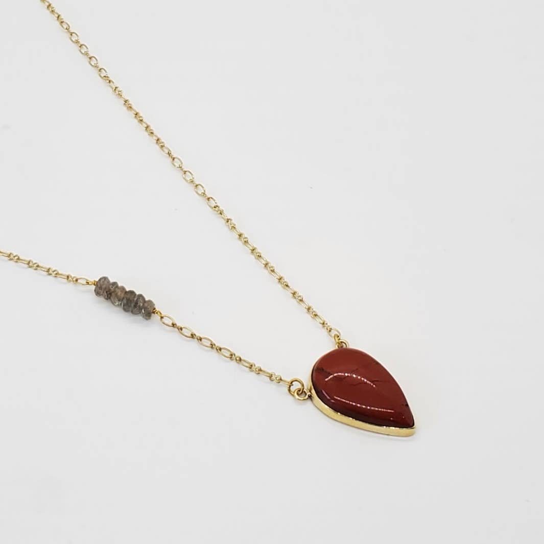 Red Jasper necklace on brass chain with faceted labradorite beads. 18 inch chain + pendant. Please note, stone shapes will vary from teardrop to oval and rectangular (see photos) and stone sizes will vary slightly.