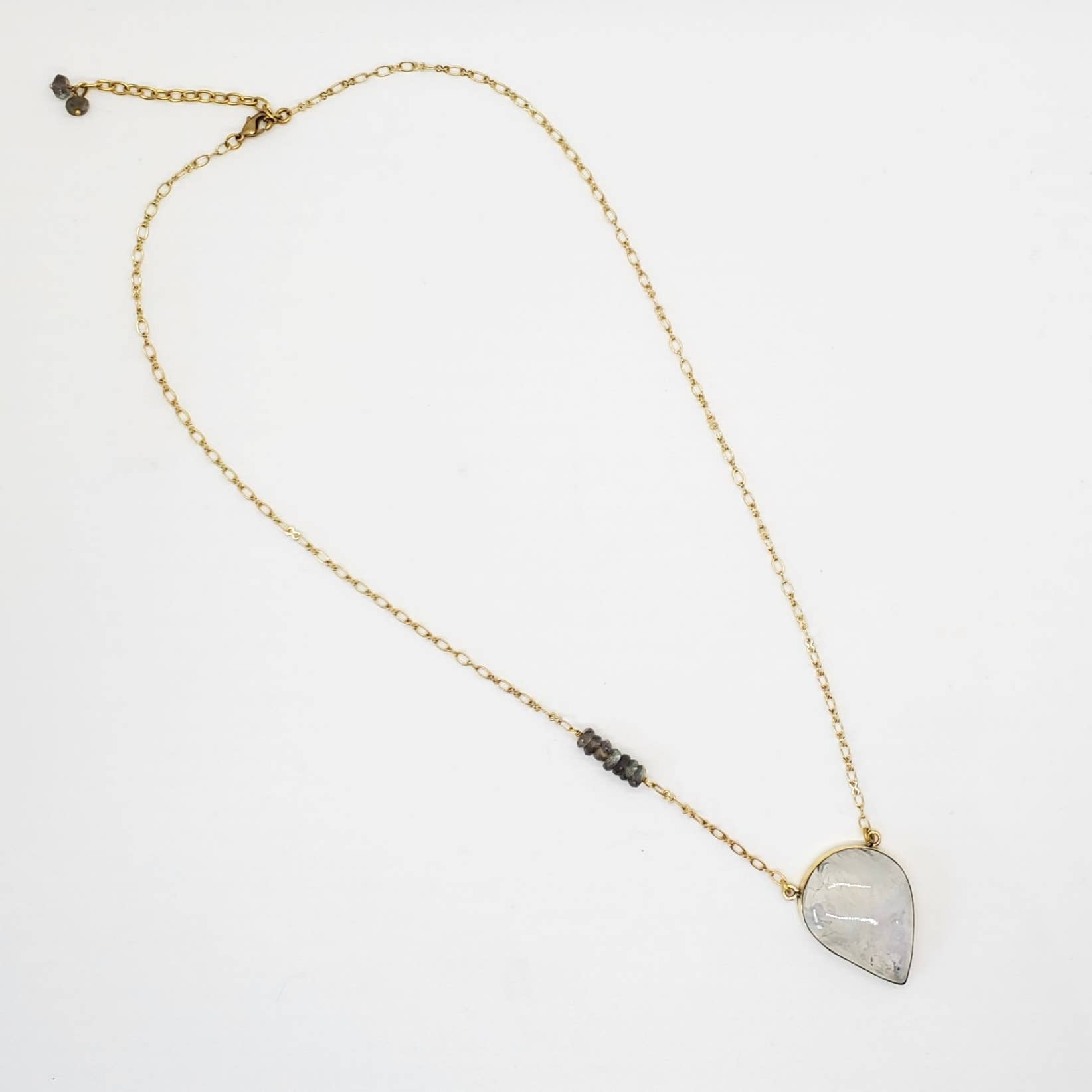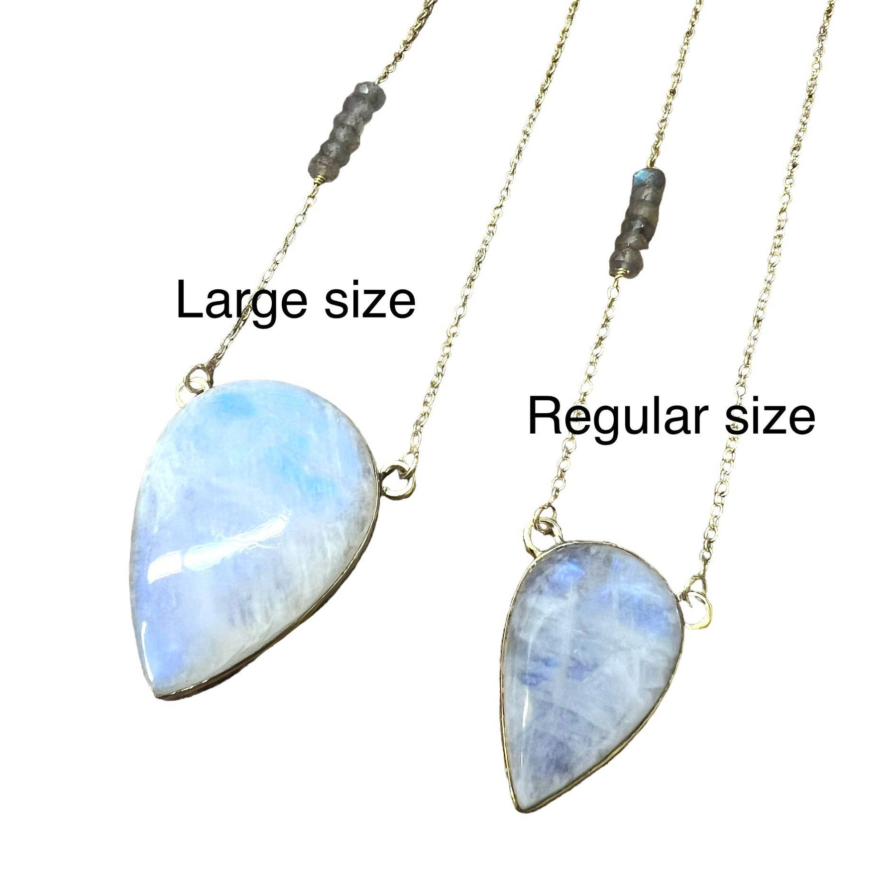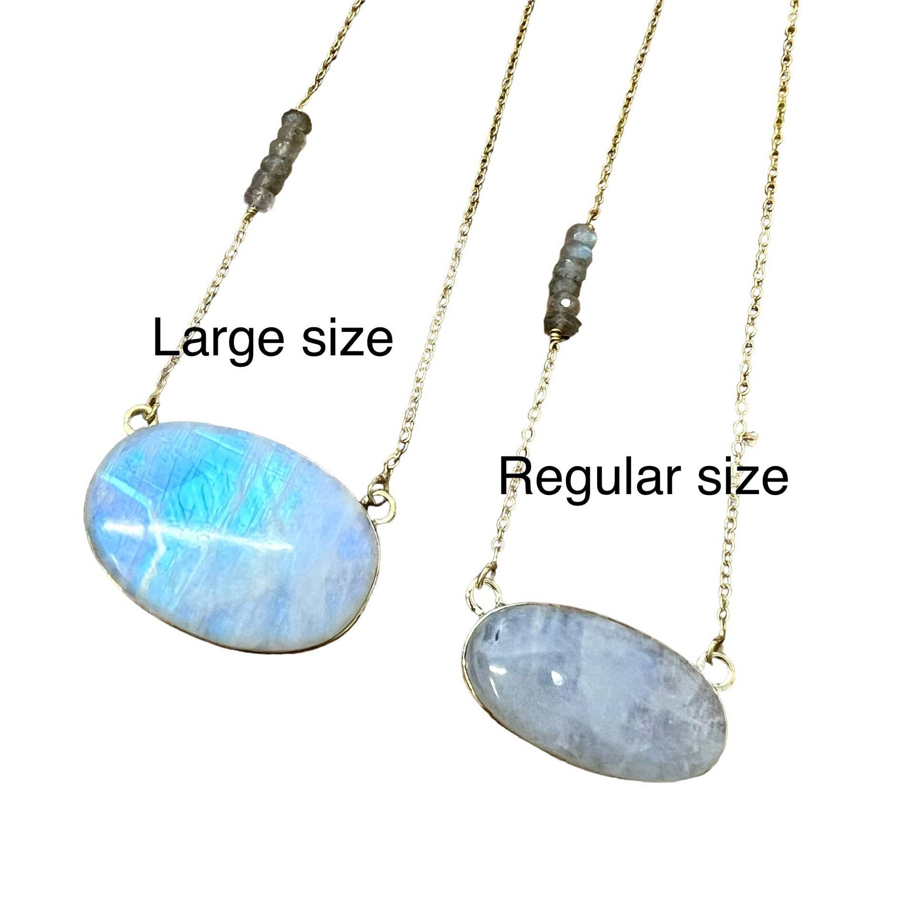 Moonstone necklace on brass chain with faceted labradorite beads. 18 inch chain + pendant. Available in regular size or large stone pendant size. (Large stone size will be a 1-2 inch size high quality moonstone, with suggested retail at $56-68.) Model in photo is wearing regular size.