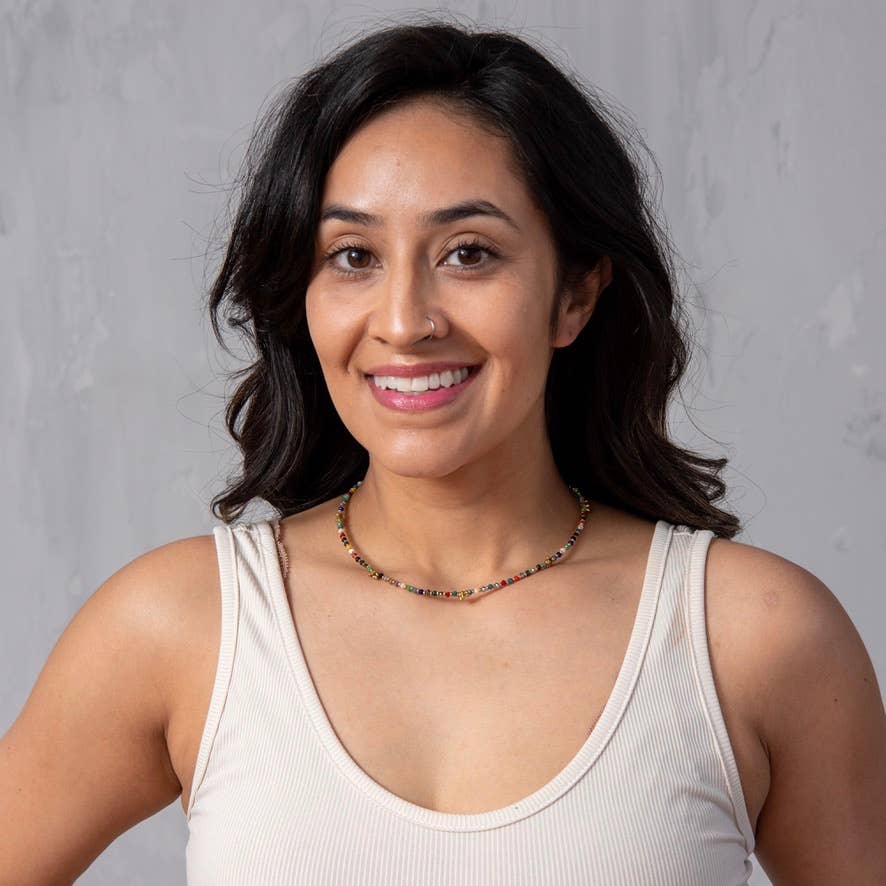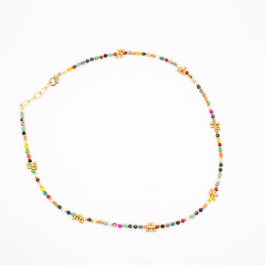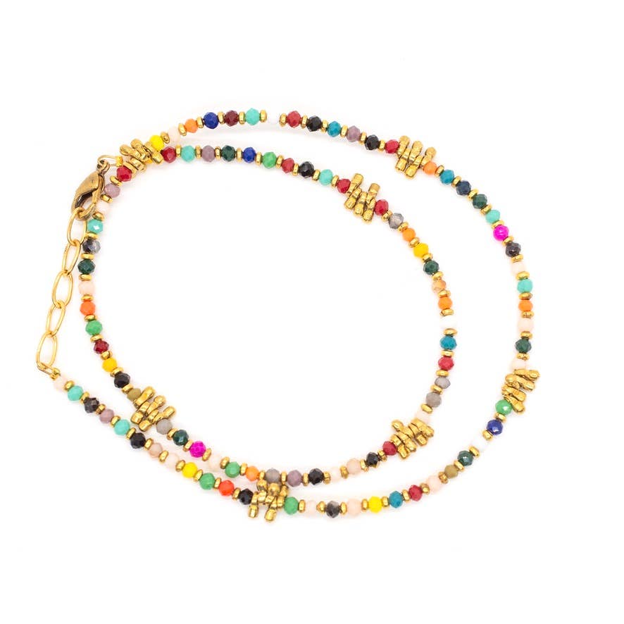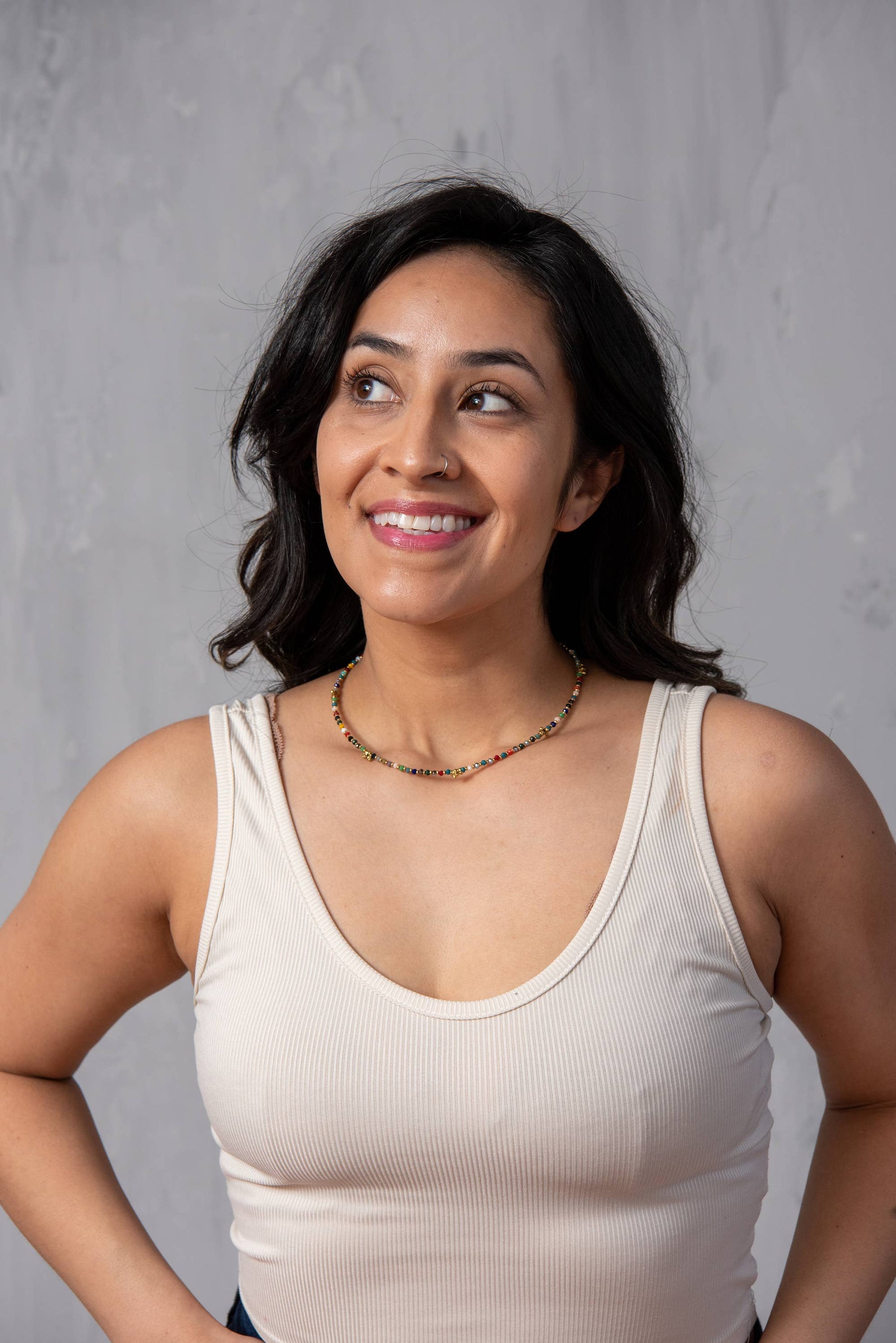 Beaded rainbow necklace featuring funky brass droplet accent beads. Perfect for yearlong Pride!