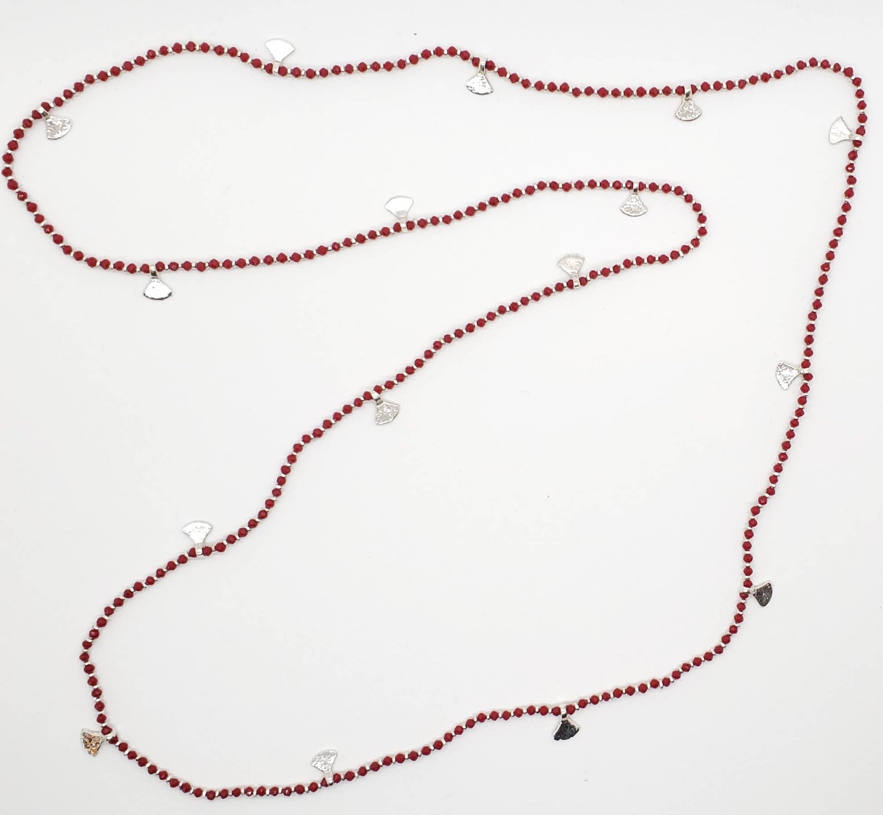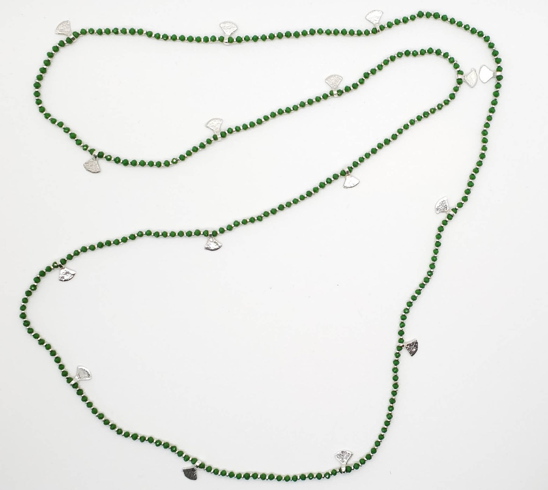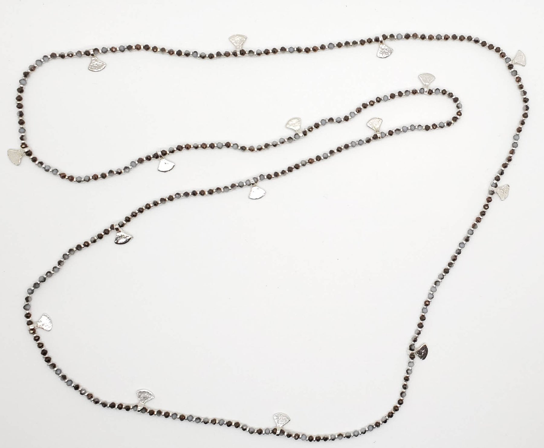 Silver beaded necklace with fan decorations.