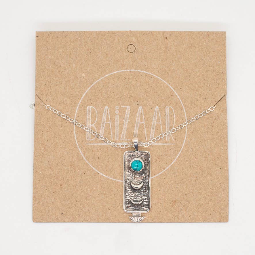 Sterling silver necklace with crescent moon design and turquoise stone. Chain measures 18 inches.
