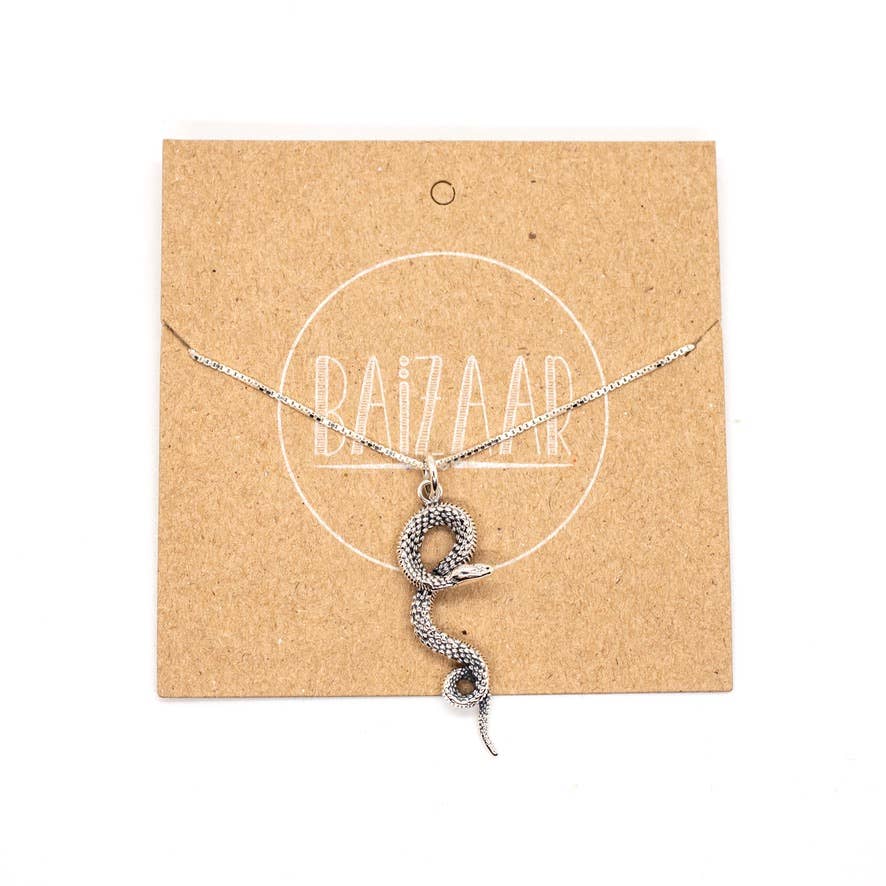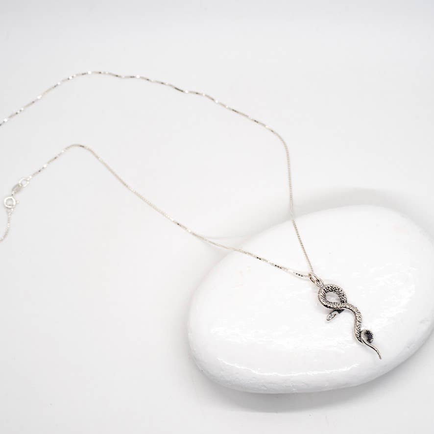 Sterling silver necklace with snake pendant on delicate box chain. Chain measures 18 inches.
