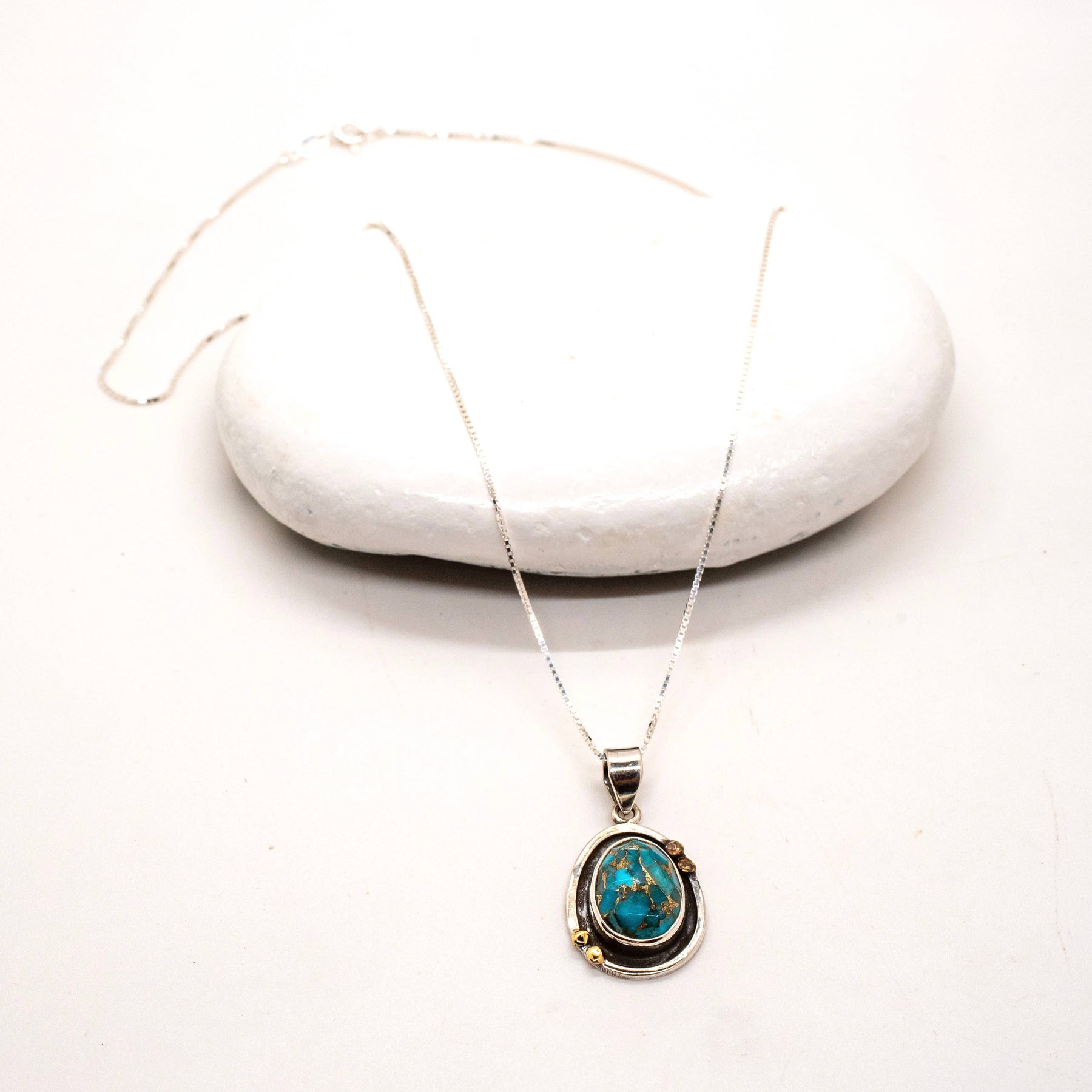 Sterling silver and copper turquoise necklace featuring beautiful oxidized detail and brass accents on a sterling silver box chain, 18 inches long. Pendant is 1" by .75".