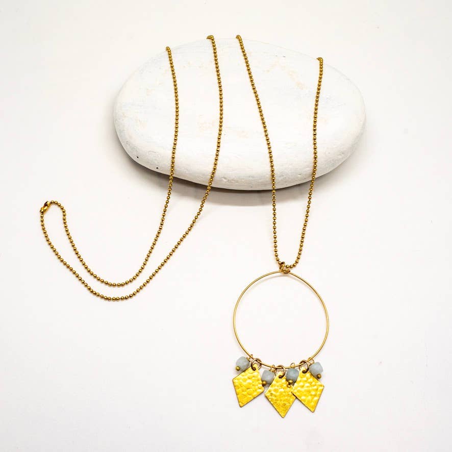 Brass necklace with natural faceted stones and hammered diamond bead. Available in Lapis, Aquamarine, Amethyst or Tourmaline. 30 inch chain length.