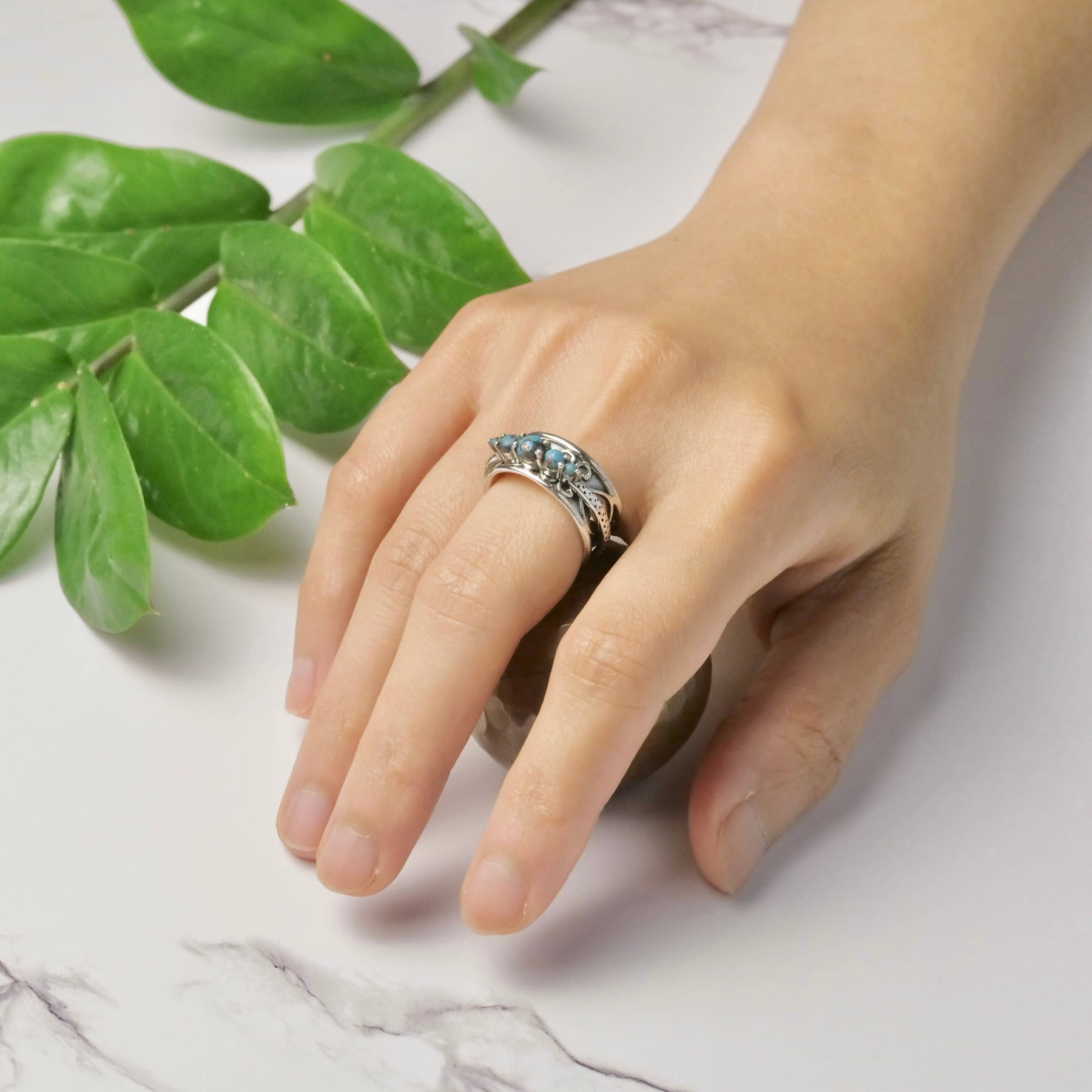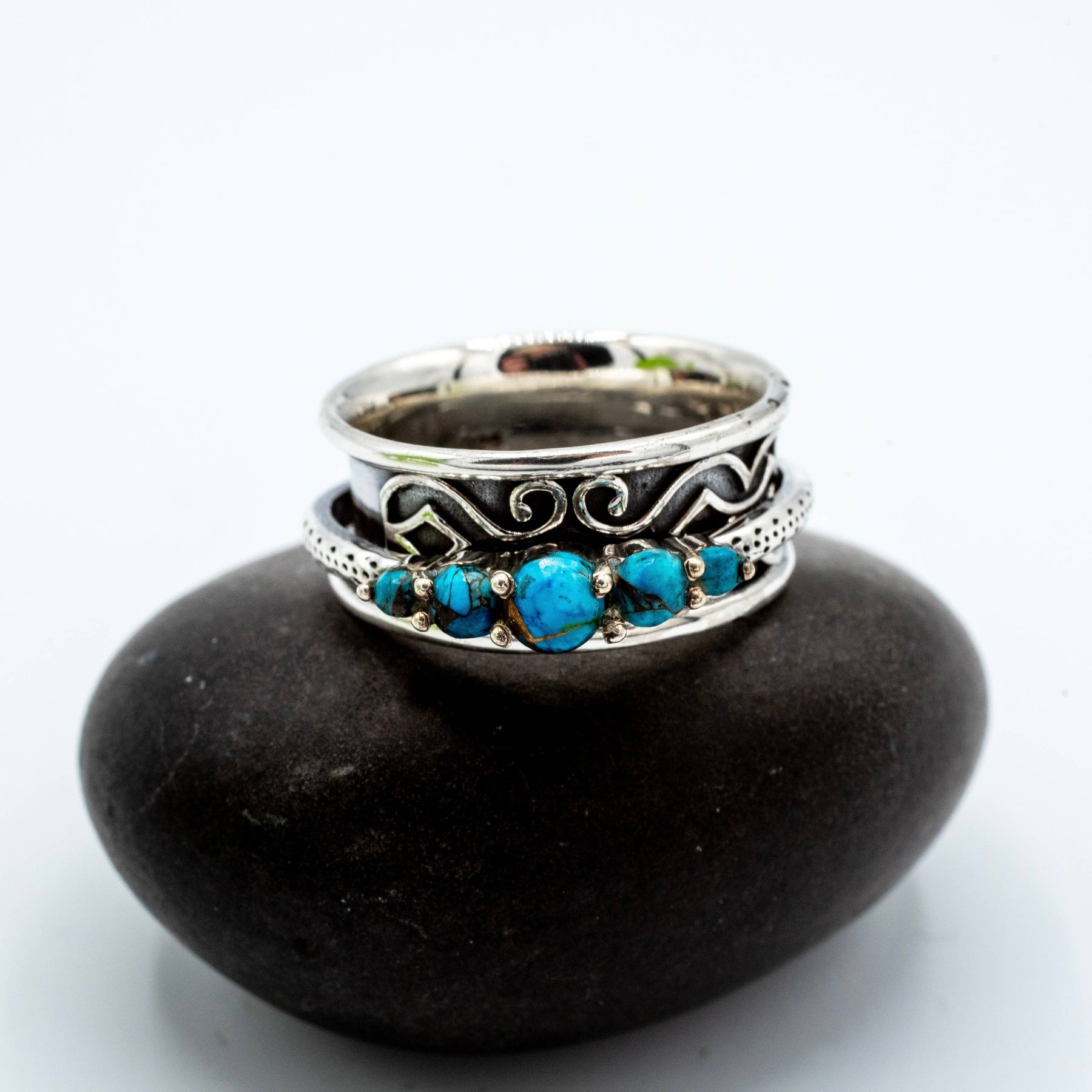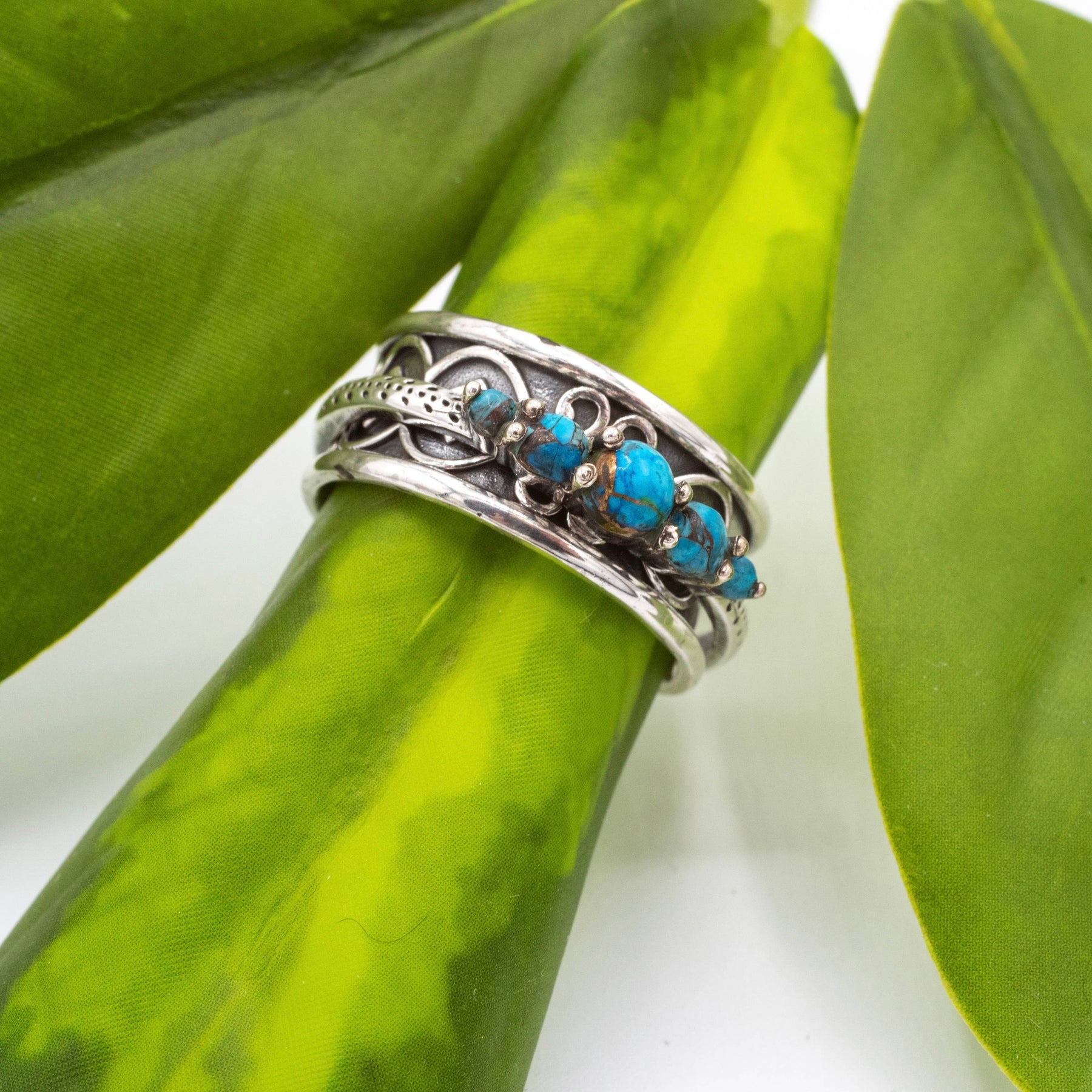 Sterling silver spinner ring with decorated design and band with 5 faceted copper turquoise stones, available in sizes 6-12.