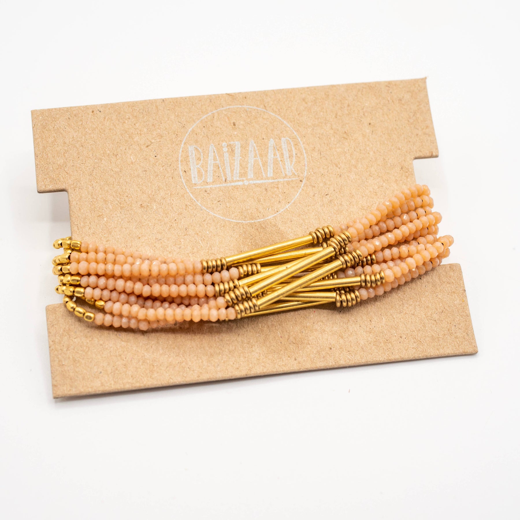 Beaded bracelet featuring cut glass and brass tube bead. Great layered bracelet look! Available in Black, Blue, Turquoise and Beige.