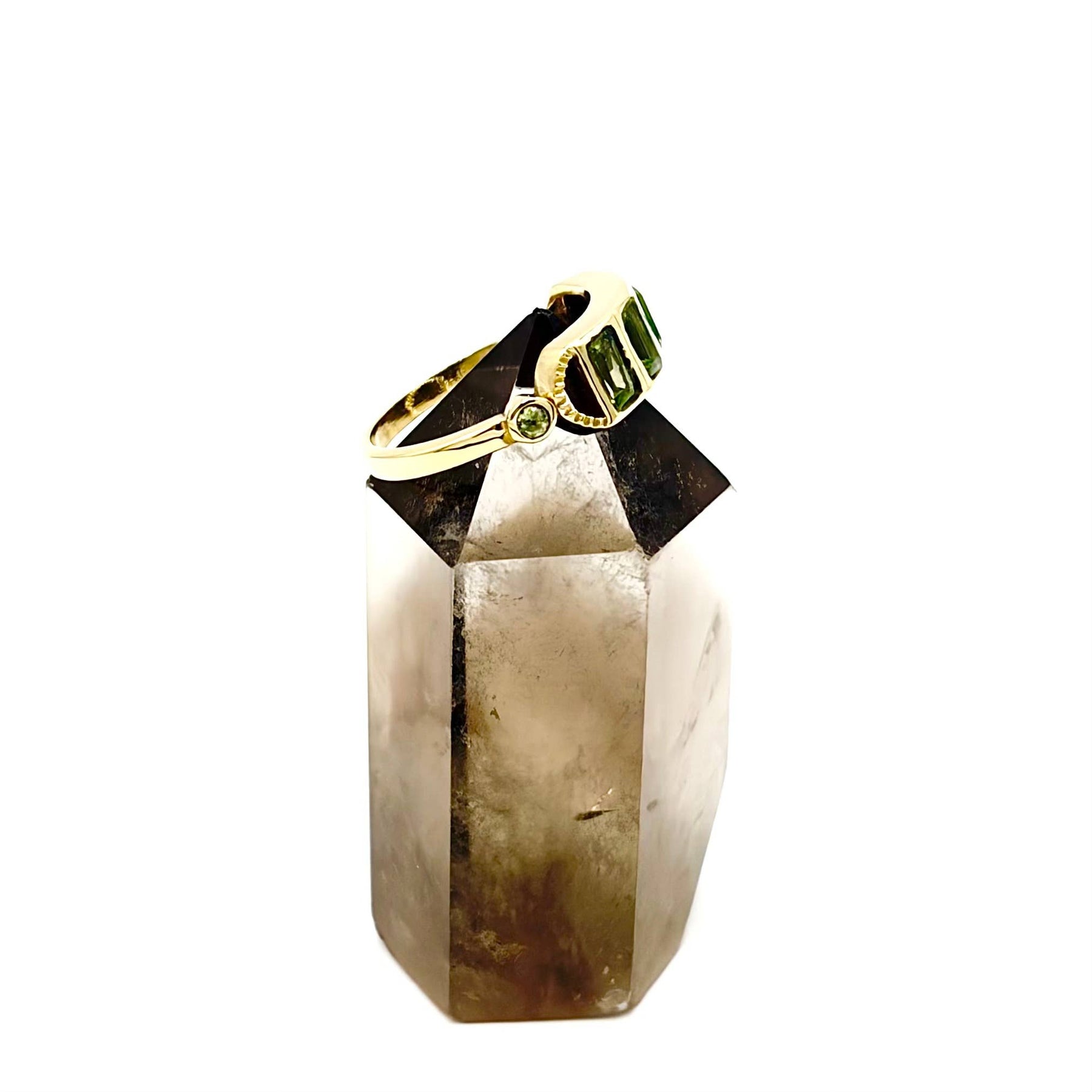 Brass ring featuring unique rectangular bar design with 4 stunning faceted Peridot stones and two tiny side stones, available in sizes 5-9.