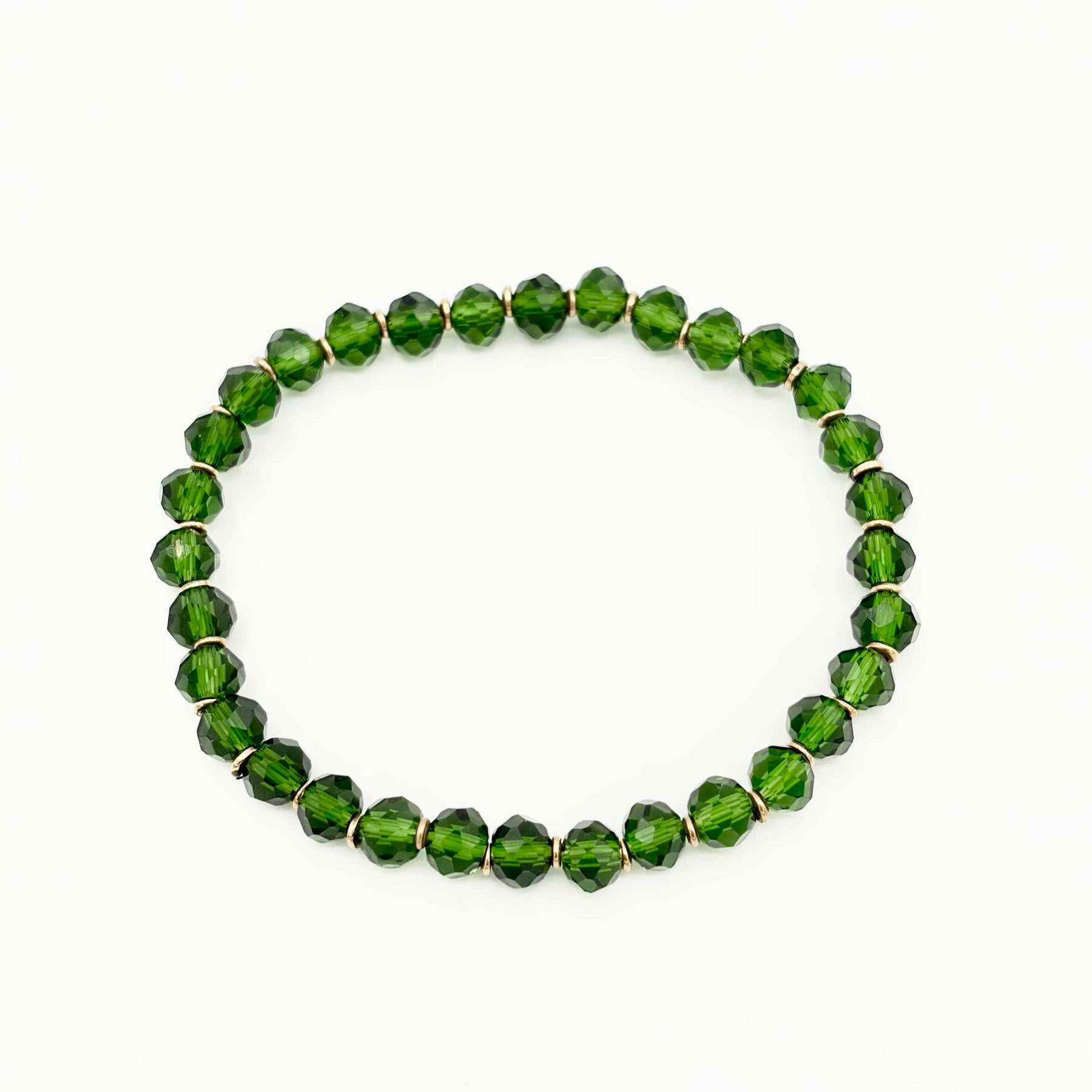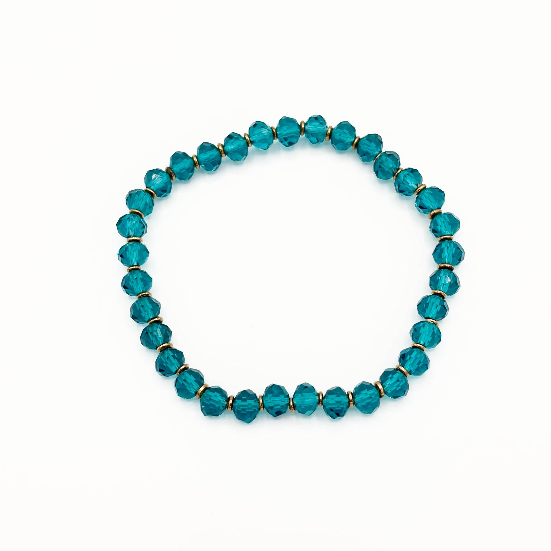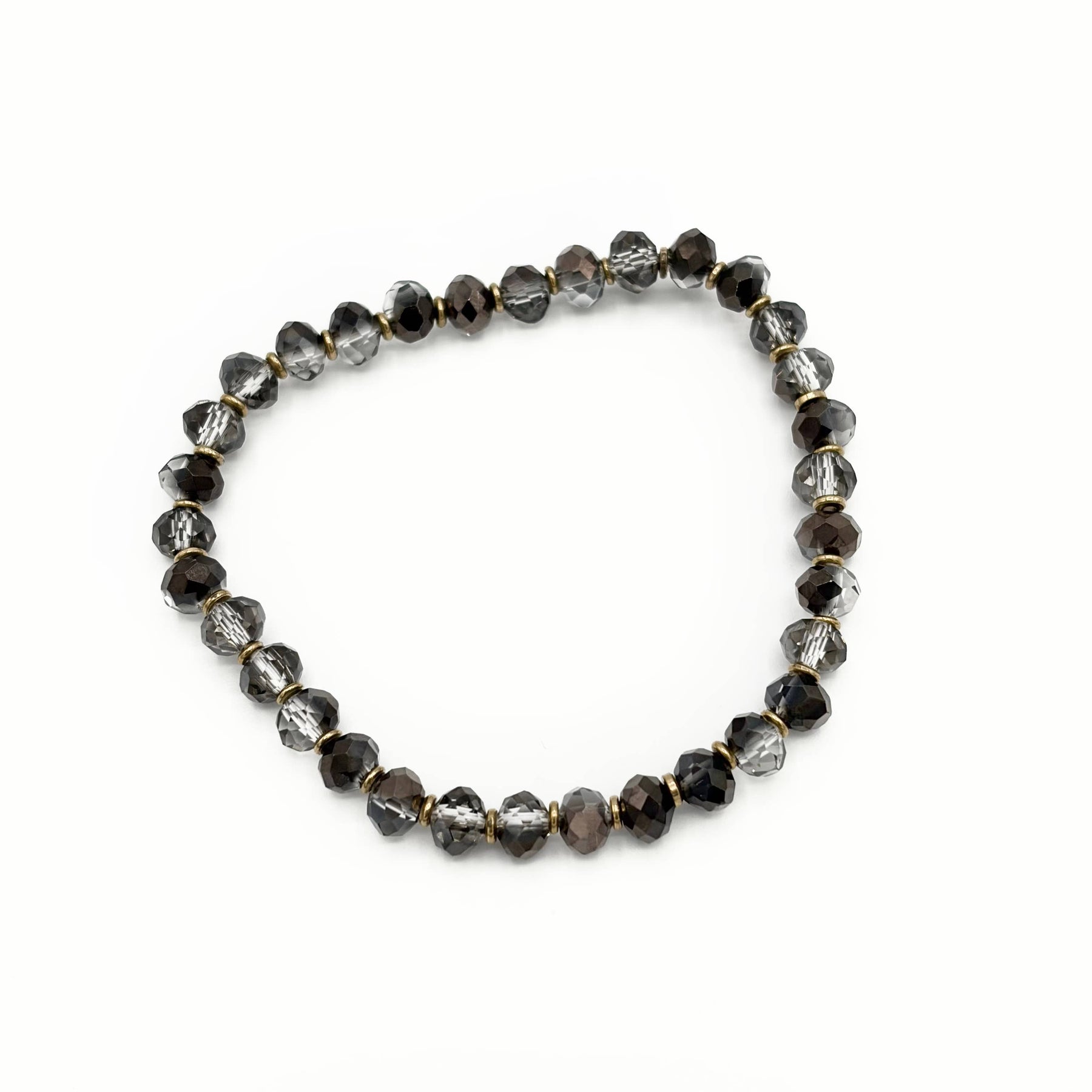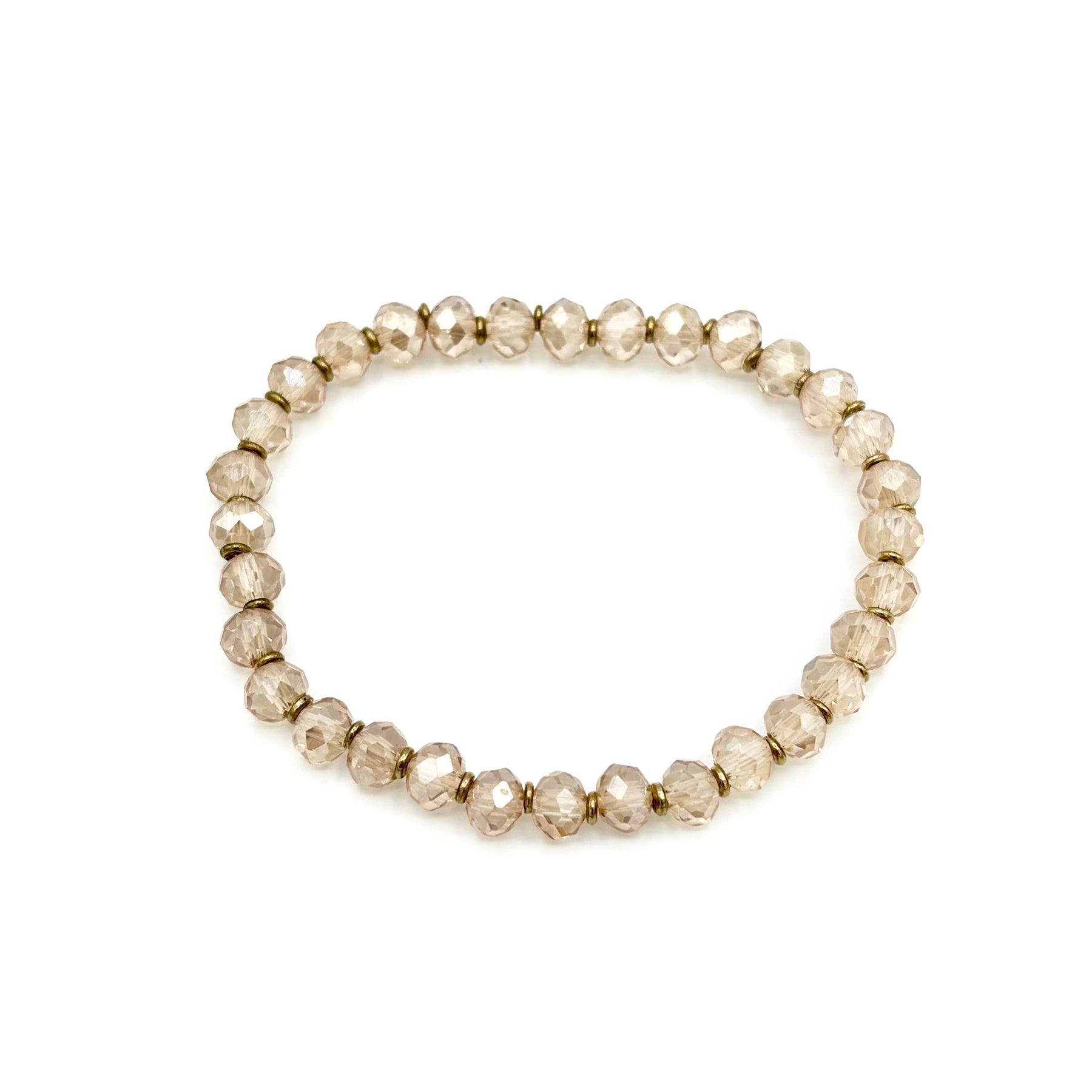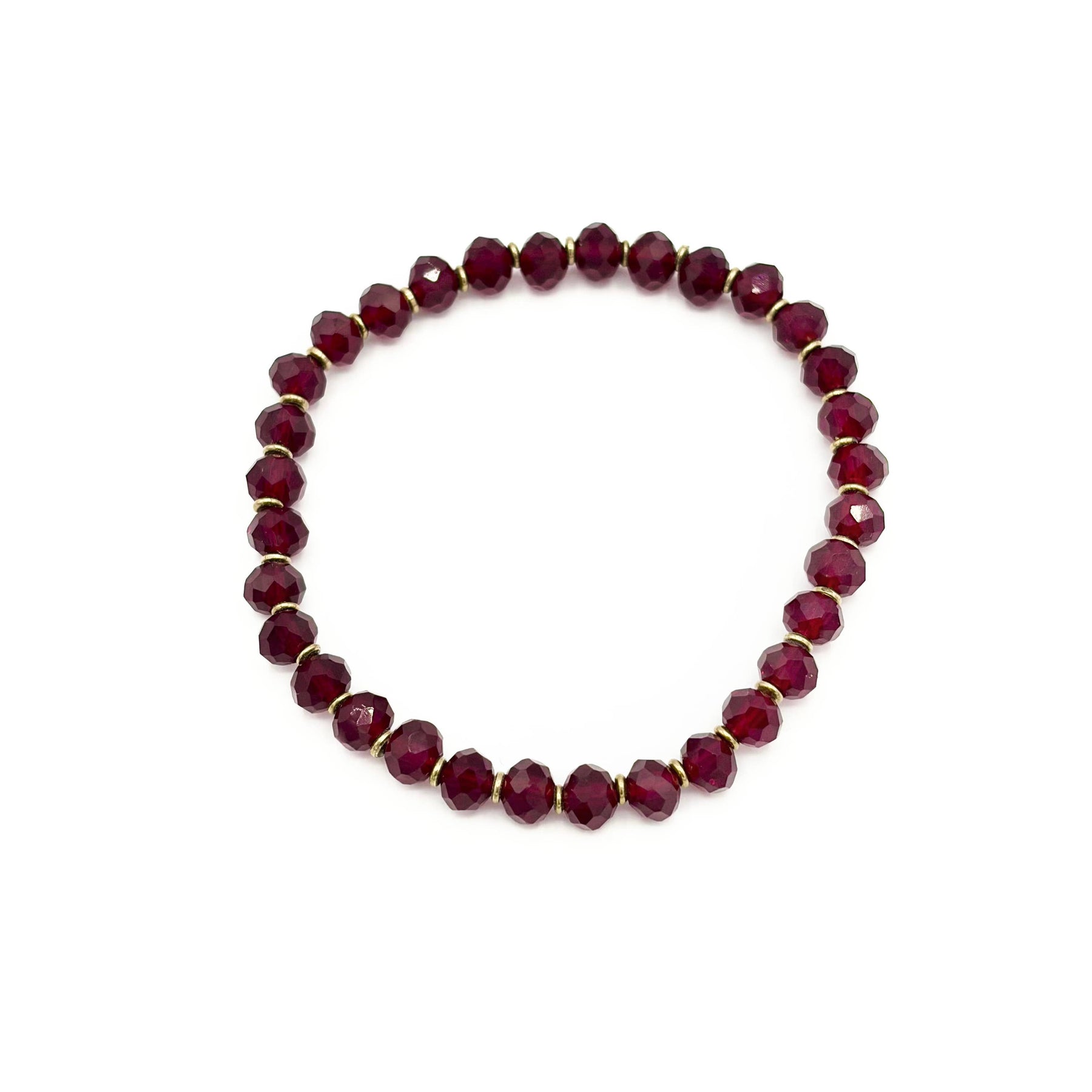 Beautiful cut glass and brass bracelet on elastic, perfect for stacking. Comes in red, blue, green, smokey, amber and beige colors.