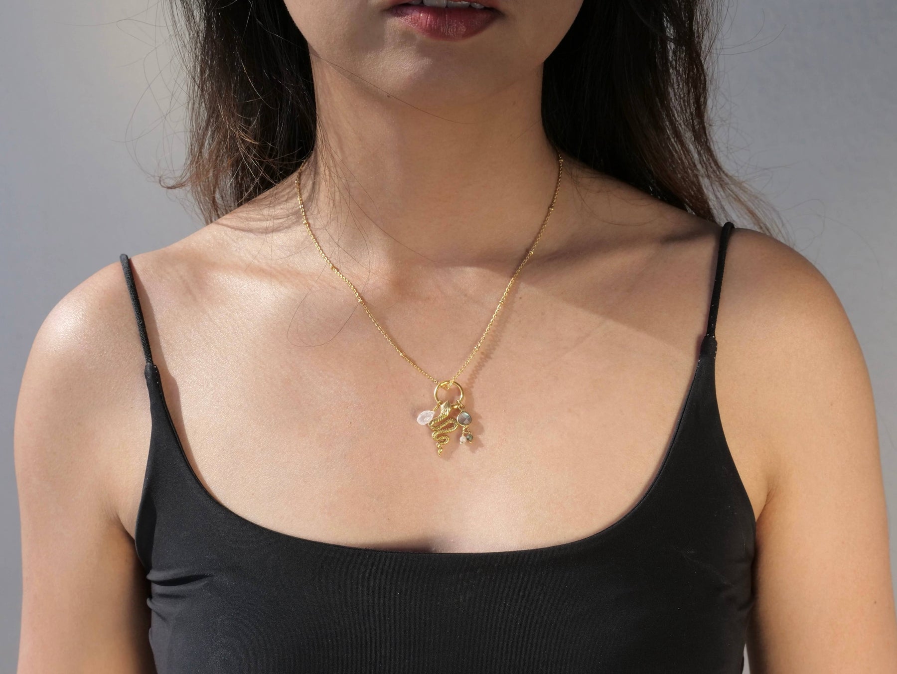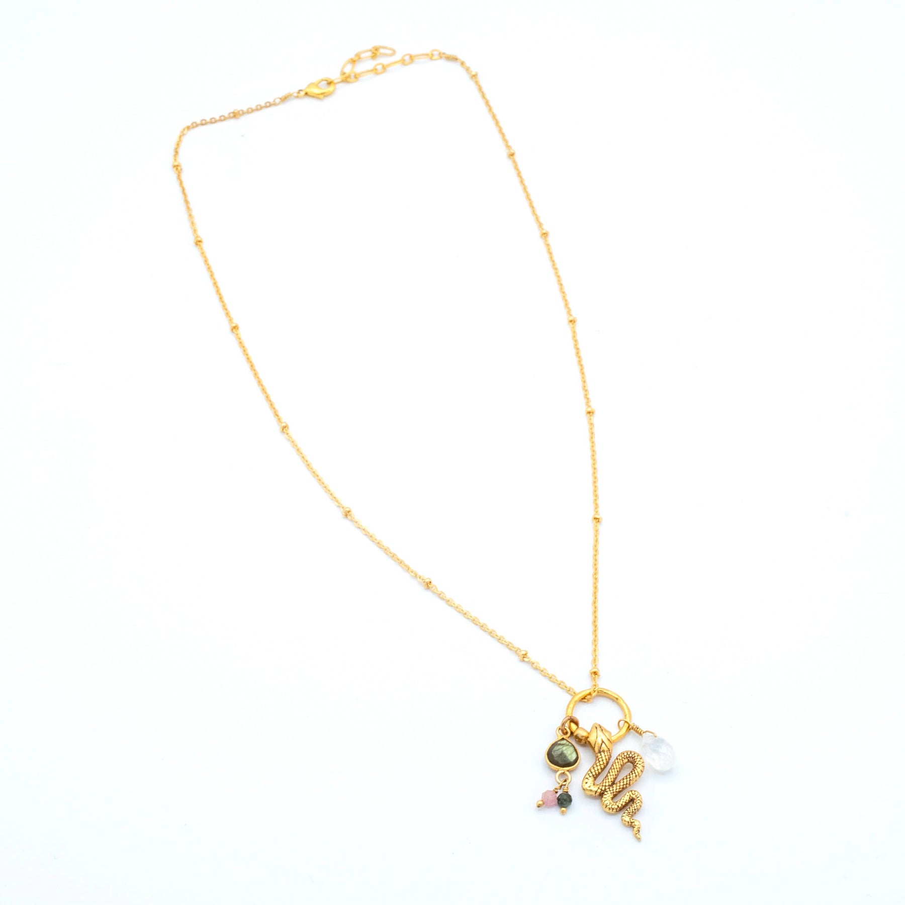 Gold plated brass snake & gemstone charm necklace featuring beautiful serpent pendant, faceted moonstone teardrop and faceted Labradorite charm with stone dangles.
