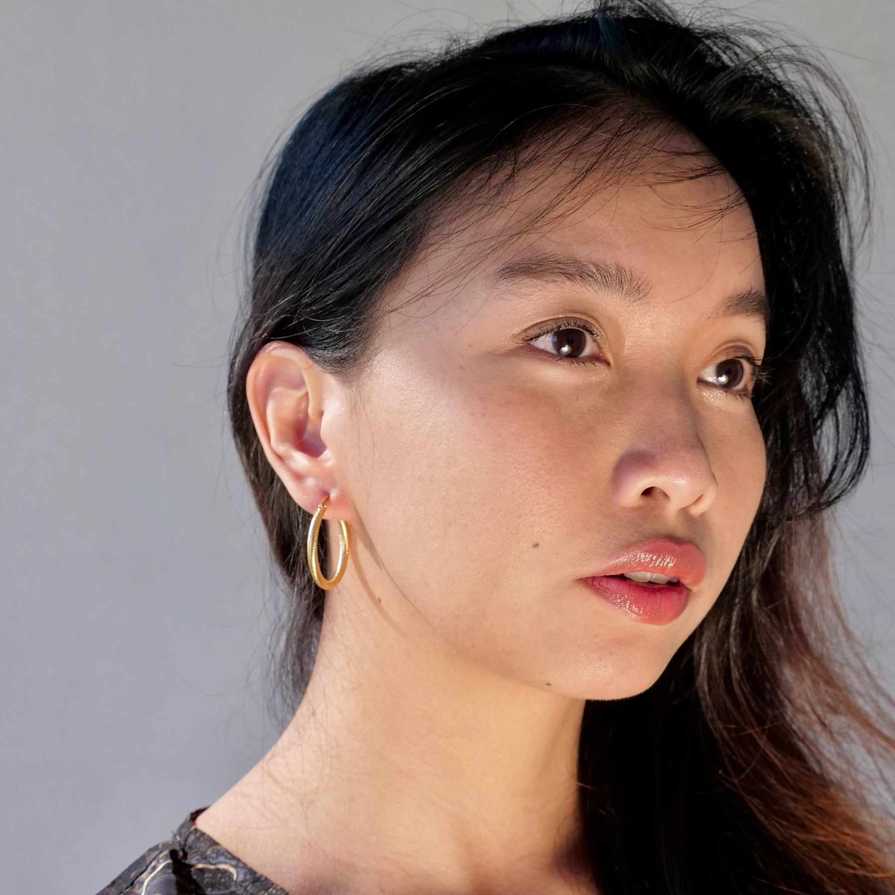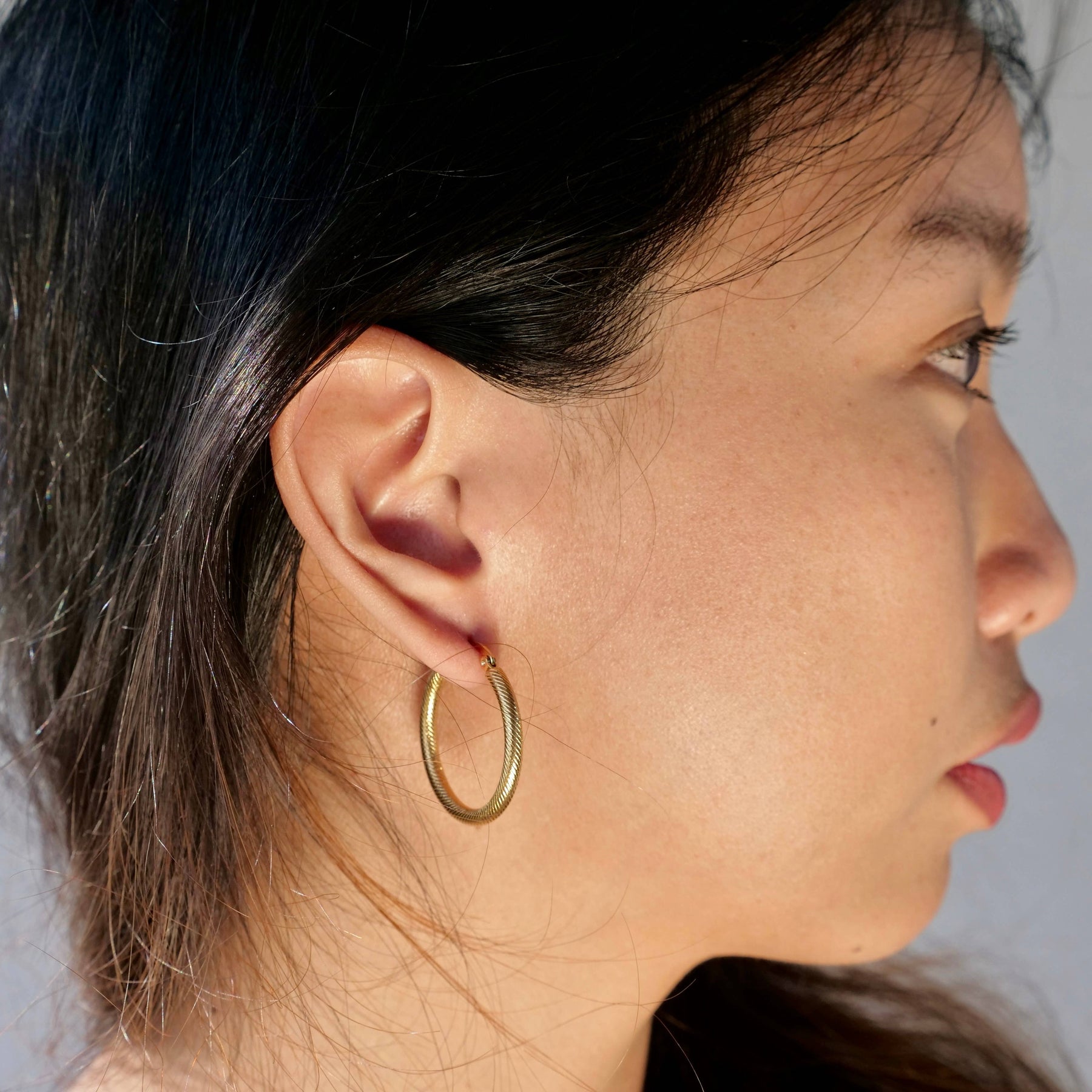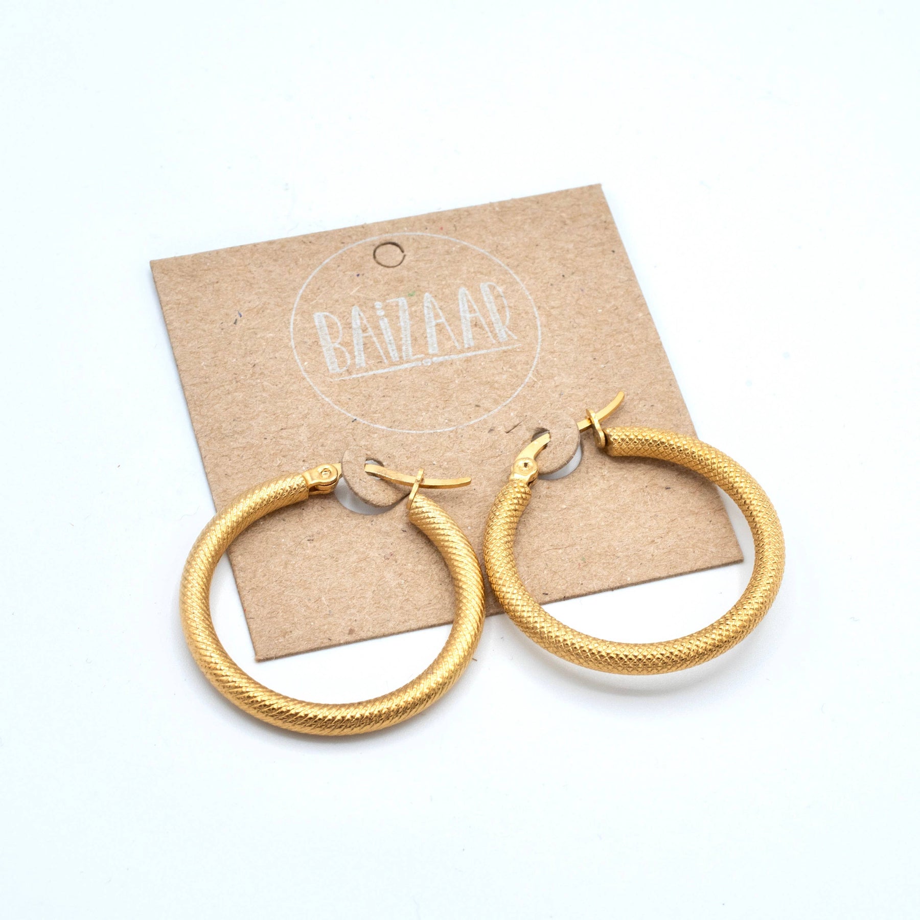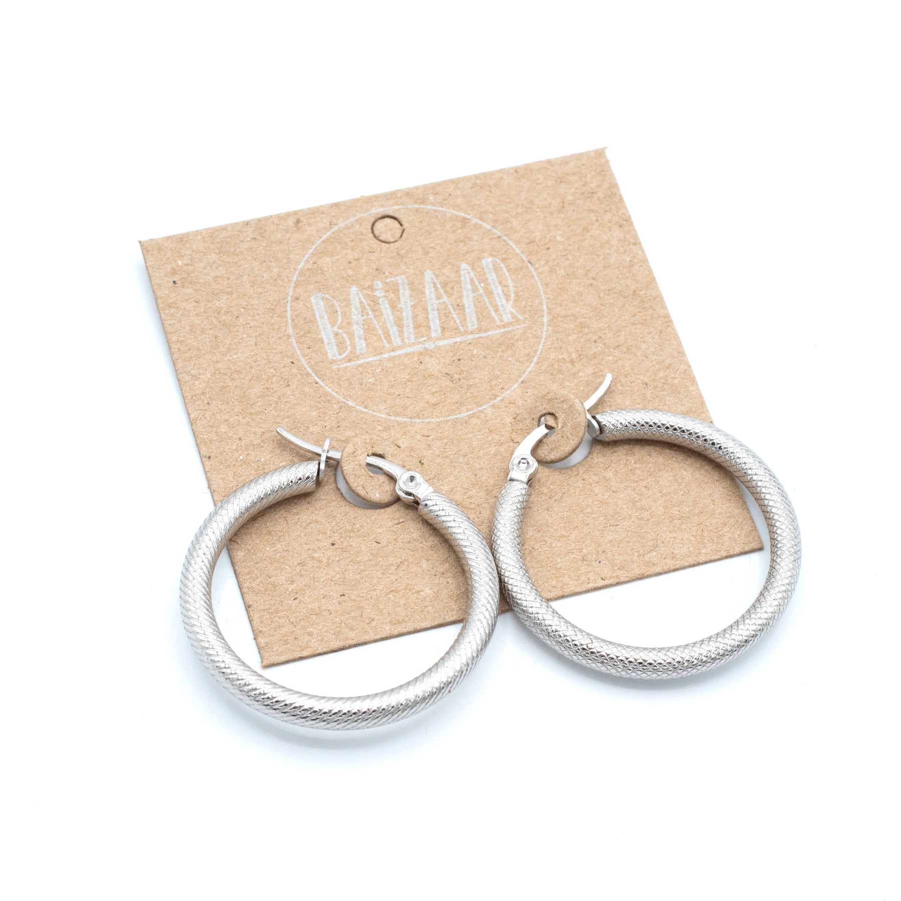 Stainless steel snake print hoop earring available in pure surgical stainless steel and gold plated stainless steel. The perfect medium sized hoop to step up any outfit!