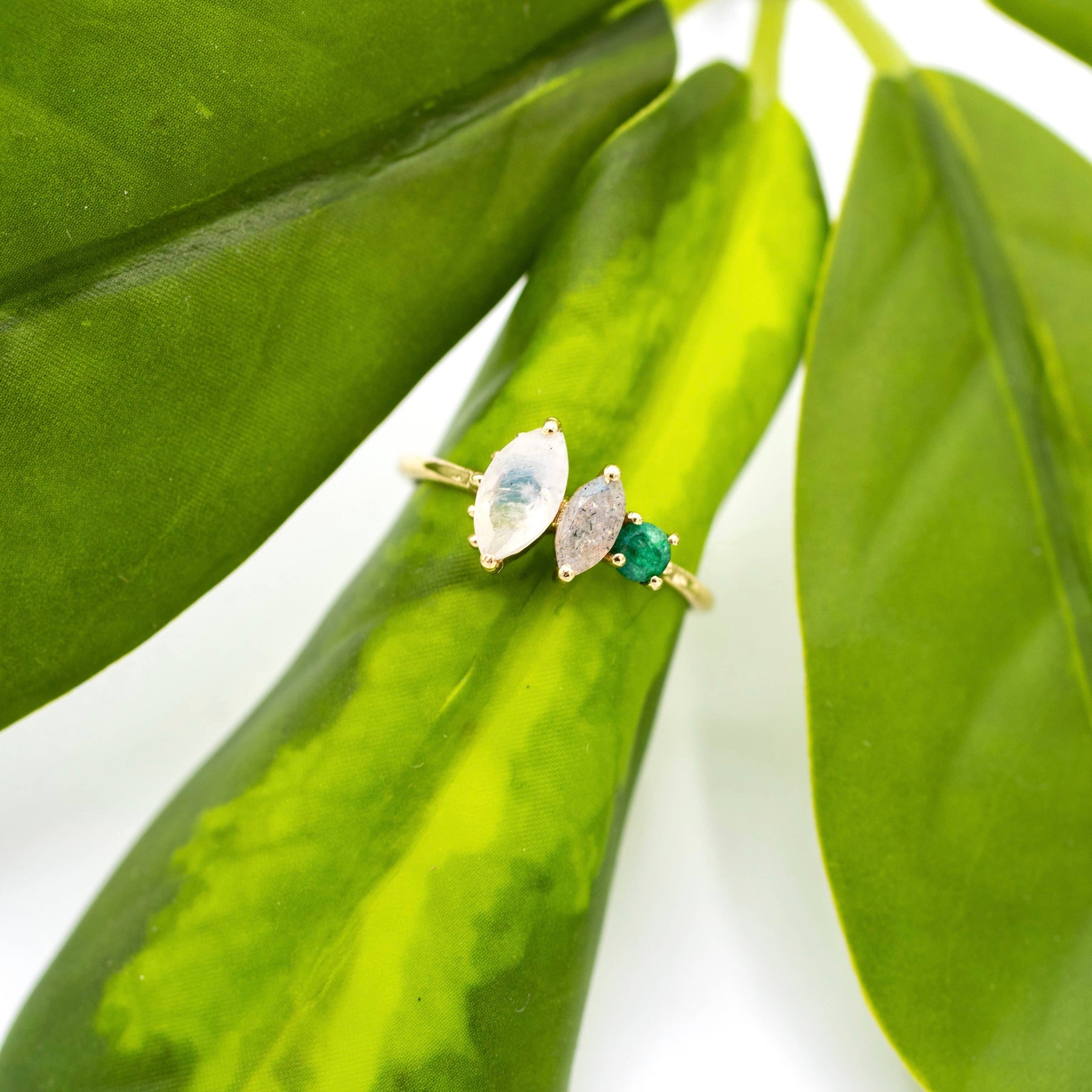 Brass ring featuring 3 beautiful faceted stones, Moonstone, Labradorite and Emerald. Available in sizes 5-10